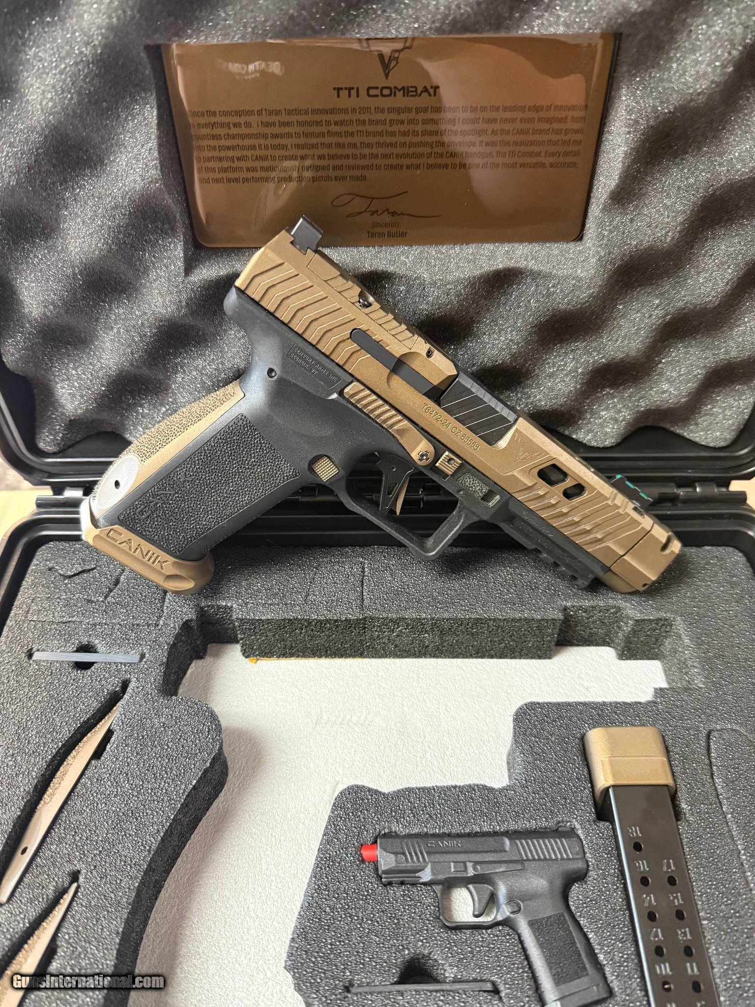 Description: Guns Listing ID: 579533 COMES WITH FACTORY BOX TWO MAGAZINES IN VERY GOOD CONDITION (SEE PHOTOS) SOLD Manufacturer: CANIK Model: TTI Combat Caliber Info: 9MM LUGER (9X19 PARA) Condition: Used - Non-Certified Barrels: 4.6" BARREL Action: SEMI AUTOMATIC Finish: BRONZE Weight: 1.8 LBS. |