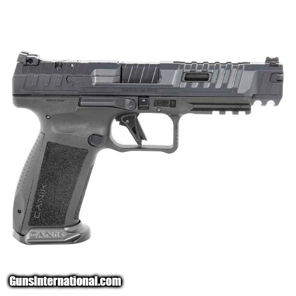 Description: Canik pistols have been impressing American handgun shooters since importation of them from Turkey began back in 2012. Since then, Canik pistols have continued to earn a reputation as feature-rich high quality handguns at an affordable price. New for 2022, Canik has introduced the SFx Rival. This pistol was designed to be competition-ready straight out of the box. It is ready to compete in IDPA, IPSC, and USPSA without restrictions. A fiber optic front sight and adjustable rear sight give you a crisp clear sight picture, and the Rival is red-dot-ready and includes plates for mounting a variety of popular red dot sight systems. The slide features very aggressive serrations for fast and easy slide manipulation and the slide is also ported. Canik pistols are widely touted as having some of the best factory triggers, and the SFx Rival takes it a step further with a lightened 90-degree diamond cut aluminum flat trigger that has to be felt to be believed. Reversible magazine releases and an ambidextrous slide stop/release make this handgun equally friendly to right and left handed shooters. This particular model, called the Rival Dark Side, features a unique blacked-out color scheme that gives it a wicked tactical look. The Canik SFx Rival is a completely modular pistol that is eager to take on any potential challengers. Cannik SFx Rival Dark Side Semi-Auto 9mm 5'' Handgun