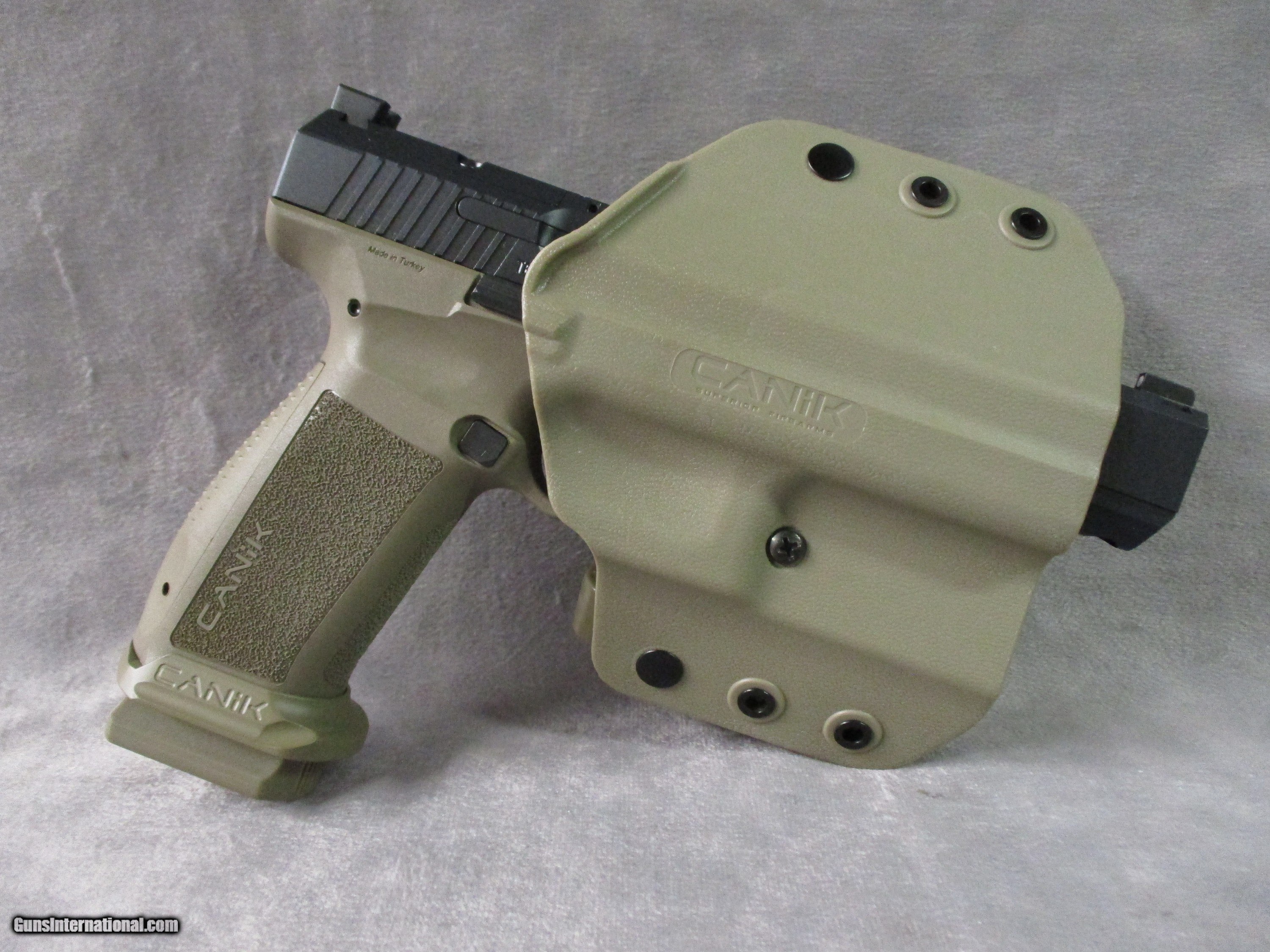 Description: The Canik TP9 is one of the recent and newly popular pistols to be imported to the American market. Its various models are becoming increasingly popular as more and more people try out this excellent pistol. The Mete (pronounced Met-Ay) is one of the newest iterations, the one shown here being the competition model. The new Mete SFx is specifically designed to be superior to the TP9 SFx and is geared towards the same types of pistol competition such as 3-gun. It has a light, crisp trigger out of the box thanks to its nickel-coated action components. The Mete SFx features a match-grade 5.2-inch-long barrel, a low-profile ambidextrous slide stop, and 3-dot white sights. The slide has lightening cutouts to keep the balance of the pistol close to the standard full-size TP9 models. The grip features an integral flared-mag-well although this pistol has been fitted from the factory with the larger Speed flared adaptor which fits over the original mag-well flare. As with the standard TP9, the frame is equipped with a 1913 picatinny under-barrel rail. The magazine catch is reversible for left-hand shooters. One major improvement over the TP9 SFx is that the rear sight and optic plate are now separate, allowing for the user to co-witness their chosen optic with the pistol’s base iron sights. Another improvement over the TP9 SFx is the internal changes made to the pistol to allow for easier disassembly. These begin with the easy-in-easy-out push pins which can be removed using a little pressure from a punch (see accessories below). Once these are removed, the internal parts are arranged to be modular enough that a complete disassembly and reassembly of the pistol is possible just using the punch. The Mete SFx comes with a very high number of accessories compared to most name brand pistols such as Smith & Wesson, Ruger, Glock, and H&K. The SFx comes with two mounting plates that fit the Trijicon RMRcc and Shield RMS/RMSc micro-optics. Also included as accessories are a spare backstrap for the grip, a reversible IWB/OWB holster, Canik punch and tool kit, cleaning tools, one 20-round and one 18-round magazines, and a magazine loading tool. The holster allows the SFx to be holstered with a red dot mounted. The tool kit is neatly shaped like a miniature Mete. This pistol is brand new and remains unfired outside of factory testing. If you are looking for a reliable competition pistol, the Mete SFx is an excellent choice. SOLD Handgun Caliber: 9x19mm Parabellum (9mm Luger, 9x19mm NATO) Manufacturer: Century Arms Model: Mete SFx Serial Number: 23BY01188 Bore: Rifled, 1:9.8" (1 in 250 mm) RH twist Ejectors: Auto-ejection Condition: New in Box Barrel Type: Match Grade Action: Semi-automatic, Browning type short recoil system, striker fired double action. Triggers: Premium Canik Trigger Stock: Polymer grip frame Fore End: M1913 picatinny rail Finish: Duotone; Black (Slide), FDE (Frame) Weight: 1.88 lbs. Sights: 3-dot white sights, Sight Radius 7.5625 inches (192.1 mm) Manufacture Date: March 2023 Extras: See description Case: Canik Box |
