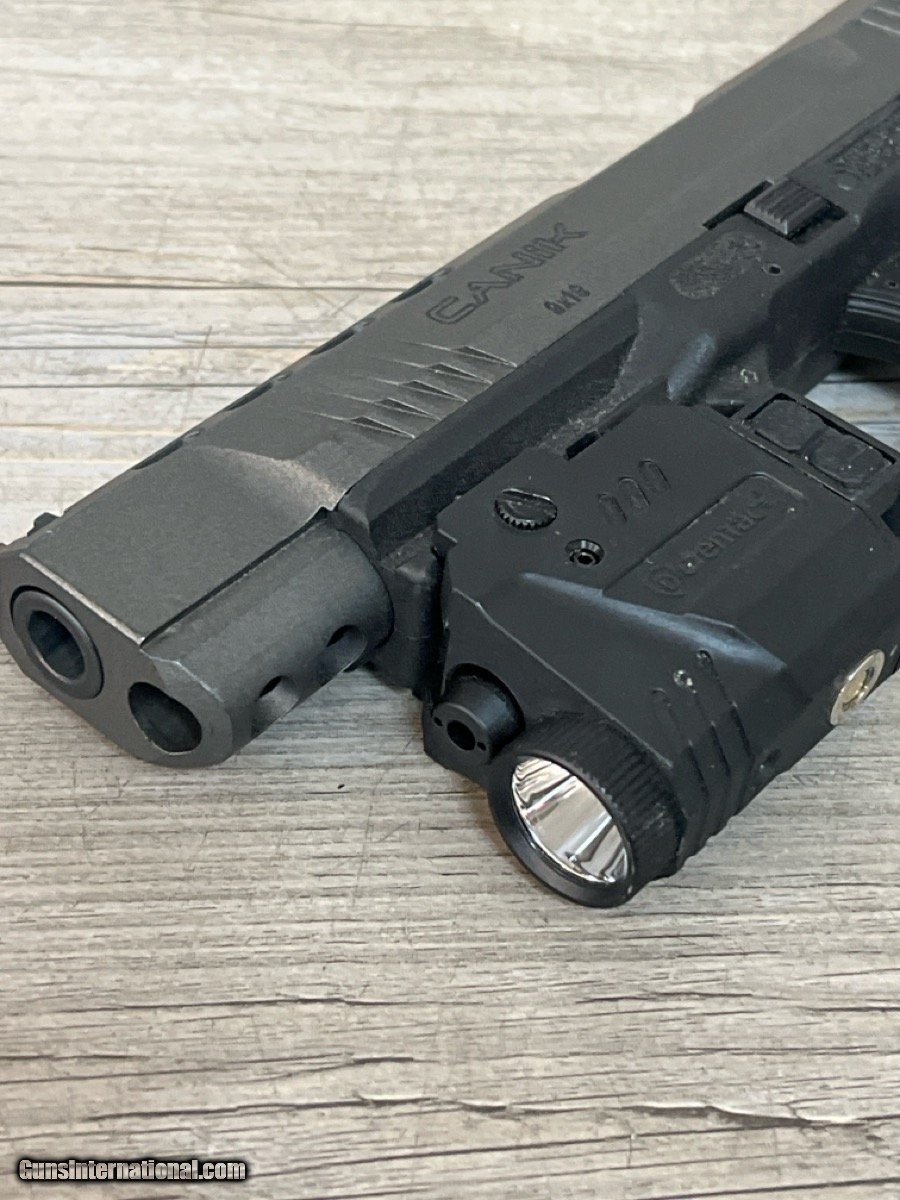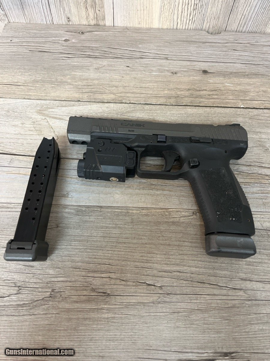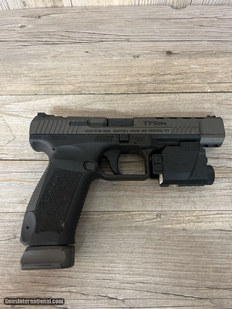 Description: Guns Listing ID: 578935 PISTOL: CENTURY ARMS INC. - C.A.I. MODEL CANIK TP9SFX, SERIAL NUMBER T6472-21 BC 39520, SEMI - AUTOMATIC, 9X19MM, 2- TONE, CASE NOT INCLUDED, 5.2\", WITH EXTRA MAG & EFENTAC DF-1068 LASER & FLASHLIGHT Make/Model: Canik TP9 SFX Caliber: 9mm Barrel Length: 5.2" Match-Grade Barrel Action: Striker-Fired Capacity: 18+1 with extra mag Finish: Tungsten Grey (or Black depending on model) Optic Ready: Yes – Comes with optic mounting plates Sights: Warren Tactical Fiber Optic Front & Blacked-Out Rear Trigger: Factory flat-face trigger (renowned for crisp break and short reset) ?? Description: This Canik TP9 SFX is a full-size, competition-ready 9mm pistol designed for serious shooters who want performance right out of the box. The extended slide and 5.2\" match-grade barrel provide exceptional accuracy, while the optics-ready platform allows easy mounting of red dots. It features a lightweight yet durable polymer frame, interchangeable backstraps, forward slide serrations, and a high-performance flat-faced trigger—widely regarded as one of the best stock triggers in its class. Perfect for USPSA, IDPA, range use, or home defense. EXTRA MAG SOLD Manufacturer: CENTURY ARMS Model: TP9SFx Caliber Info: 9MM LUGER (9x19 PARA) Condition: Used - Non-Certified Barrels: 5.2" BARREL Action: SEMI AUTOMATIC Finish: black and grey |