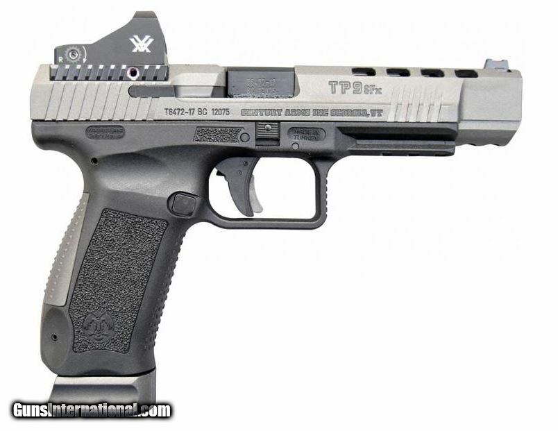 Description: Manufacturer: Century Arms Model: Canik TP9SFX SKU: HG3774GV-N Caliber: 9mm Luger Capacity: (2) 20 Round Magazines Barrel Length: 5.2" Match Grade MIL-STD-M1913 Picatinny Rail Overall Length: 8.27" Frame: Black Polymer Grips: Black Polymer, Interchangeable Sights: Fiber Optic - Front Vortex Viper Red Dot Slide Finish: Tungsten Grey Cerakote Weight: 1.83 lbs Get your hands on the Canik TP9SFX Model pistol from Century Arms! This full sized polymer striker fired handgun has all the features you're looking for from today's most popular pistols at a price you can afford. It has a 5.2" match grade barrel and striker-fired single action only trigger system with trigger safety. Featuring a polymer frame, striker status indicator, reversible magazine catch and interchangeable back straps you'll recognize the familiar feel and controls. The steel slide has a durable finish. This version includes a Vortex Viper Red Dot sight. If you need a reliable, accurate pistol for duty competition or home defense take a look at the Canik TP9SFX!