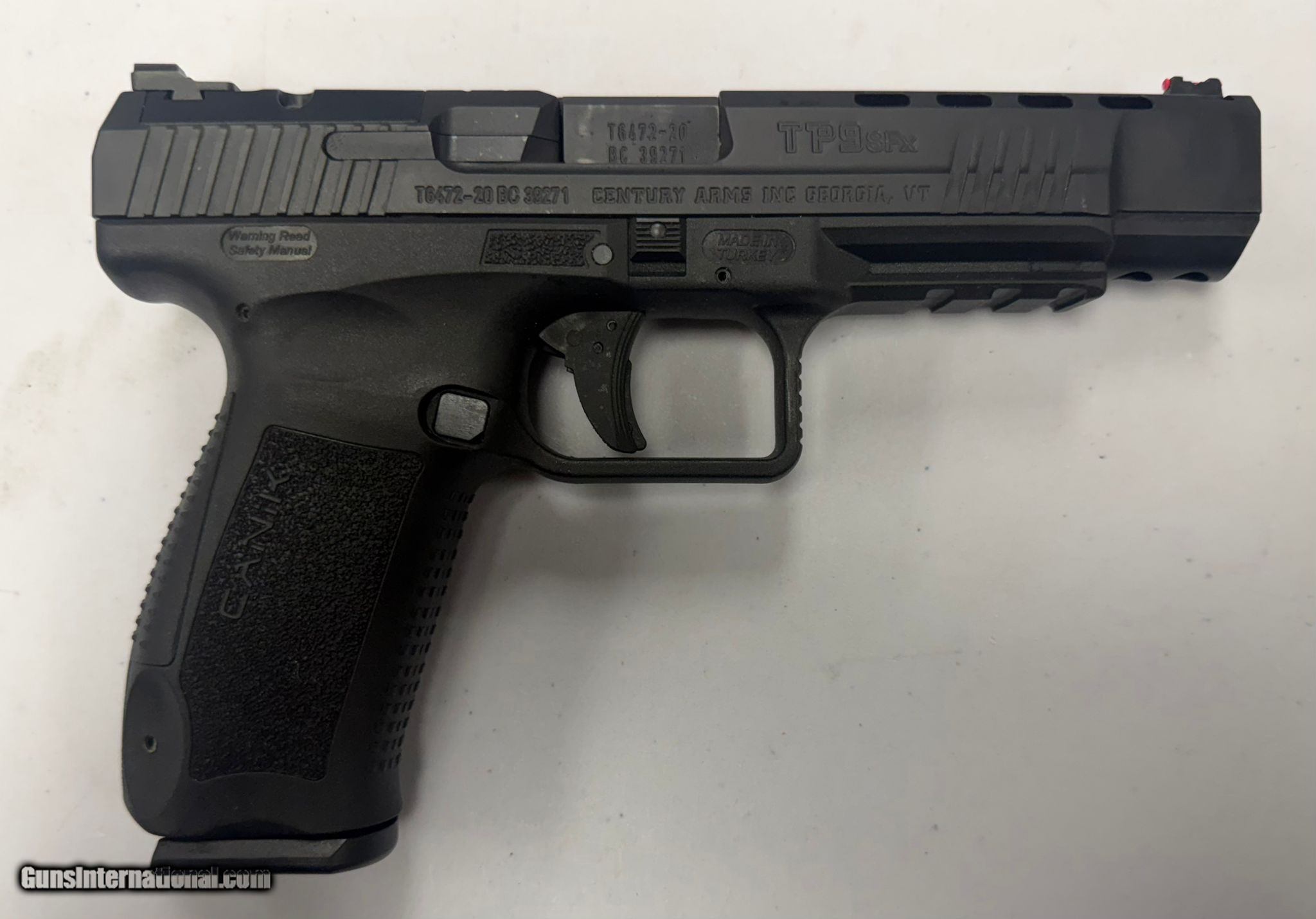 Description: Guns Listing ID: 599160 Comes with a box and 3 18rd magazines. The TP9SFx is a competition-oriented, striker-fired 9mm pistol featuring a 5.2\" match-grade barrel and a light, crisp single-action trigger with a short reset. Its long-slide design includes forward and rear serrations, lightening cuts, and a fiber-optic front sight paired with a blacked-out rear for quick target acquisition. The optics-ready slide accommodates multiple red-dot footprints via included adapter plates. A polymer frame with extended controls, interchangeable backstraps, and a flared magazine well supports fast, consistent handling. Designed for competitive performance, the TP9SFx offers enhanced accuracy, rapid cycling, and high reliability. Gun is in very good condition with little to no wear. See photos for details! Manufacturer: CENTURY ARMS Model: TP9SFx Caliber Info: 9MM LUGER (9X19 PARA) Condition: Used - Non-Certified Barrels: 5.2" BARREL Action: SEMI AUTOMATIC Finish: BLACK Weight: 1.83 lbs. Price: $325.99 Contact Seller |