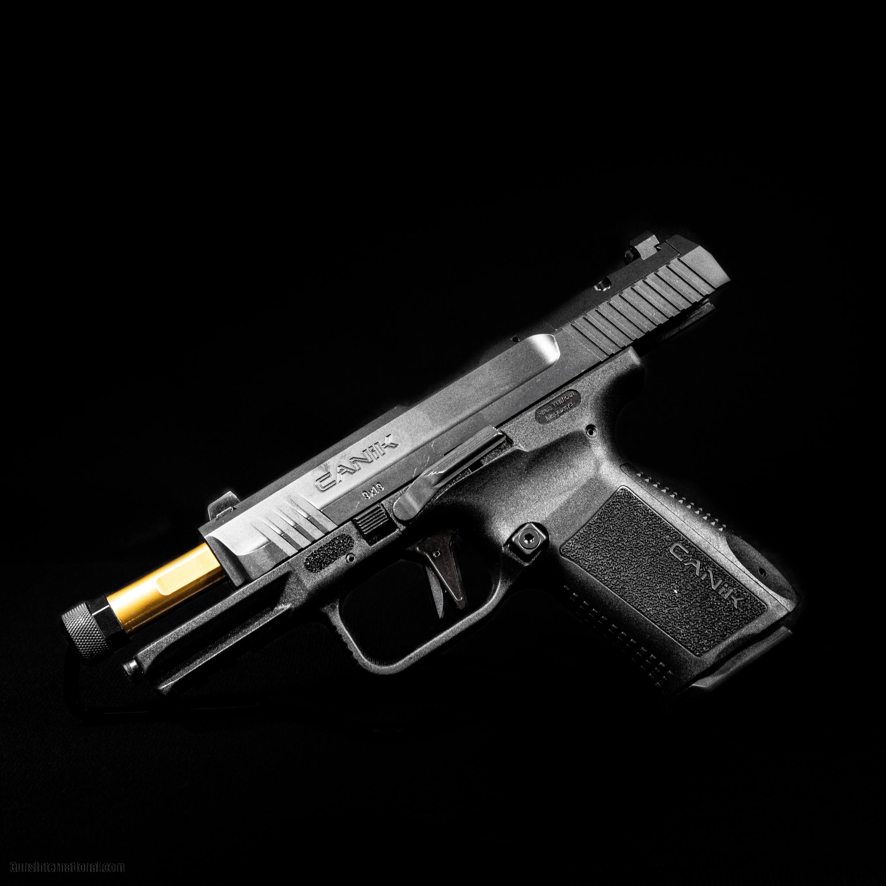 Description: Based on the TP9 Elite Combat utilizing performance upgrades designed by Salient Arms International, the Executive features a distinctive gold barrel by Salient, fluted, match-grade, and PVD-over-nitride coated, and a black polymer frame topped with a nitride-coated jet black slide. The Executive is suppressor-ready with 1/2 x 28 RH threads. The TP9 Elite Combat Executive includes the new flat-face aluminum trigger with a black full-face safety. The optics-ready slide comes with an optics mounting plate and charging handle. A side-reversible, extended magazine release and additional backstrap for customizing the fit is included in addition to a new retention holster with Slide Lock Release. The slide, barrel, and small steel parts are nitride-coated while internal components are nitride or high-wear nickel-coated. The Salient collaboration includes the barrel and thread protector, an aluminum Speed Funnel magazine well, and sight set with fiber optic front sight. A 15-round magazine with a +3 extension for a total of 18-rounds is included. This item comes with a case, holster, and two magazines. Overall condition is excellent with little to no wear present form use. Pre-Owned - Canik TP9 Elite Combat Executive 9mm 4.73"
