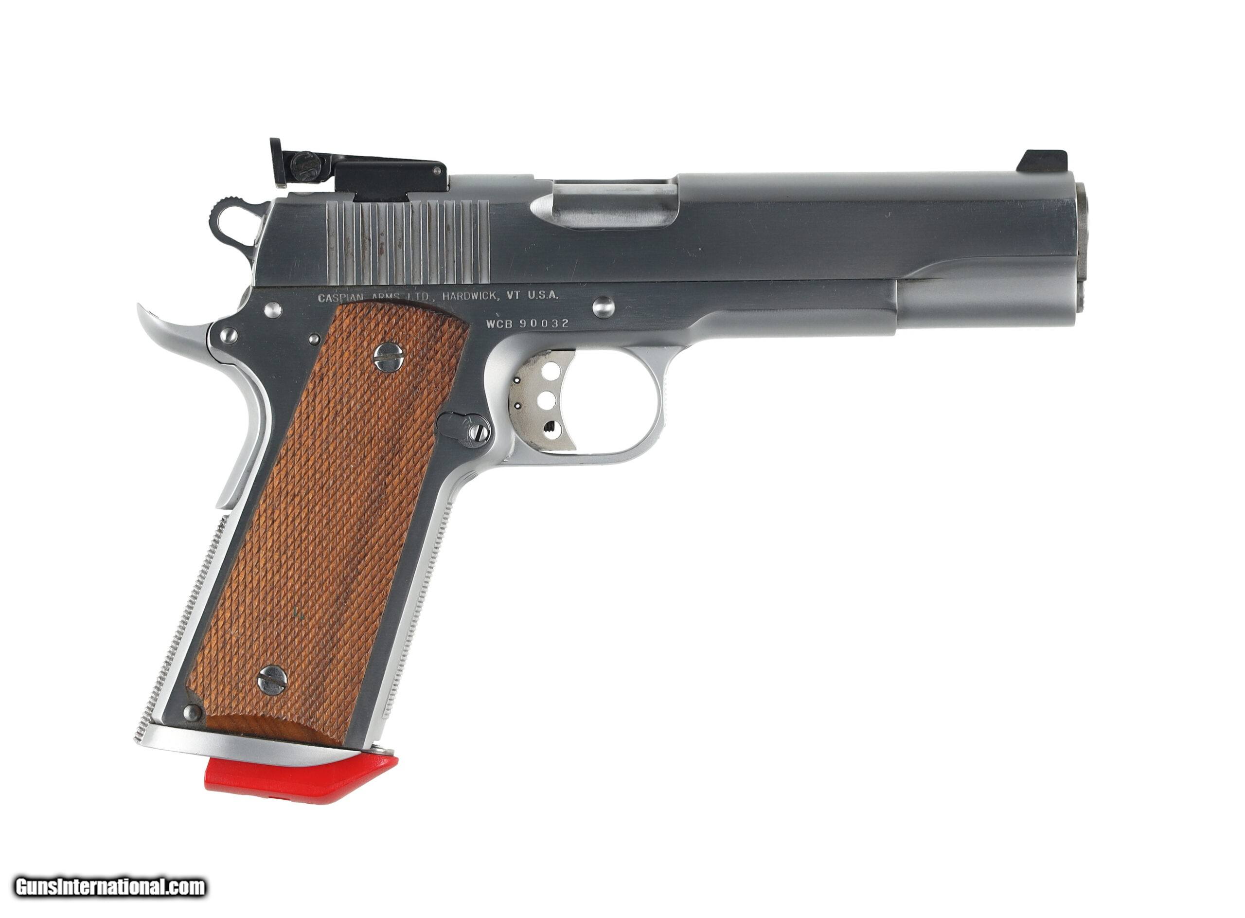 Description: Tis Caspian Arms 1911 was custom built by Glades Gun Works in Naples Florida, overall build quality is good, with tight fitment to all parts. The only part which appears fitted poorly is the ejector, which protrudes somewhat when the slide is all of the way forward. Condition is very good, with little wear. Manufactured in: USA Hand: Right Hand Action Finish: Matte Stainless Metal Finish: Original Barrel Length: 5 Inches Barrel Condition: Very Good Stock Finish: Original Stock Condition: Very Good Grip: Pistol SOLD Manufacturer: Caspian Arms Model: 1911 Caliber Info: .45 ACP Condition: Preowned Metal Condition: Very Good Action: Semi Automatic Triggers: Single Finish: Original Weight: 2.5 lbs Case: NONE |