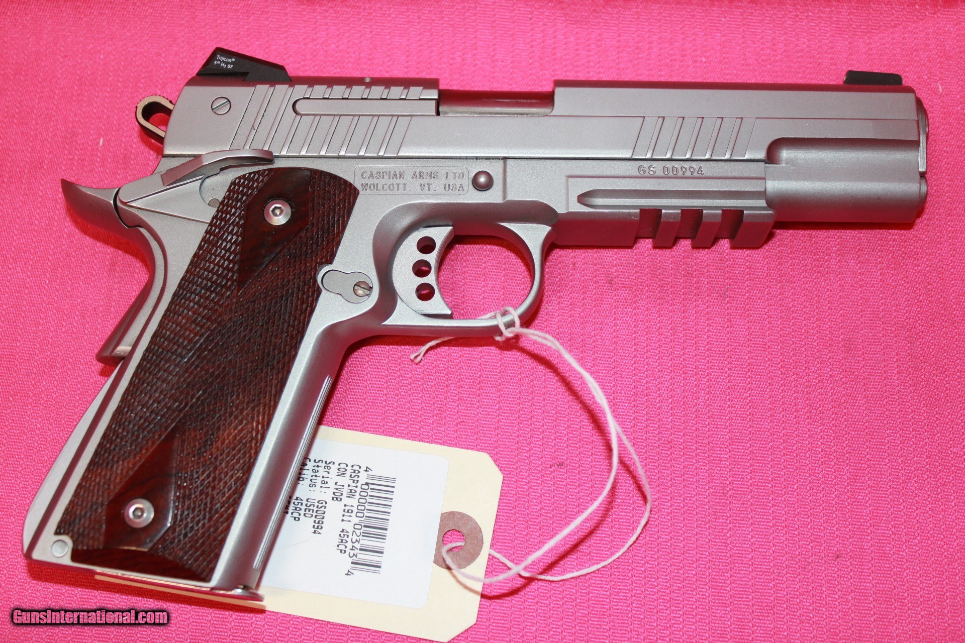 Description: Caspian Arms 1911 in 45ACP with a 5" barrel, railed frame. Pistol is lightly used in very good condition. Comes with 1 mag, no box. *Legendary Guns in Phoenix AZ 602-242-1195 Hours of operation Tuesday-Friday 10-6 Sat 10-5 Closed Sundays & Mondays *We accept all Major credit cards. We DO NOT charge an additional fee for Credit Cards. We also accept Postal Money orders or Certified Bank Checks{Check & Money order payments must arrive within 7 days of initial agreement and will be held for 3 days before items are shipped} *Shipping is $50 for rifles/shotguns {AK & HI Extra} and $35 for handguns. Arizona Residents Must Pay Sales Tax. We DO NOT ship Internationally. *We offer a 60 day layaway on purchases of $500 or more. Items require 1/3 of the total price as down payment which is NON-REFUNDABLE and you have 60 days to pay off the balance. *Please call or email with any questions and to confirm availability before buying. We are happy to answer all questions. All items listed are also for sale at our Phoenix, AZ location *We offer a 3 day inspection period on USED FIREARMS ONLY, We accept returns within the 3 day inspection period with NO REFUNDS ON SHIPPING CHARGES and a 10% restocking fee. *Trades are welcome for customers who can visit our Phoenix, AZ location, We DO NOT engage in online or mail in trades. SOLD Handgun Caliber: .45 ACP (.45 Auto) |