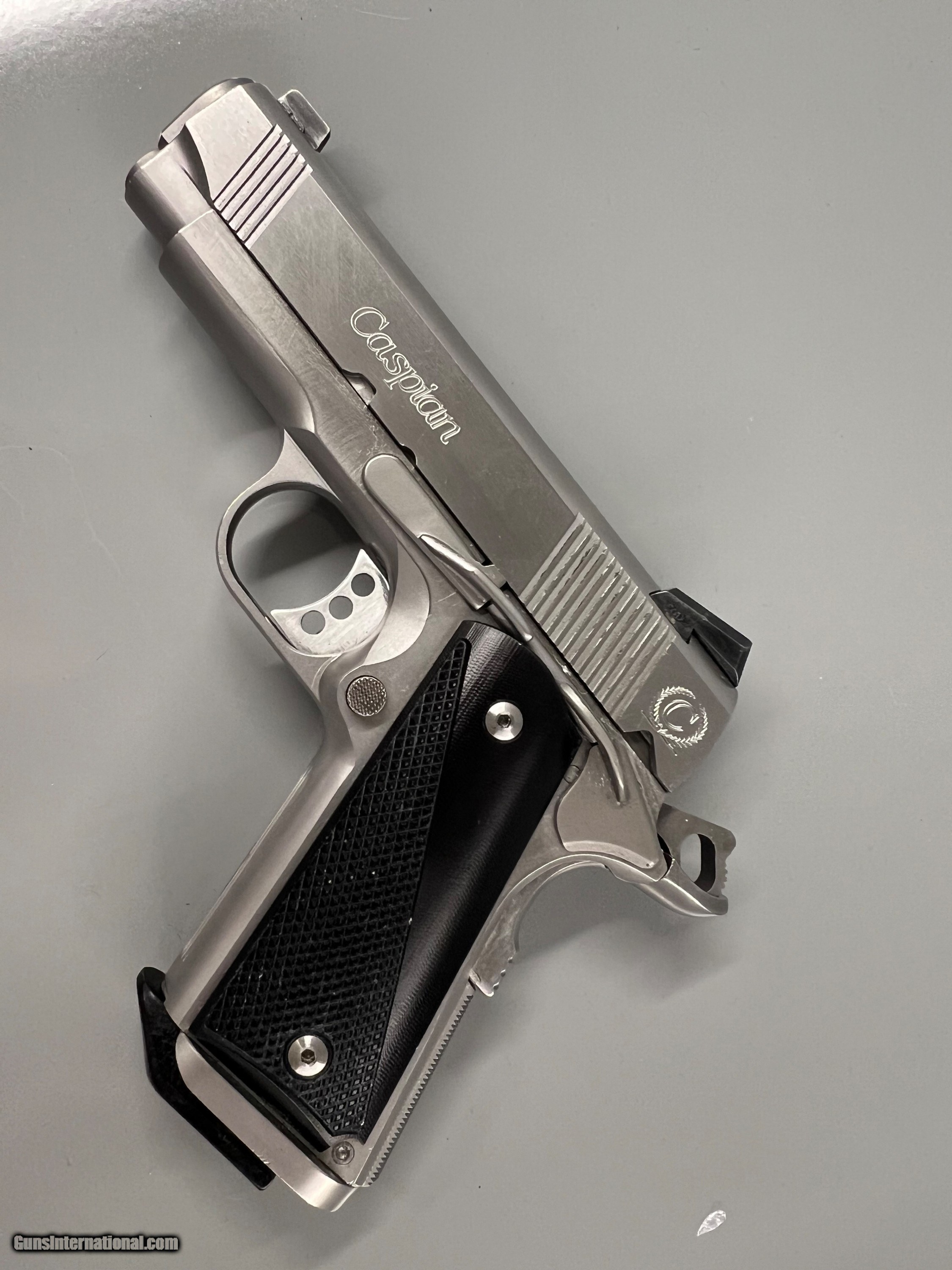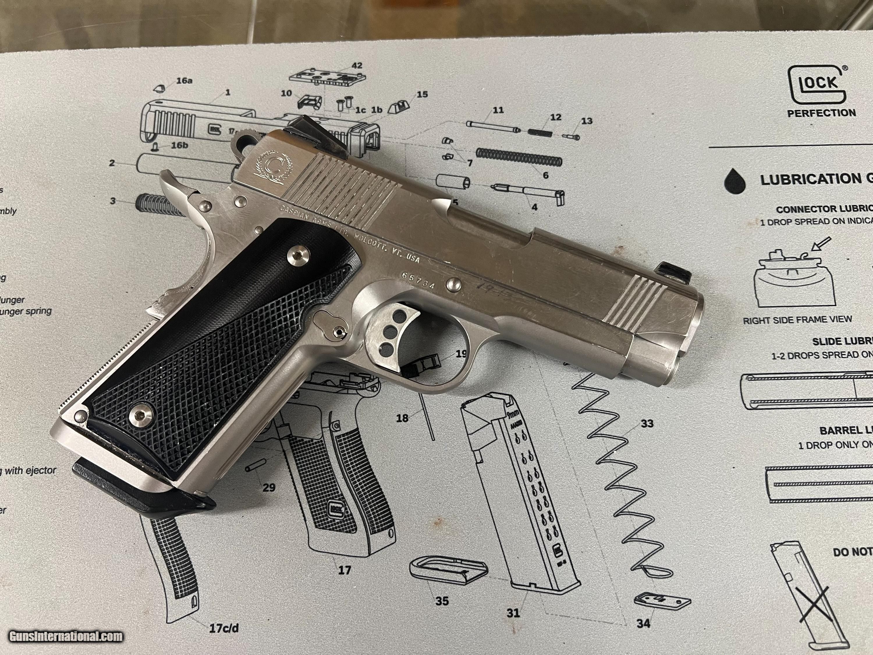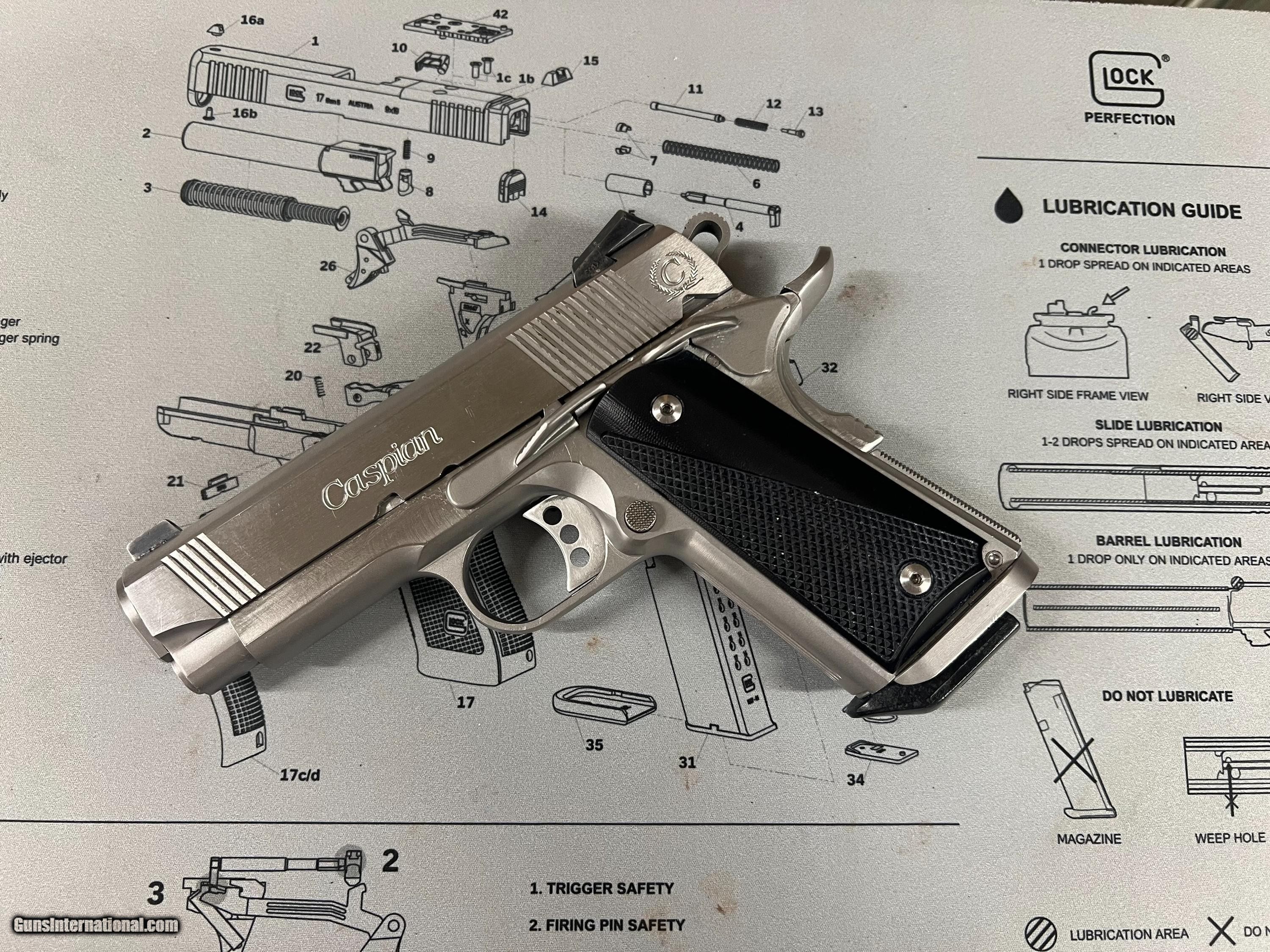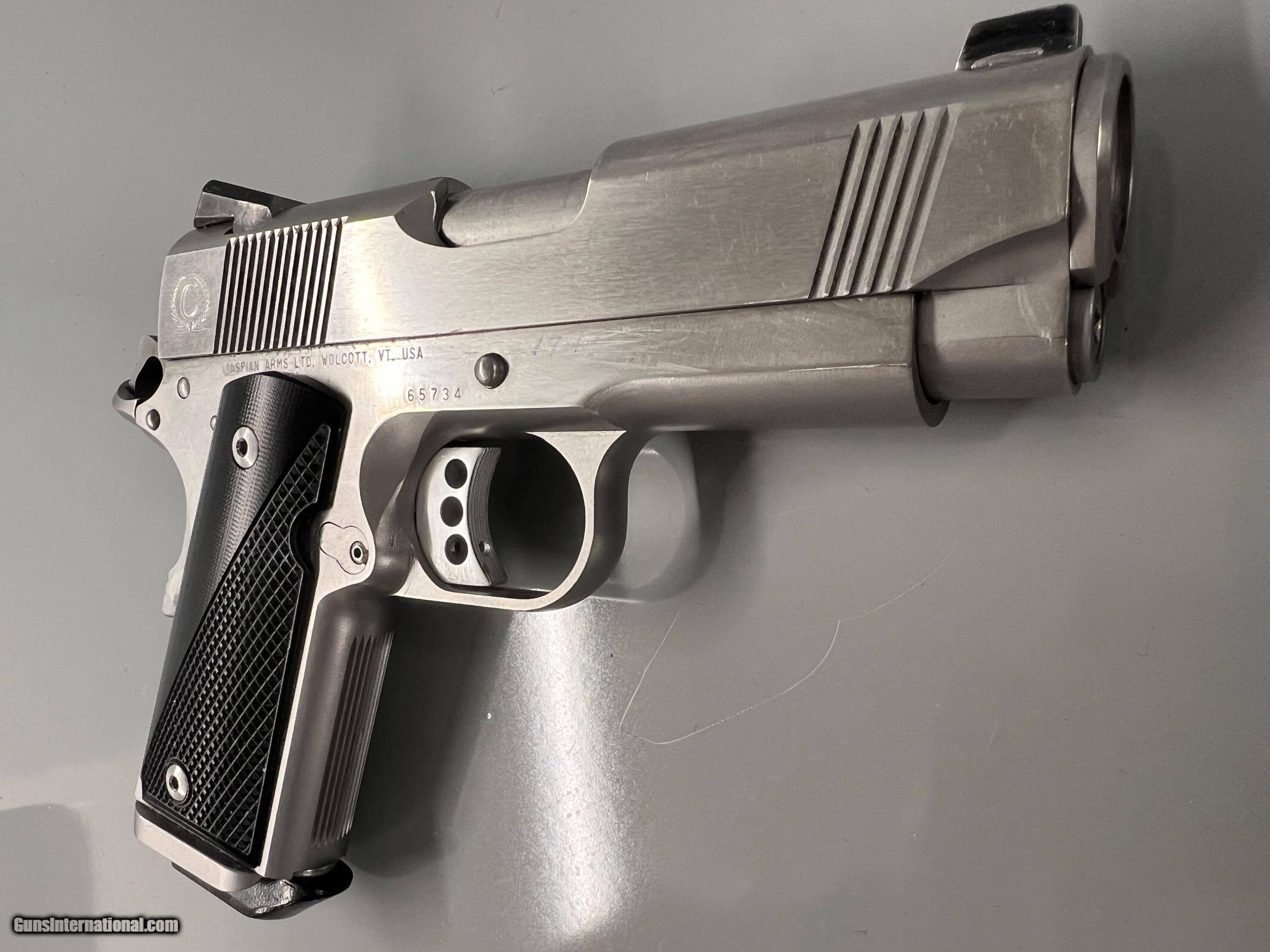 Description: Great condition Hi-end carry all steel Caspian Arms,45 ACP Concealed Carry Beavertail backstrap, three dot sights, checkered front strap and back strap,flared mag well, serated slide front and back. Chip Macormick 7rd mag Superior build quality. Handgun Caliber: .45 ACP (.45 Auto) Manufacturer: Caspian Model: Compact Carry Serial Number: 65734 Barrel Length: 3.75 Bore Info: Ex Condition: Ex Metal Condition: EX Bore Condition: EX Price: $1,490.00 Buy Now Contact Seller |