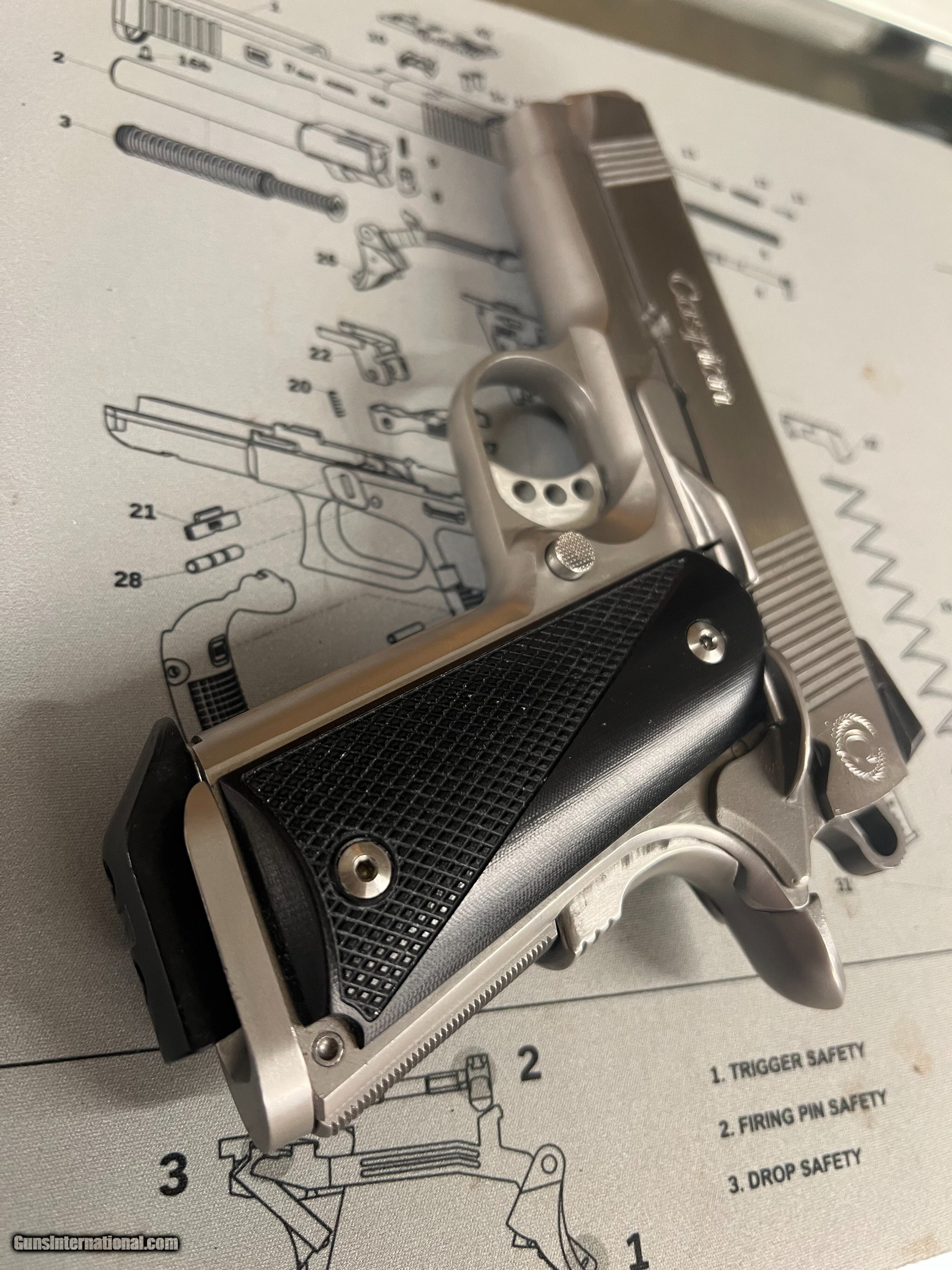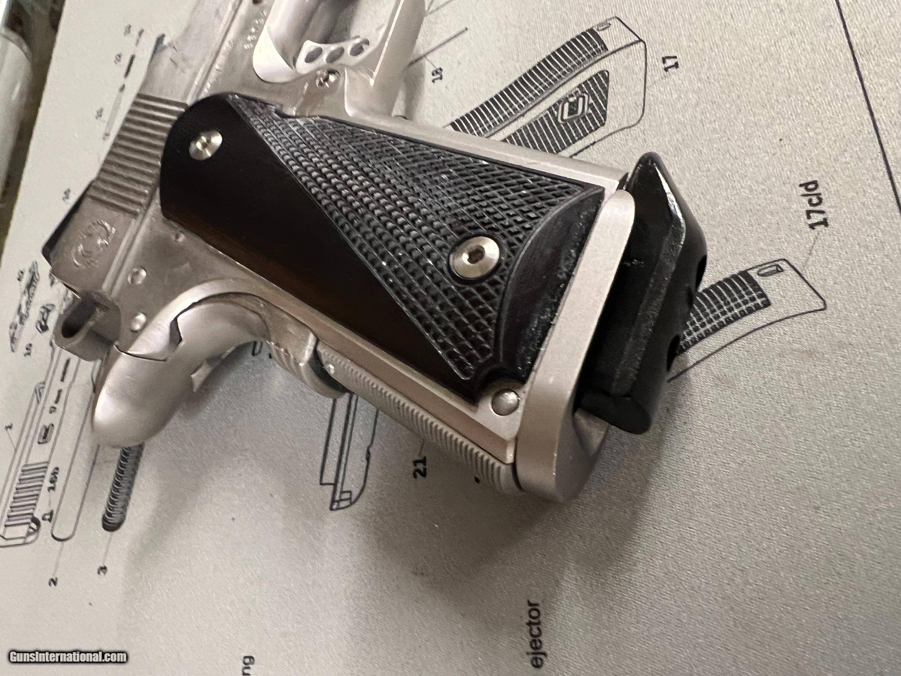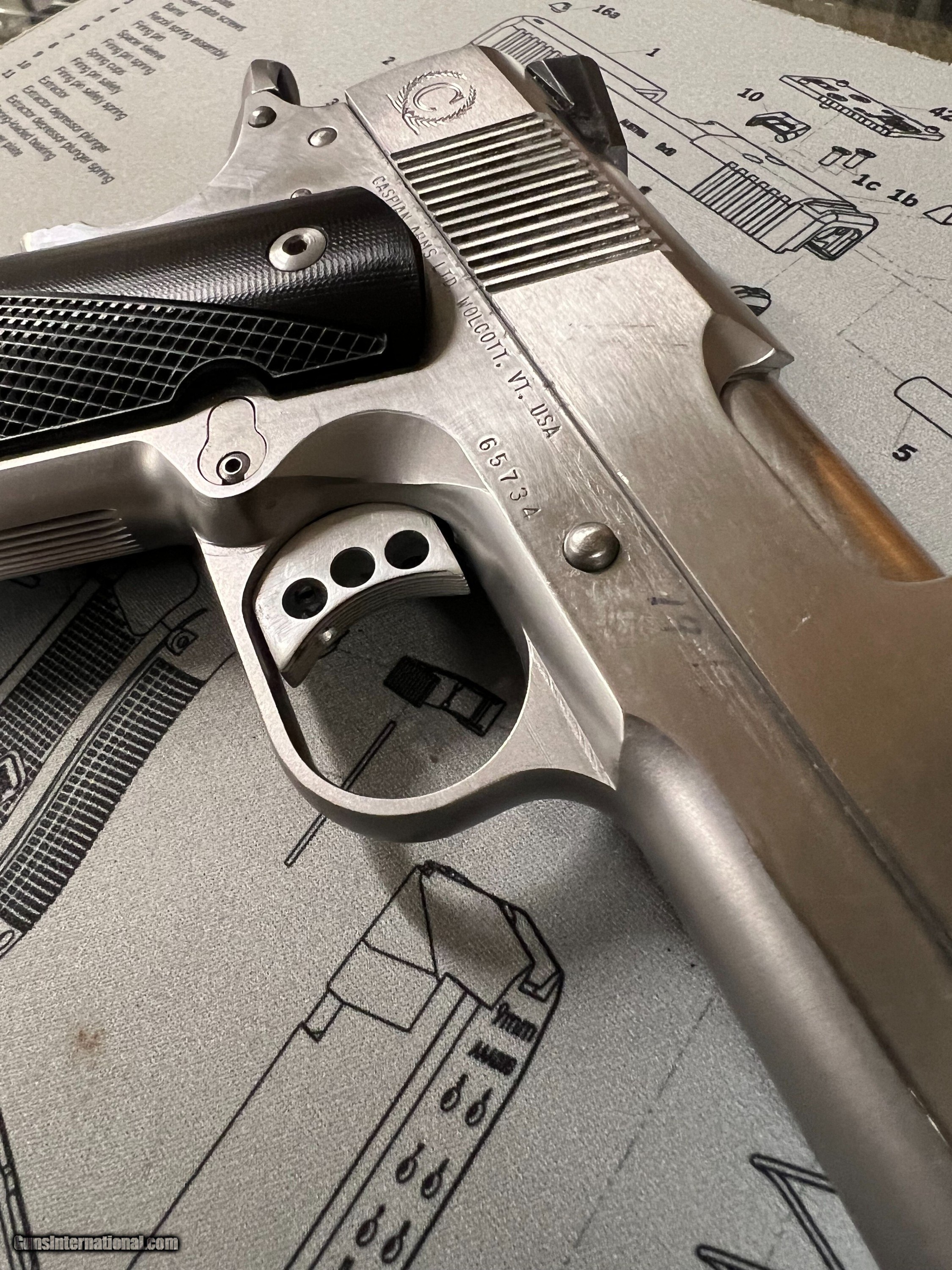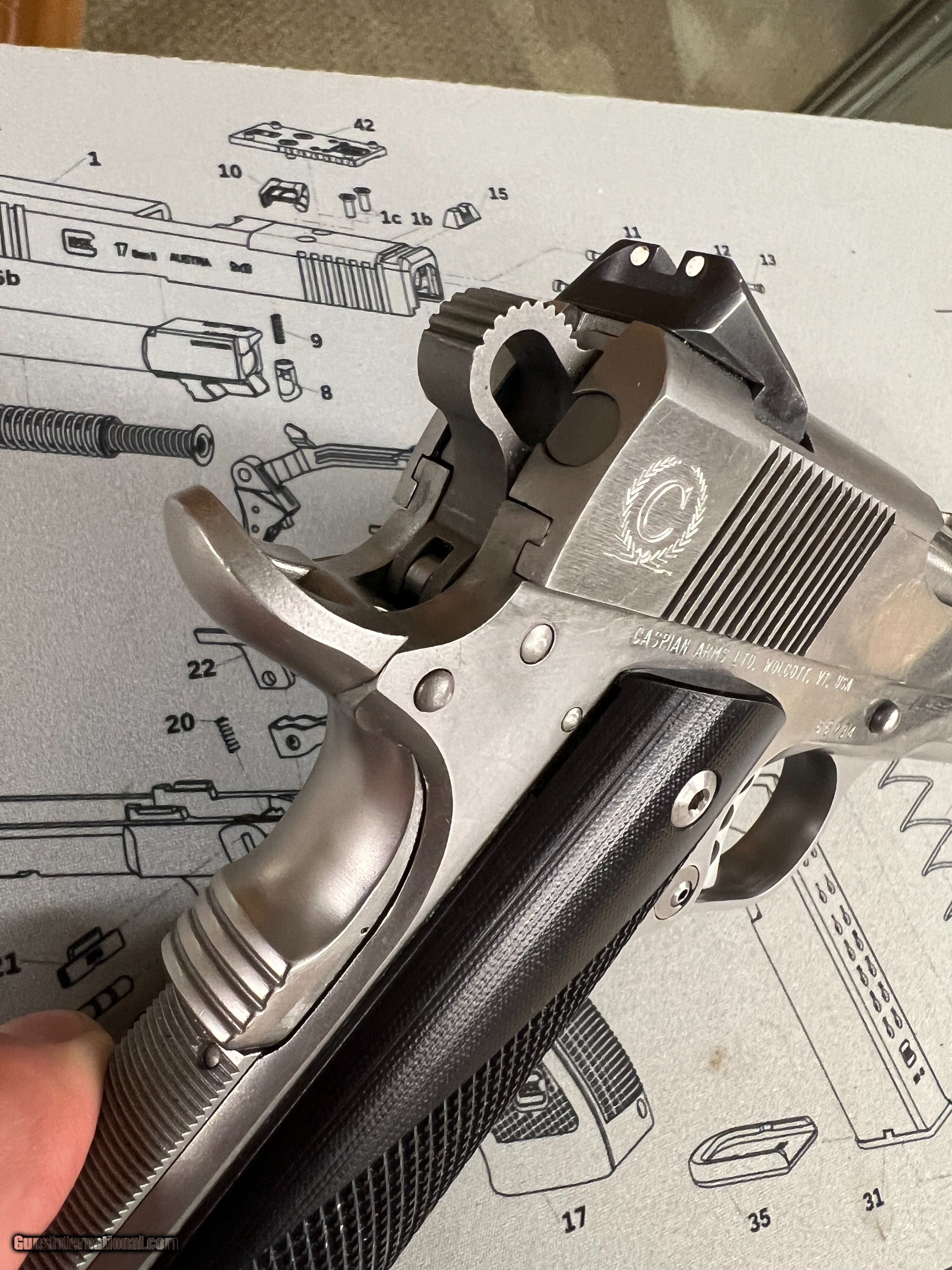 Description: Great condition Hi-end carry all steel Caspian Arms,45 ACP Concealed Carry Beavertail backstrap, three dot sights, checkered front strap and back strap,flared mag well, serated slide front and back. Chip Macormick 7rd mag Superior build quality. Handgun Caliber: .45 ACP (.45 Auto) Manufacturer: Caspian Model: Compact Carry Serial Number: 65734 Barrel Length: 3.75 Bore Info: Ex Condition: Ex Metal Condition: EX Bore Condition: EX Price: $1,490.00 Buy Now Contact Seller |