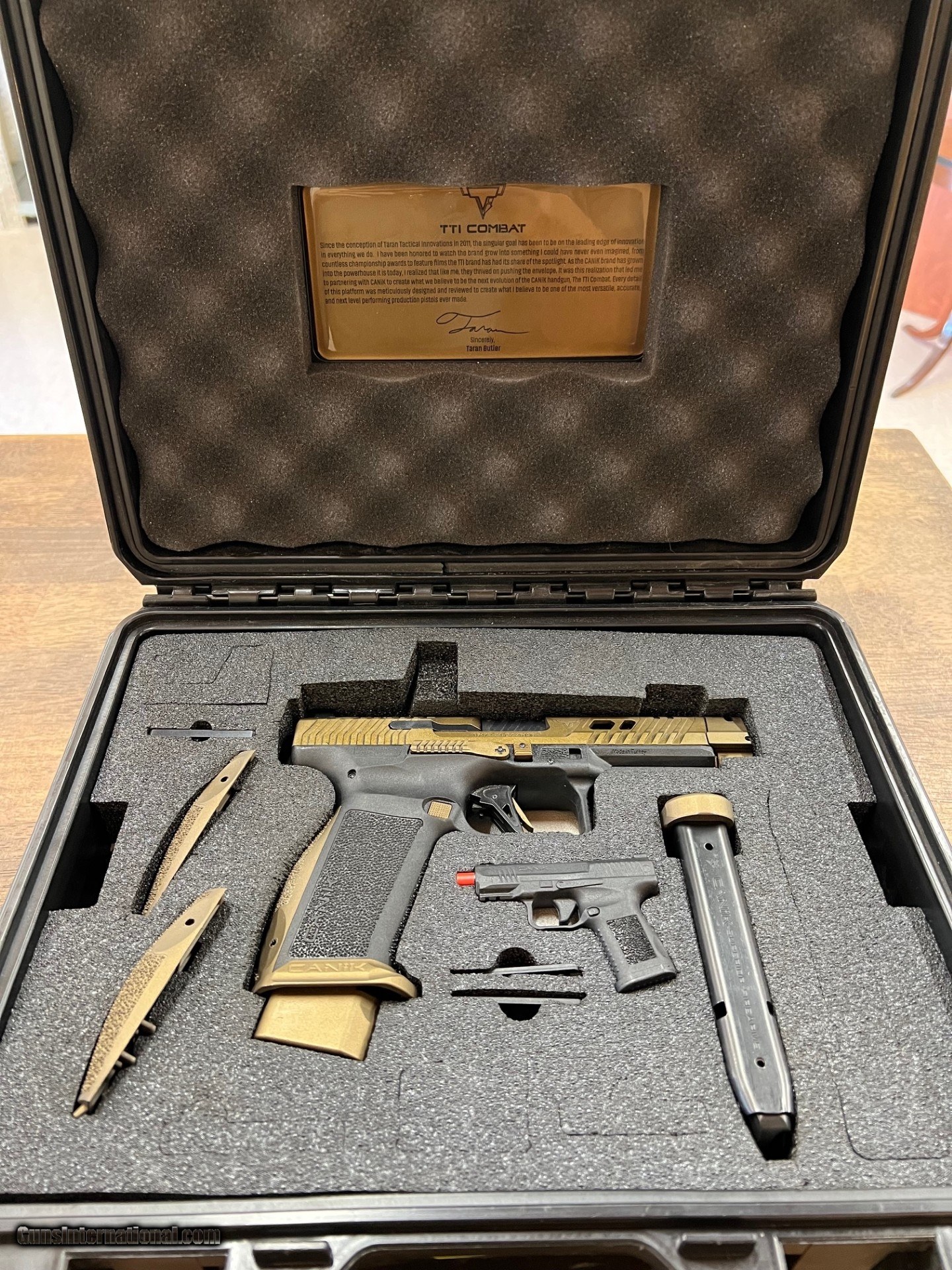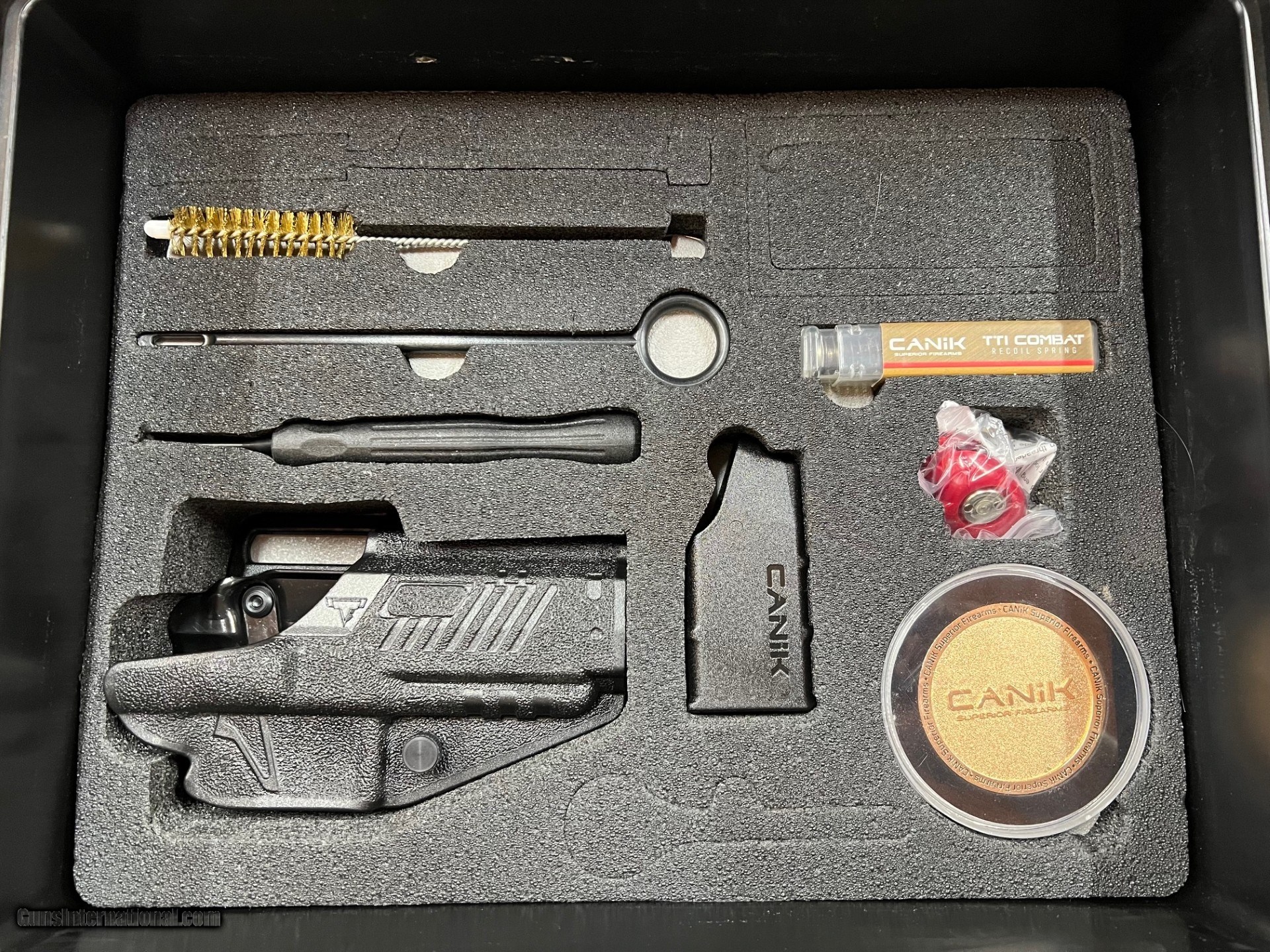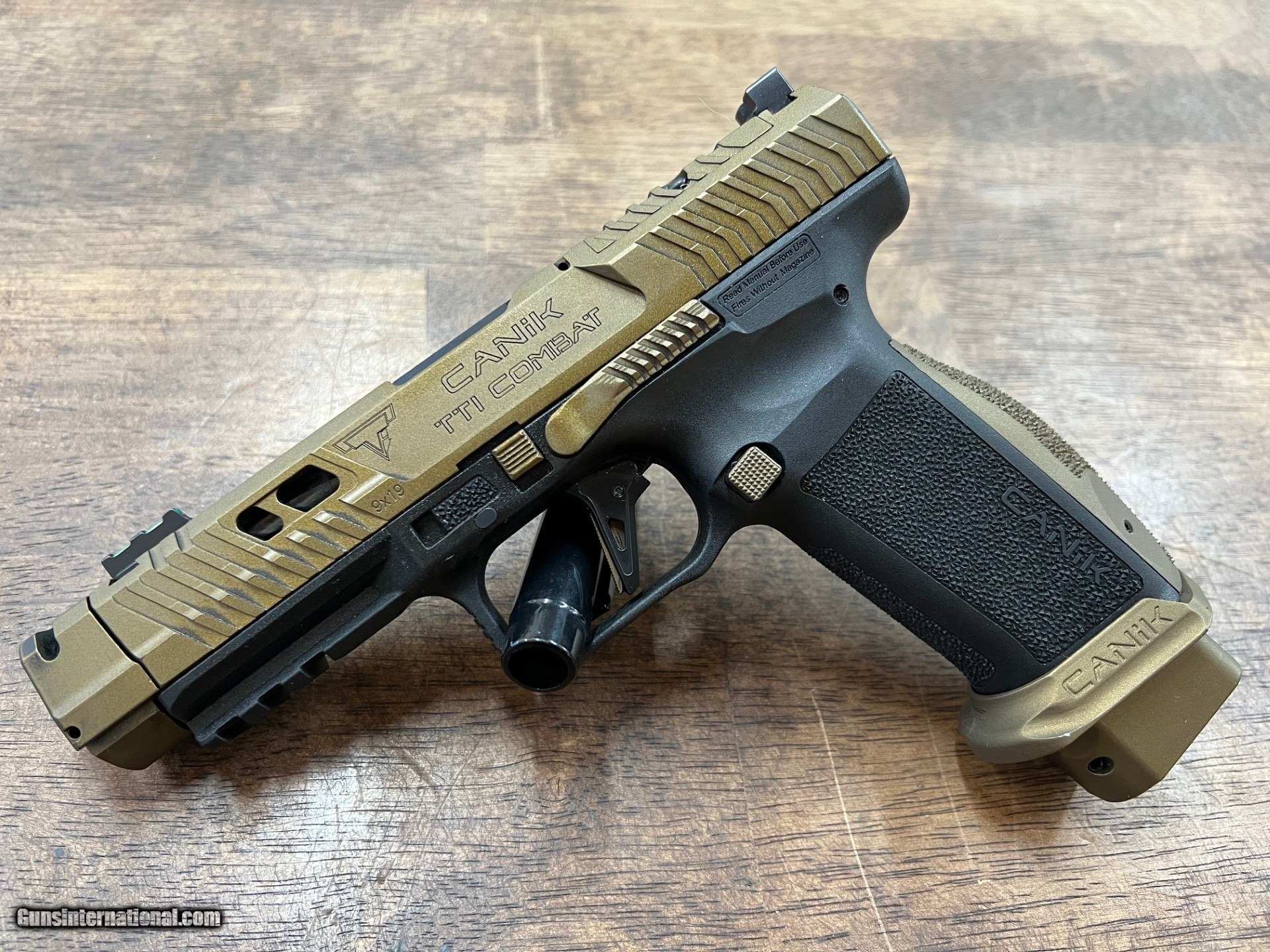 Description: Guns Listing ID: 501488 CENTURY ARMS INC. - C.A.I. CANIK TTI COMBAT W/ OG BOX & ACCESSORIES, SERIAL NUMBER T6472-24 CZ 26196, BITONE BLACK 7 GOLD, 4.75\" BARREL, 9X19MM, SEMI - AUTOMATIC. OVERALL LENGTH: 7.75 INCHES. WEIGHT: 1.9 LBS. SOLD Manufacturer: CENTURY ARMS Model: CANIK TTI COMBAT Caliber Info: 9MM LUGER (9x19 PARA) Condition: Used - Non-Certified Barrels: 4.75 Action: SEMI AUTOMATIC Finish: black / mica bronze |