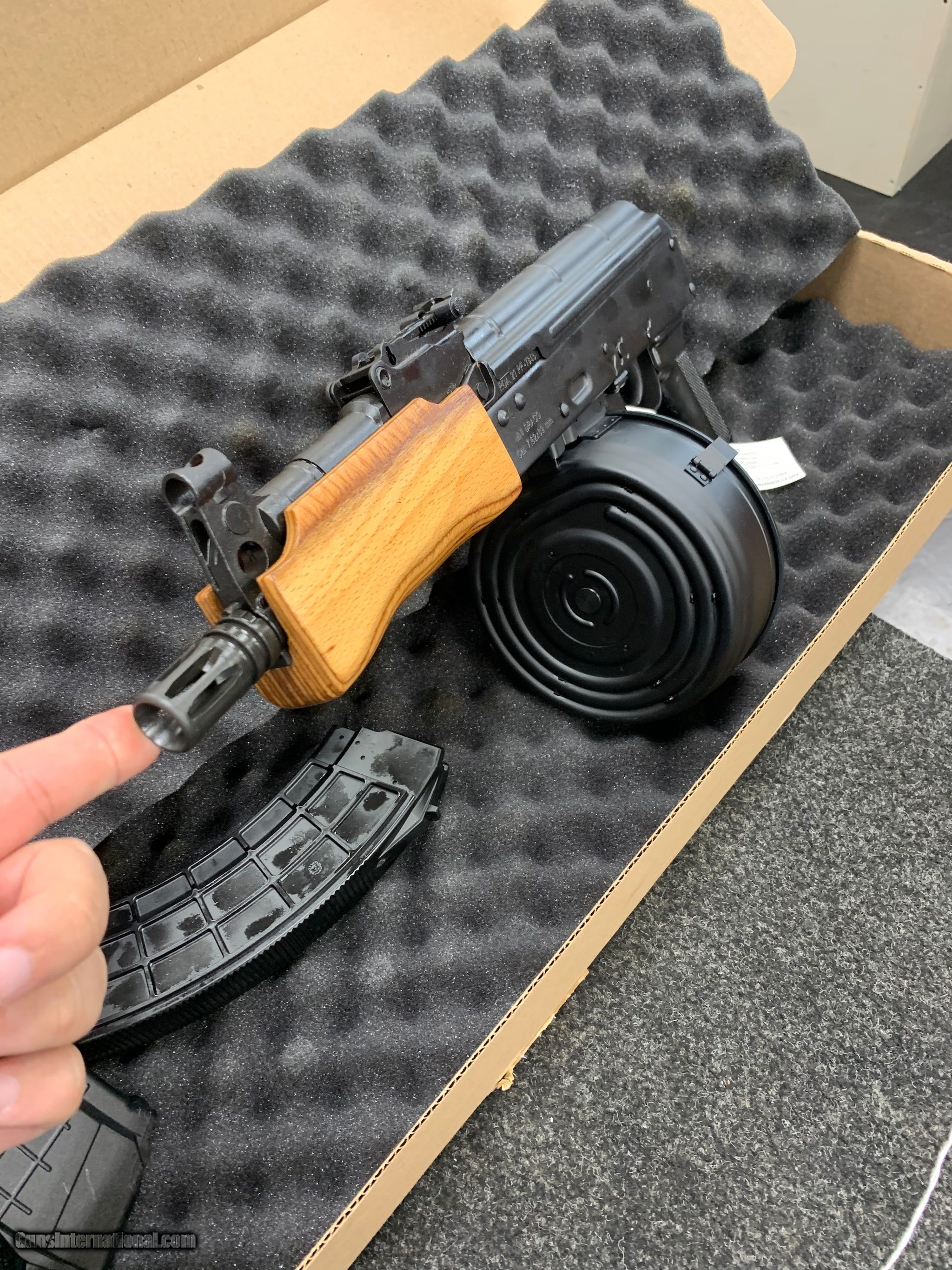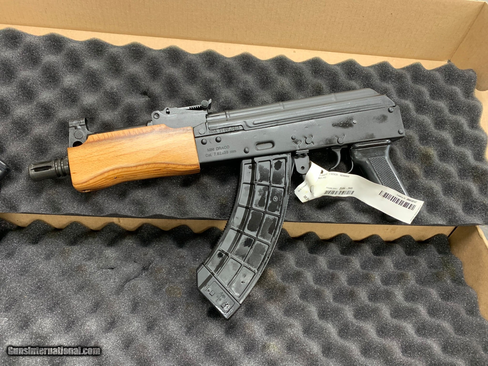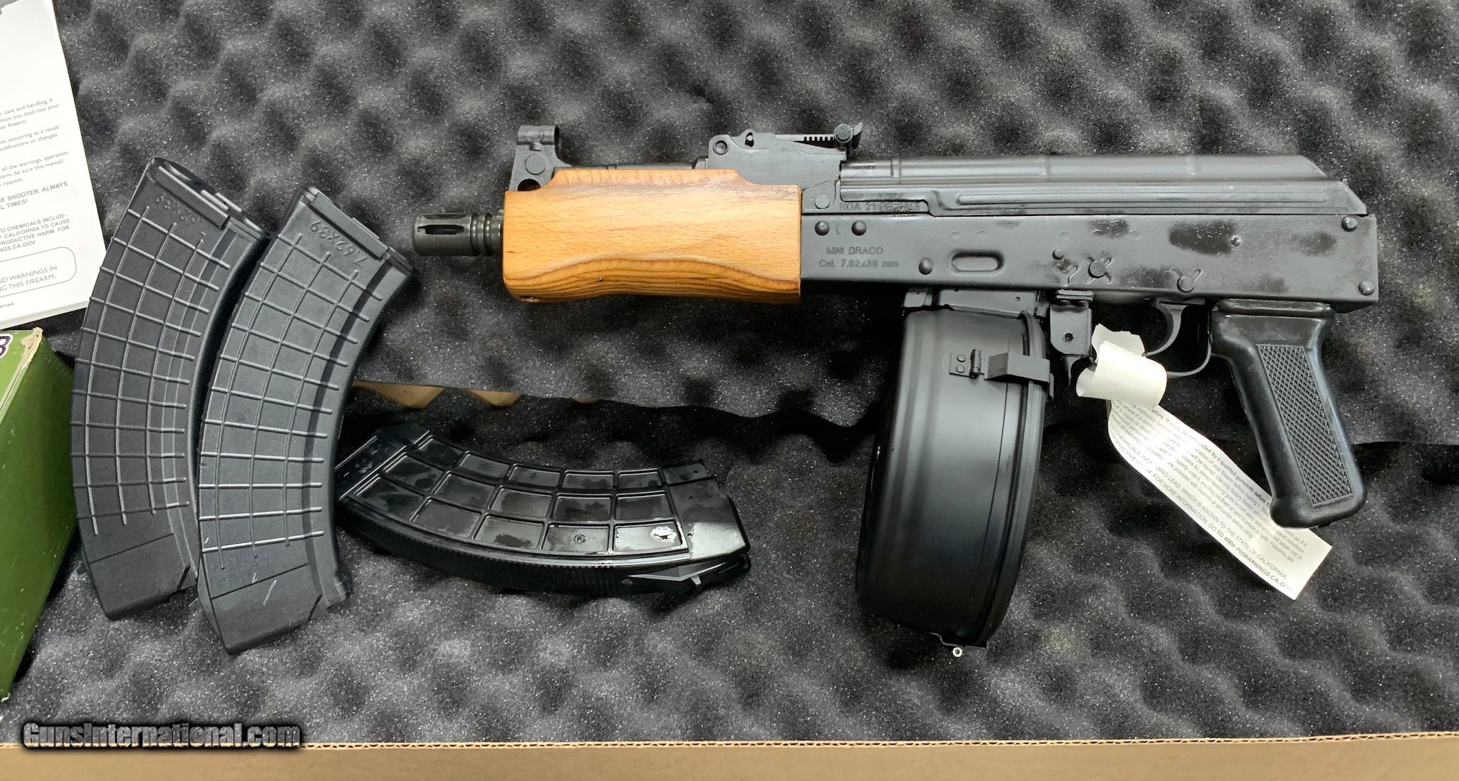 Description: Guns Listing ID: 331315 ********INCLUDES*********** THREE 30 ROUND MAGAZINES ONE 75 ROUND DRUM EVERYTHING IS NEW The Century Arms Draco wraps the AK style into the pistol format. Chambered in 7.62x39mm this semi-automatic pistol has a 12.25 barrel. While it comes standard with a 30-round magazine the Century Arms Draco is compatible with any AK double stack magazine or drum. The barrel includes an integral front sight and gas tube Details Action Semi Automatic - Caliber 7.62X39mm - Capacity 30 - Finish Black - Frame Material Steel - Barrel Length 7.75 - Twist 110 - Length 17.5 - Weight 5.65 lb. If youre looking for a great little AK style handgun check out this Mini Draco Pistol from Century Arms Its a well built little import known for its performance and durability. This gun is a lot of fun for plinking around and target shooting. The more daring and adventurous may want to try the Mini Draco out for some uncomfortably close range hog hunting What ever your target the Mini Draco will instantly make it much more fun and memorable. SOLD Manufacturer: CENTURY ARMS Model: MINI DRACO 75 RND DRUM/ THREE 30 RND MAGAZINES Caliber Info: 7.62 X 39 MM Condition: Used - Non-Certified Barrels: 7.5 BARREL Finish: BLUE |