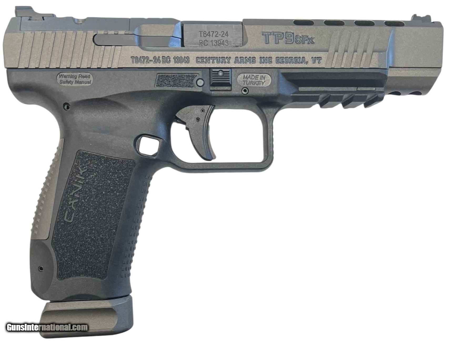 Description: Guns Listing ID: 547157 Manufacturer: Canik Importer: Century Arms Model: TP9 SFX MOS Type: Handgun Action Type: Semi-Automatic Caliber / Gauge: 9 MM Finish: Cerakote Barrel Type: Single Grip Type: Polymer Barrel Length: 5\" Magazine Capacity: 18 Magazine Quantity: 2 Case Type: Case - Hard Condition: Used Notes: In original case, with holster, back strap, plates and cleaning brush Very clean SOLD Manufacturer: CENTURY ARMS Model: TP9 SFX MOS Caliber Info: 9MM LUGER (9x19 PARA) Condition: Used - Non-Certified Barrels: 5 BARREL Action: SEMI AUTOMATIC Finish: Cerakote |