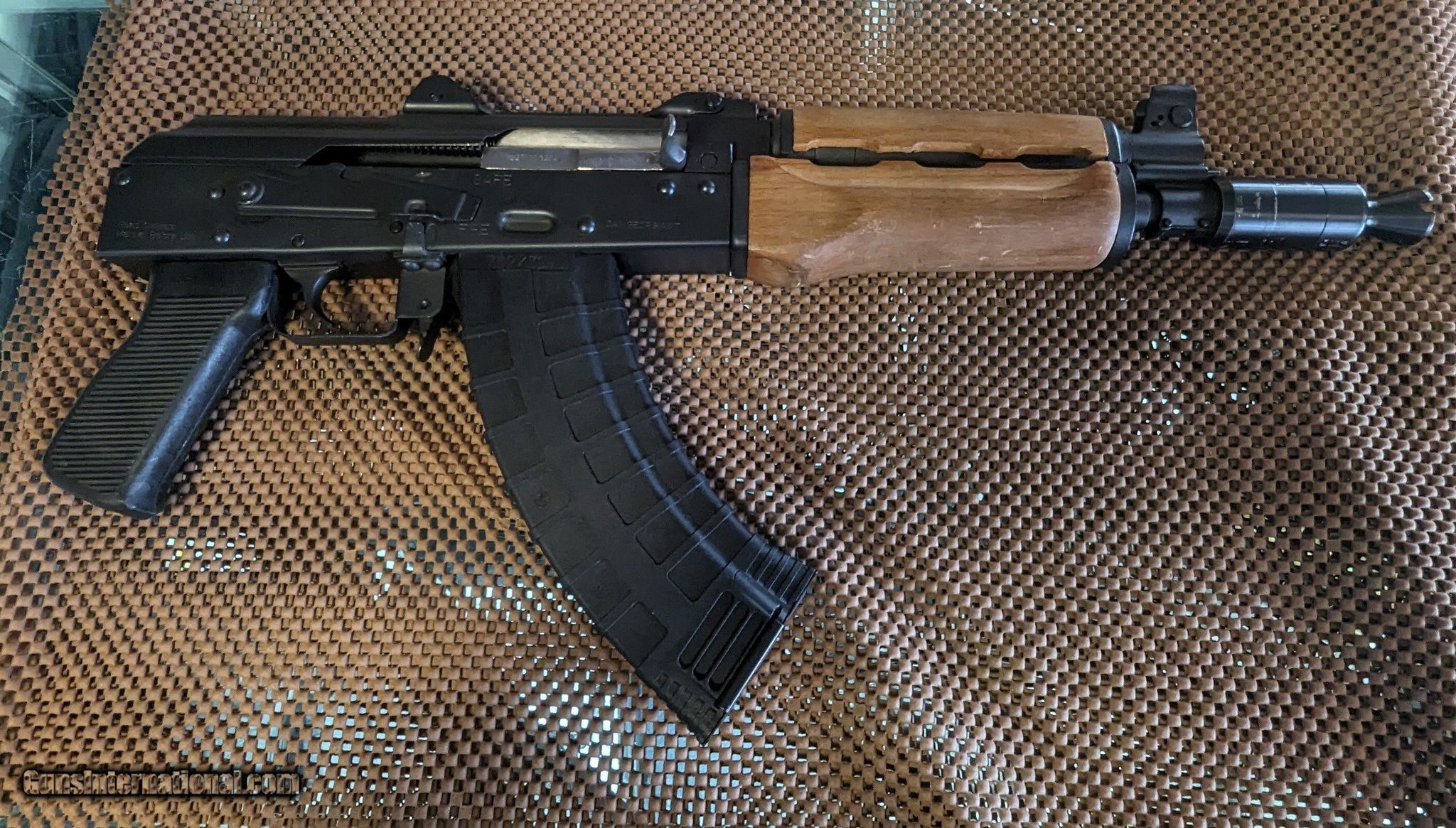 Description: Guns Listing ID: 1306772 This AK style pistol is a brand new firearm made by the famous Zastava factory in Serbia. The PAP M92 is loaded with features including a dimpled receiver, hinged top cover, chrome bolt, krink-style rear sight, dual apature front sight, and a bolt hold-open notch on the selector. SOLD Manufacturer: CENTURY ARMS Model: Zastava PAP M92PV Caliber Info: 7.62X39MM Condition: Used - Non-Certified Barrels: 9 BARREL Finish: WOOD |