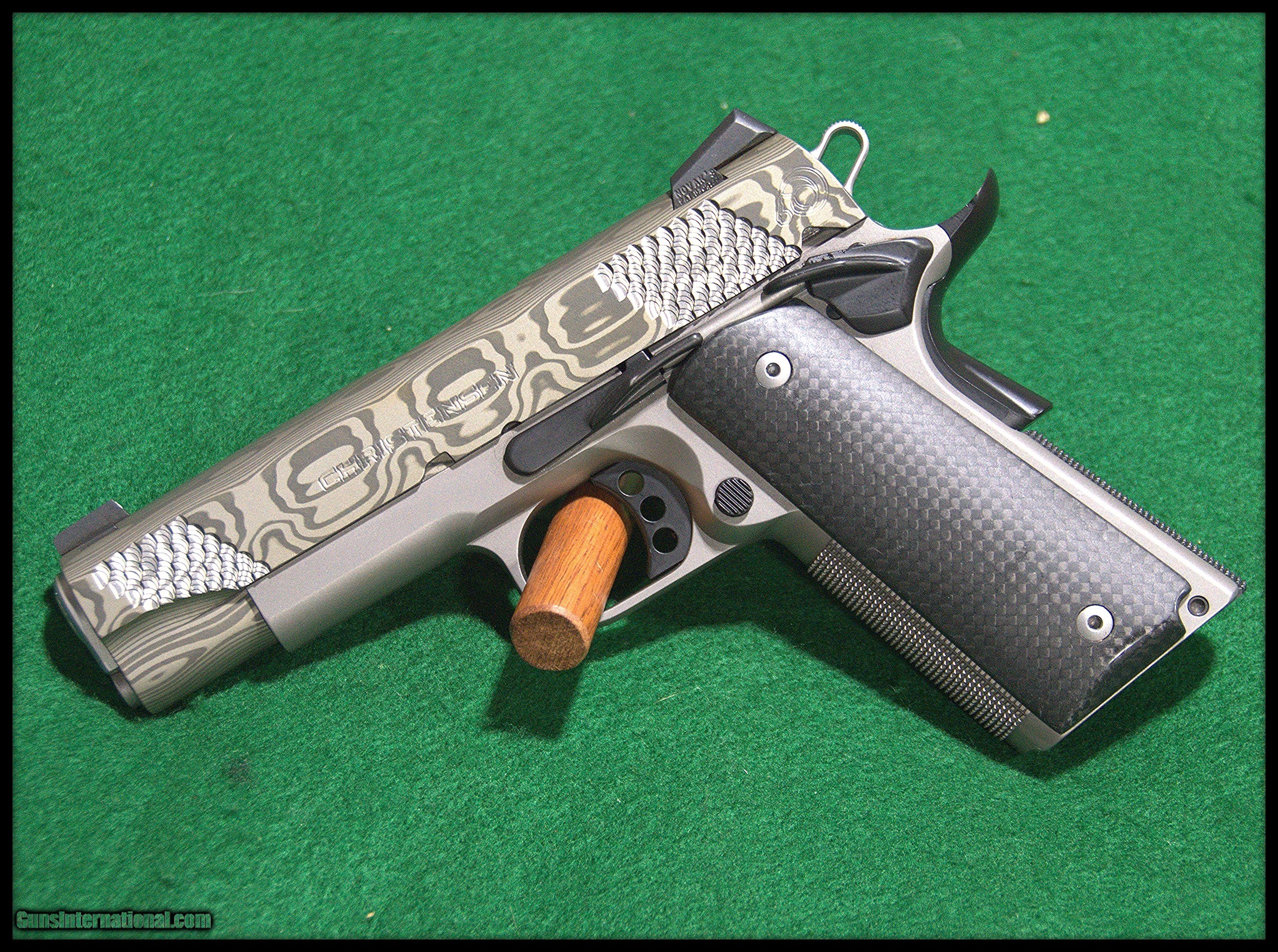 Description: Christensen Arms C4 Damascus Slide 1911 in .45 ACP. No longer produced. 4.25" barrel, Cerakote titanium steel frame with damascus slide. Trijicon Novak Sights, Carbon fiber grip panels. 99+ Condition. Firearm and CA marked magazine only. SOLD Handgun Caliber: .45 ACP (.45 Auto) |