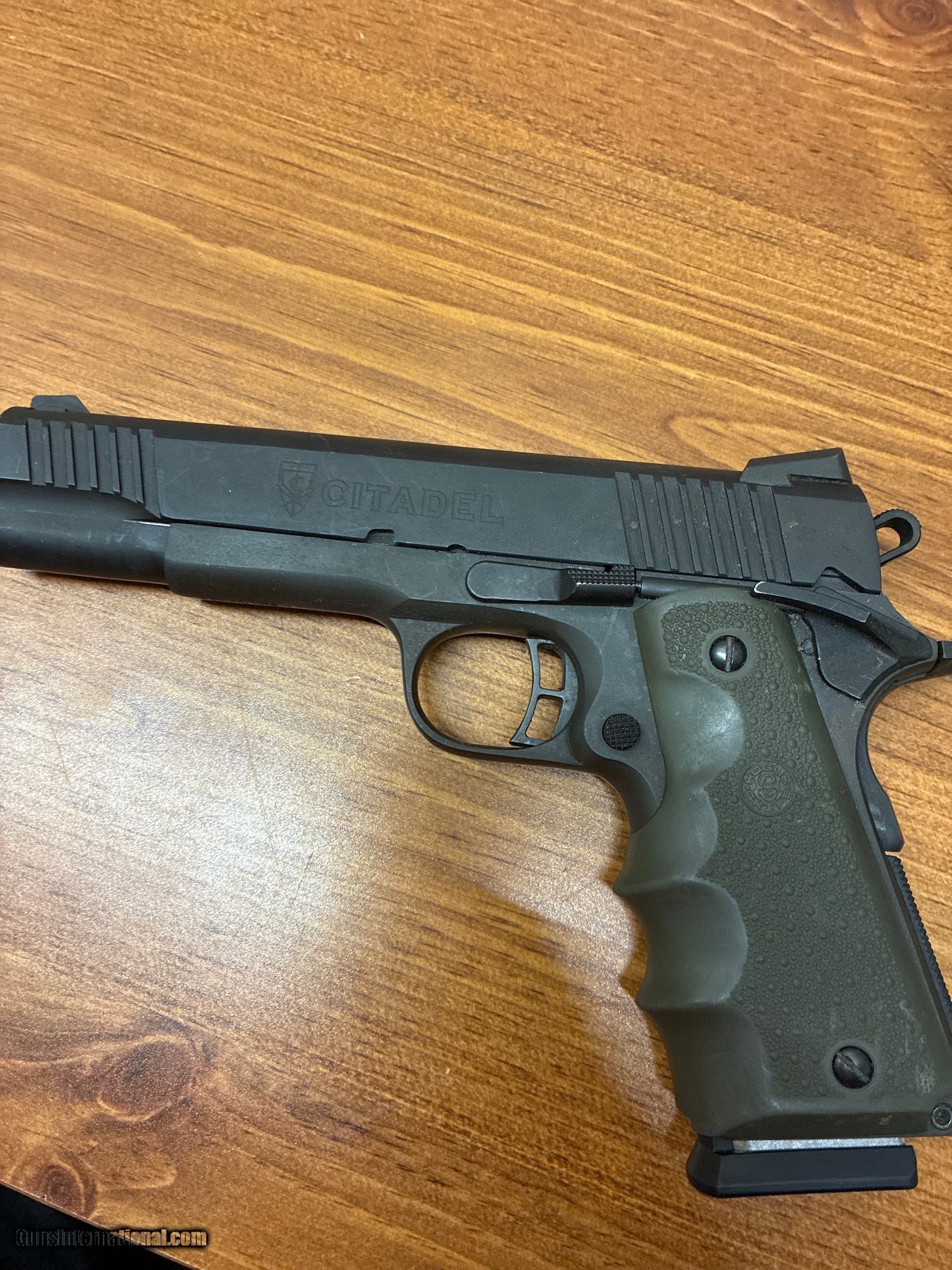 Description: Guns Listing ID: 551290 Has wear and tear on metal Hogue overmolded rubberized grips OD green Wilson combat 8 round mag SOLD Manufacturer: CITADEL Model: M1911-A1 Caliber Info: .45 ACP Condition: Used - Non-Certified Barrels: 5 BARREL Action: SEMI AUTOMATIC Finish: black |