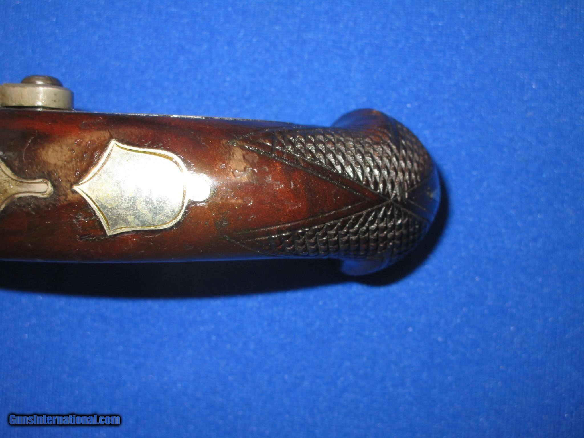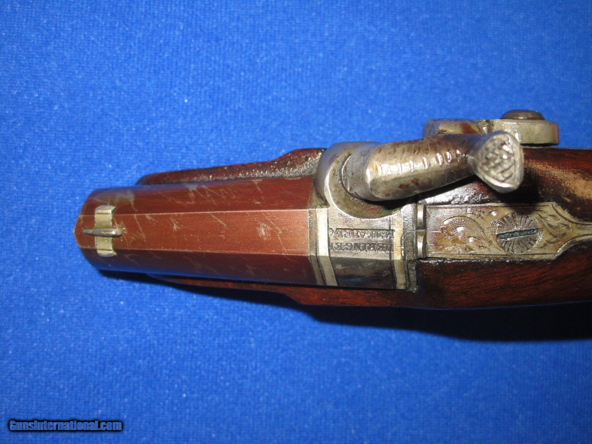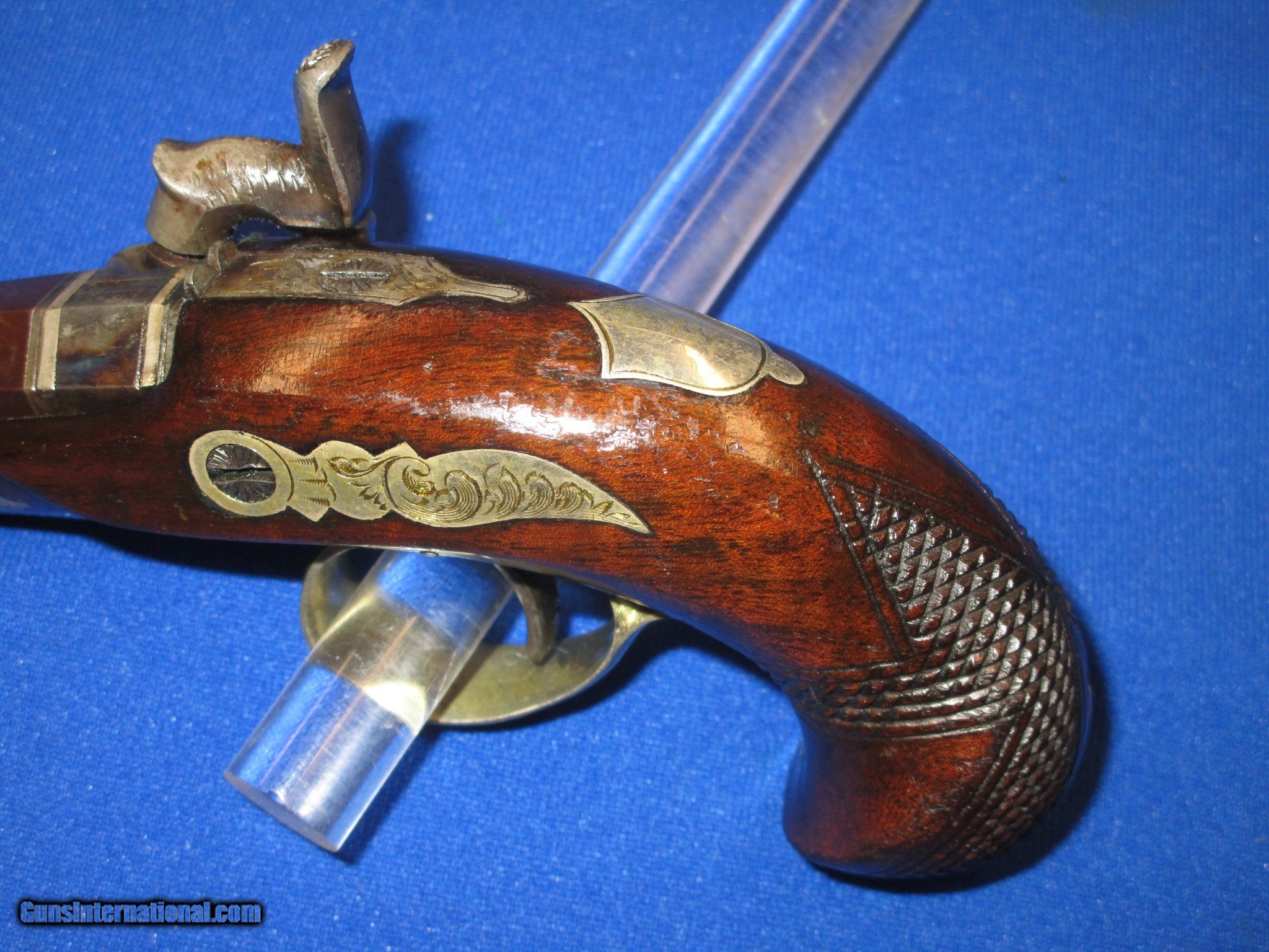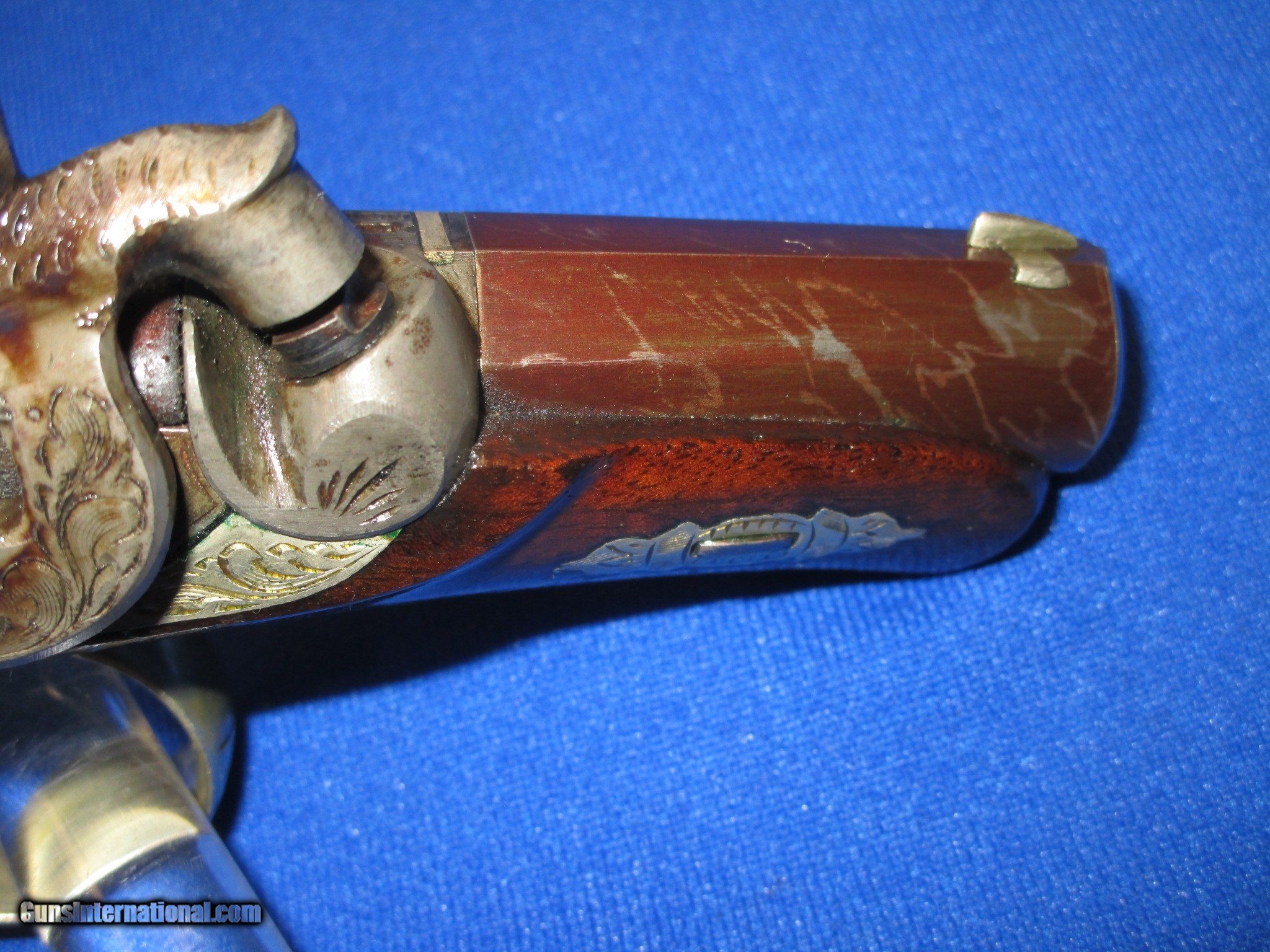 Description: AN EARLY & SCARCE CIVIL WAR TRUE PHILADELPHIA MARKED "HENRY PERCUSSION DERINGER" IN MINTY, UNTOUCHED CONDITION. ALL ORIGINAL & COMPLETE. THE DERINGER HAS MINTY METAL, MARKINGS, & ENGRAVING. IT IS MARKED "DERINGER PHILDELA" ON BOTH THE LOCK & THE BARREL. THE BARREL ON THE GUN IS DOUBLE SILVER BANDED & HAS ALL OF ITS ORIGINAL FACTORY BROWN FINISH WITH ITS STRIPING ON IT. THE GUN IS 5 1/4 INCHES IN LENGTH OVERALL & HAS A 1 5/8 INCH BARREL ON IT. THE LOCK, HAMMER, TANG, & BOLSTER ARE FULLY ENGRAVED & RETAIN THEIR ORIGINAL VIVID CASE COLORS ON THEM. ALL OF THE SILVER FITTINGS ARE ALSO EXCELLENT & ARE ALSO FINELY ENGRAVED. THE WOOD IS EXCELLENT THROUGHOUT WITH VERY FINE CHECKERING. THE DERINGER HAS AN EXCELLENT ACTION & BORE. THIS IS A MINTY CONDITION TRUE PHILADELPHIA PERCUSSION HENRY DERINGER WITH A SMALL 1 5/8 INCH BARREL. THIS IS A VERY DIFFICULT HENRY DERINGER TO FIND ESPECIALLY IN THIS WONDERFUL CONDITION! SOLD Antique: Yes Manufacturer: HENRY Model: DERINGER Barrel Length: 1 5/8 Caliber Info: .41 Condition: MINTY Metal Condition: MINTY Wood Condition: MINTY Bore Condition: MINTY |
