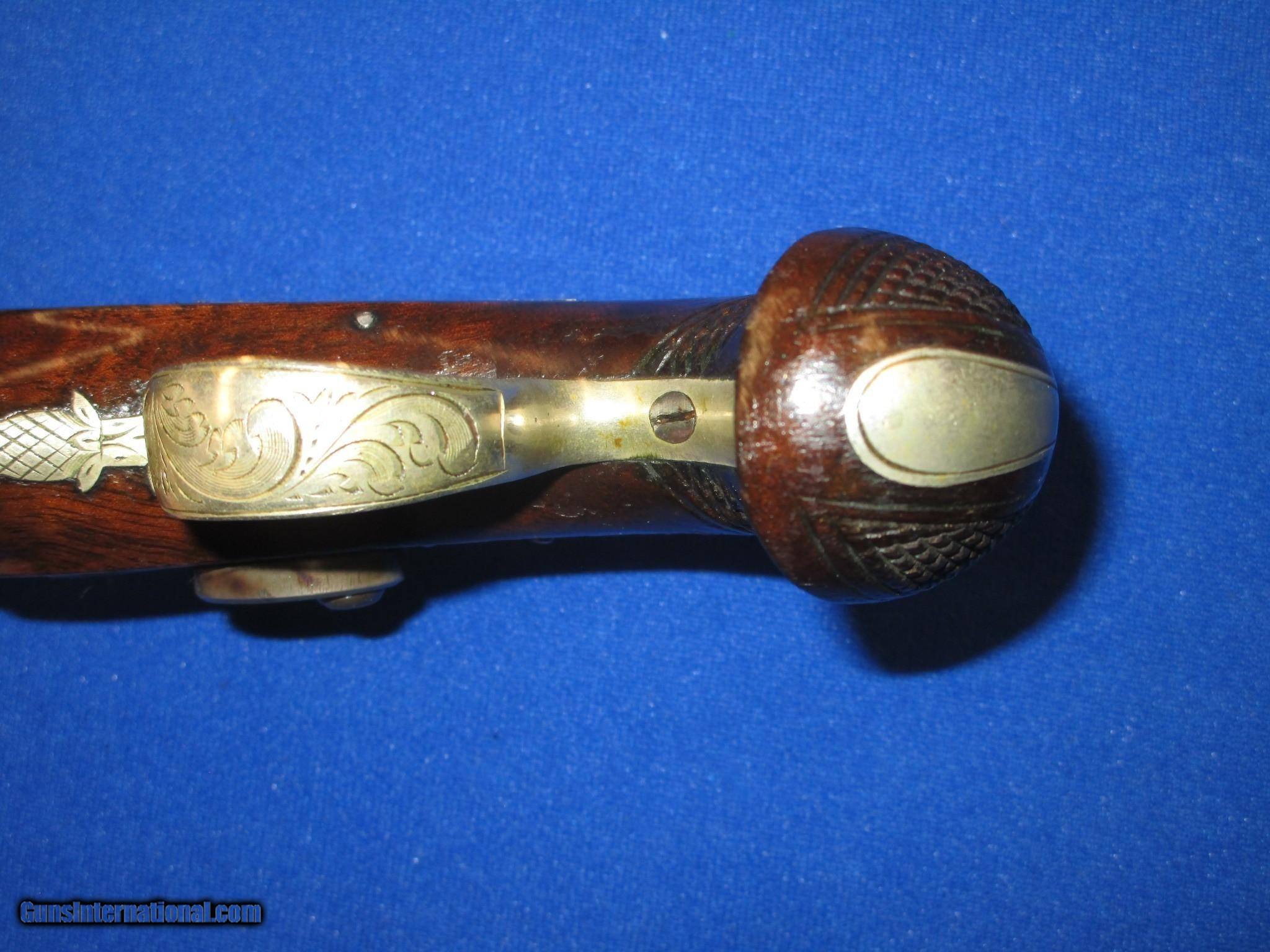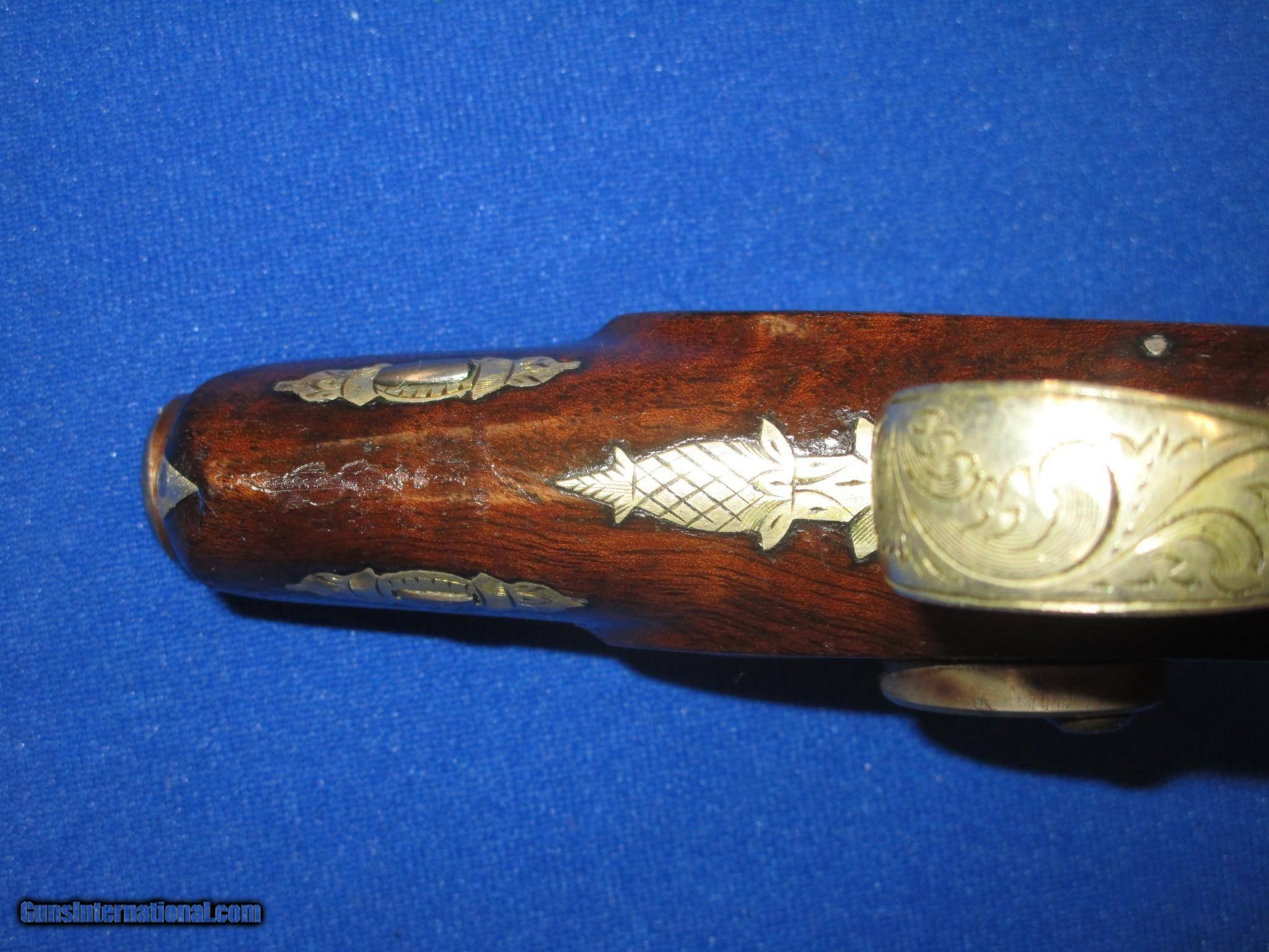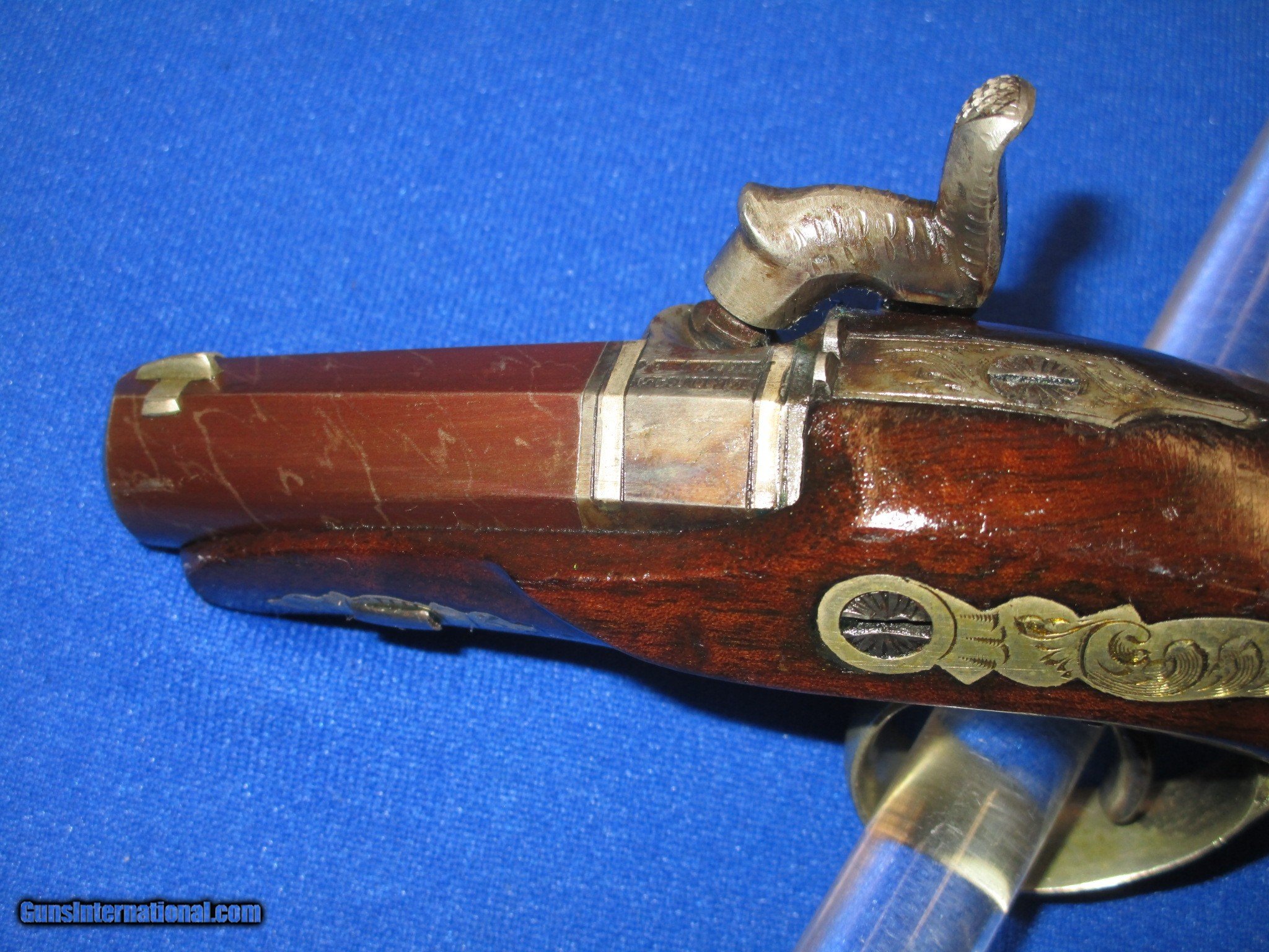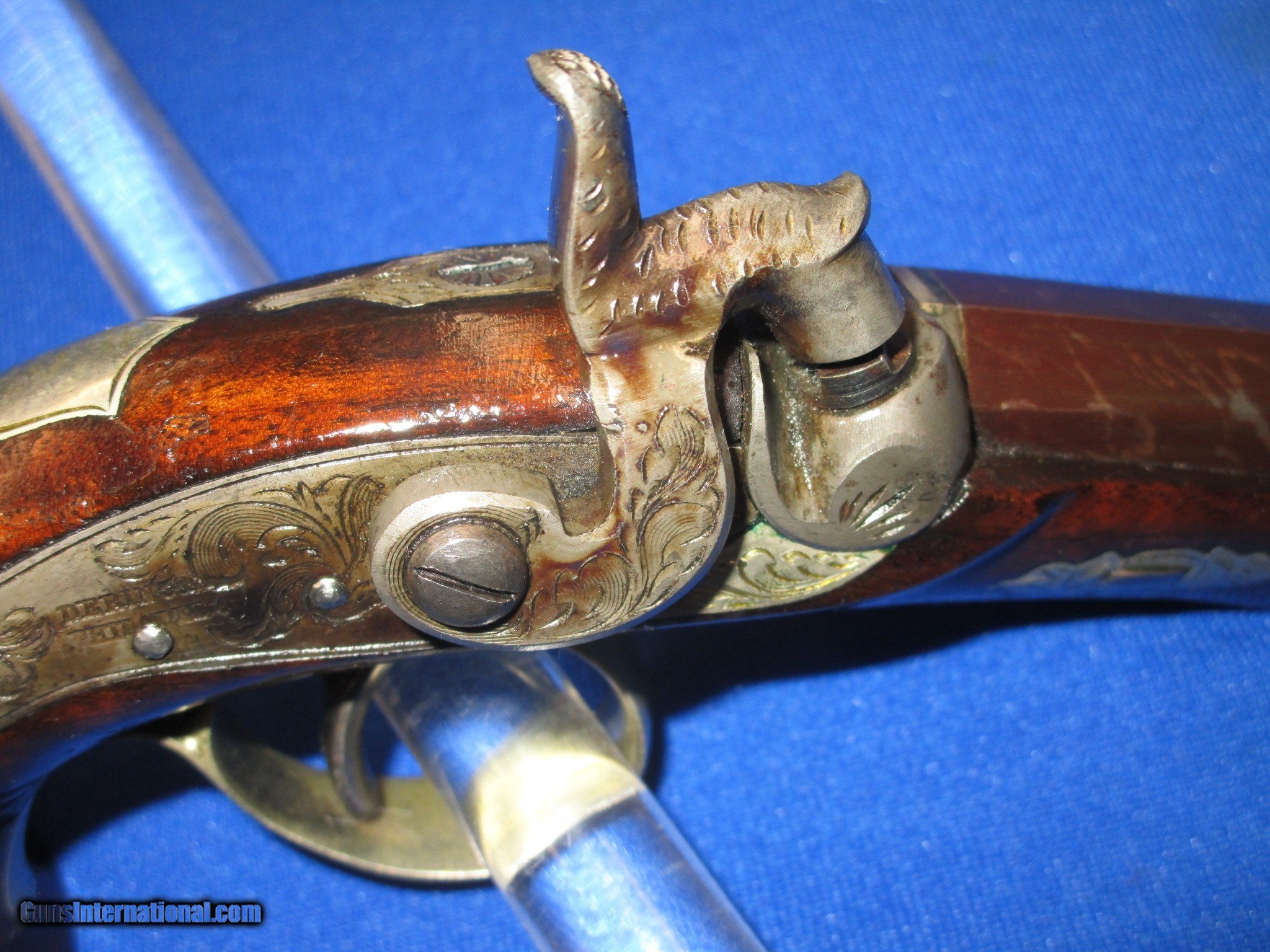 Description: AN EARLY & SCARCE CIVIL WAR TRUE PHILADELPHIA MARKED "HENRY PERCUSSION DERINGER" IN MINTY, UNTOUCHED CONDITION. ALL ORIGINAL & COMPLETE. THE DERINGER HAS MINTY METAL, MARKINGS, & ENGRAVING. IT IS MARKED "DERINGER PHILDELA" ON BOTH THE LOCK & THE BARREL. THE BARREL ON THE GUN IS DOUBLE SILVER BANDED & HAS ALL OF ITS ORIGINAL FACTORY BROWN FINISH WITH ITS STRIPING ON IT. THE GUN IS 5 1/4 INCHES IN LENGTH OVERALL & HAS A 1 5/8 INCH BARREL ON IT. THE LOCK, HAMMER, TANG, & BOLSTER ARE FULLY ENGRAVED & RETAIN THEIR ORIGINAL VIVID CASE COLORS ON THEM. ALL OF THE SILVER FITTINGS ARE ALSO EXCELLENT & ARE ALSO FINELY ENGRAVED. THE WOOD IS EXCELLENT THROUGHOUT WITH VERY FINE CHECKERING. THE DERINGER HAS AN EXCELLENT ACTION & BORE. THIS IS A MINTY CONDITION TRUE PHILADELPHIA PERCUSSION HENRY DERINGER WITH A SMALL 1 5/8 INCH BARREL. THIS IS A VERY DIFFICULT HENRY DERINGER TO FIND ESPECIALLY IN THIS WONDERFUL CONDITION! SOLD Antique: Yes Manufacturer: HENRY Model: DERINGER Barrel Length: 1 5/8 Caliber Info: .41 Condition: MINTY Metal Condition: MINTY Wood Condition: MINTY Bore Condition: MINTY |