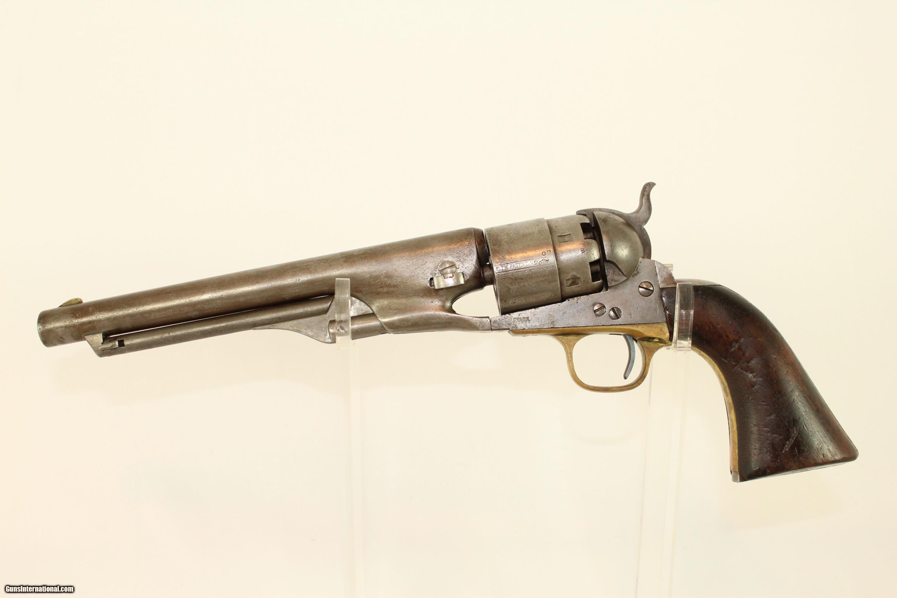 Description: Antique Civil War Colt Model 1860 Army Revolver Great Condition with Matching Numbers Here we present an antique Civil War Colt Model 1860 Army Revolver. The Model 1860 was the single most used pistol of the American Civil War. Over 200,000 were made from 1860 to 1873, and 156,000 were made by the end of the war in 1865. This specimen is in good condition. This gun is numbered 122377, making this Civil War production, and all numbers match. The gun also features a cutout for an attachable shoulder stock. The Naval Battle cylinder scene is still visible. Own the original! This is a legitimate antique and not a reproduction. Barrel is round and 8 inches in length. Caliber: .44 percussion The bore is in good condition and the firing mechanism is functional. Overall condition as seen in photos. Add this fantastic relic of the Civil War to your collection. Very Fast. Very Safe. FREE SHIPPING WORLDWIDE. Delivered directly to your door by express mail! Guaranteed AUTHENTIC & Includes CERTIFICATE OF AUTHENTICITY. ancestryguns #21331 SOLD Antique: Yes |