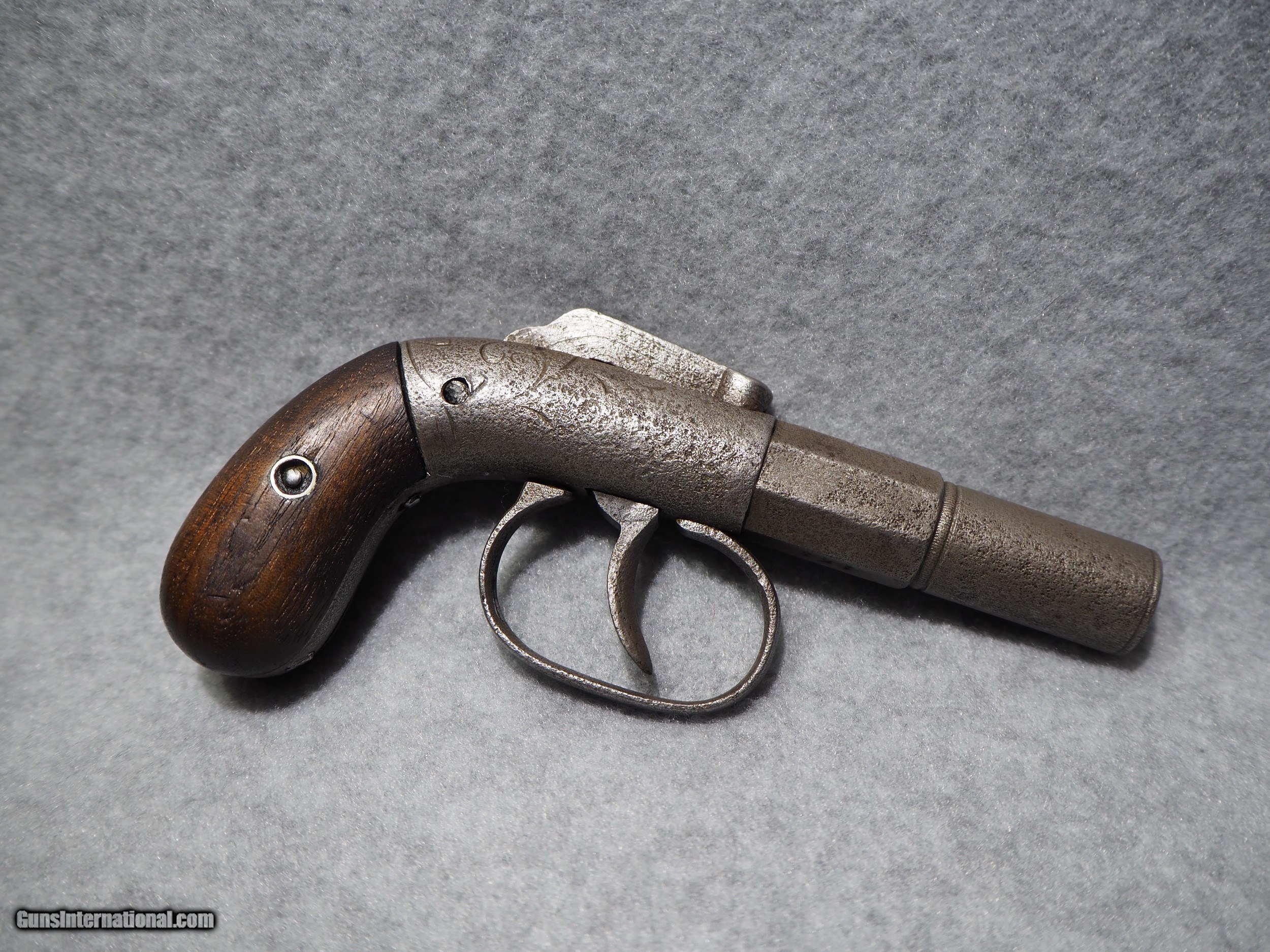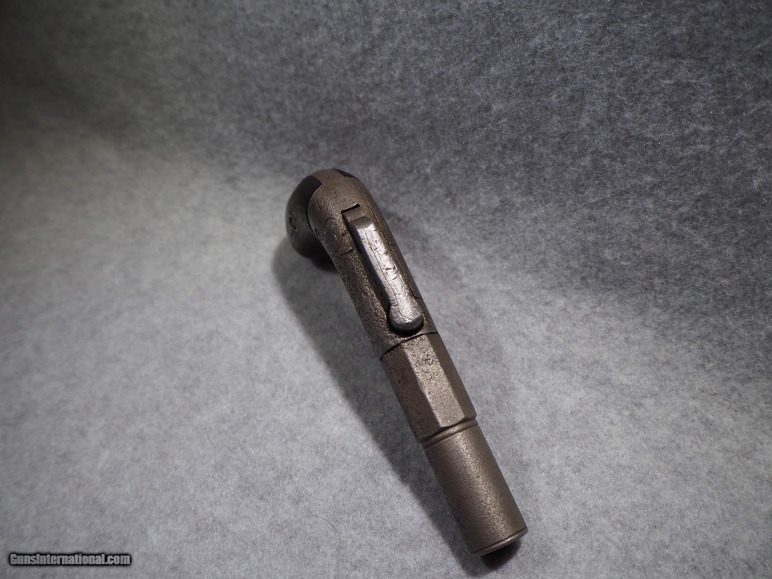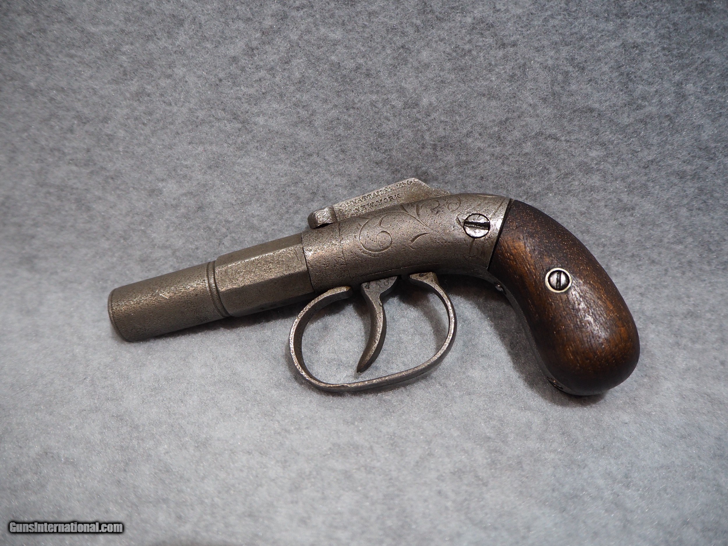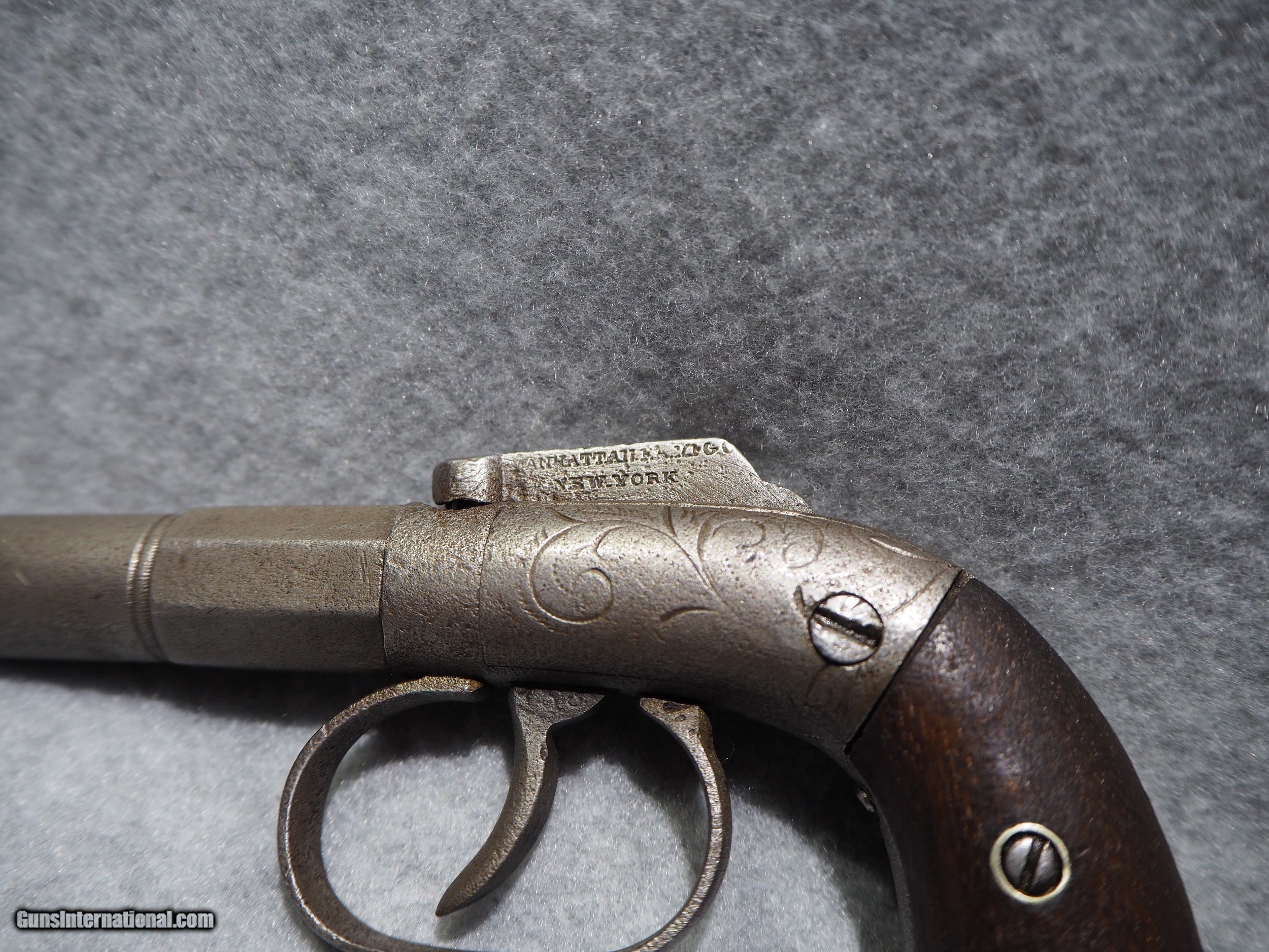 Description: Antique Manhattan Arms Company Bar Hammer Percussion Pistol, made circa 1856-59. The Double Action Bar Hammer single-shot pistol marked Manhattan Fire Arms Manufacturing Company's entry into the pistol-making business in early 1856. The Double Action Bar Hammer made by Manhattan has a distinctive barrel that is half round and half octagon. Even though this pistol was the first effort by Manhattan to manufacture pistols, they had already decided to embellish the gun with hand-inscribed scrolling on both sides of the frame. The bar hammer is marked “MANHATTAN F.A. MFG. CO.” The Manhattan Bar Hammer single shot pistols were manufactured in several different calibers. The barrel lengths may be 2 to 4 inches in length. The Bar Hammer single shot Manhattan pistols are among the rarest of Manhattan handguns. This gun is marked in several places with the serial number 163, indicating this was made very early on in production. There were only around 1500 of these ever made. The overall condition is good. The metal surfaces have an even gray patina. The markings are clear and legible. The walnut grips are in good shape. The bore is dark. The action on this pistol is very strong. This is real! Not a reproduction. Barrel is 2 inches. Caliber: .31 Percussion Overall condition as seen in photos. FREE SHIPPING IN THE US SOLD Antique: Yes Manufacturer: Manhattan Serial Number: 163 |