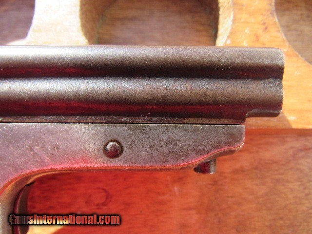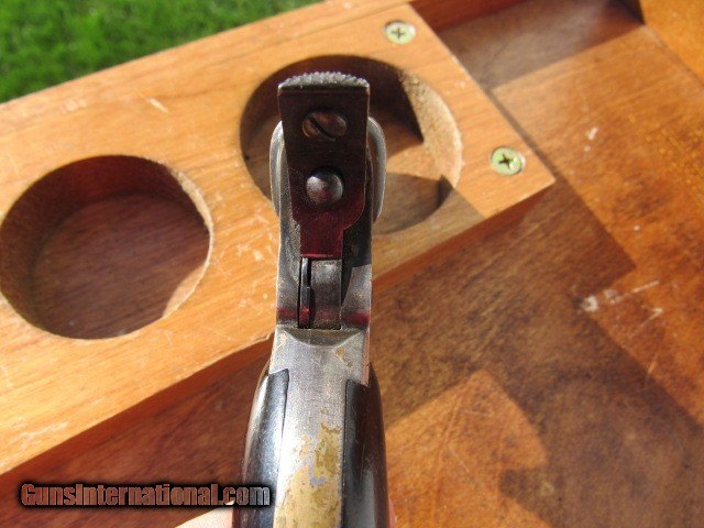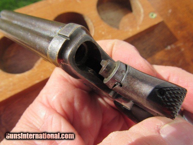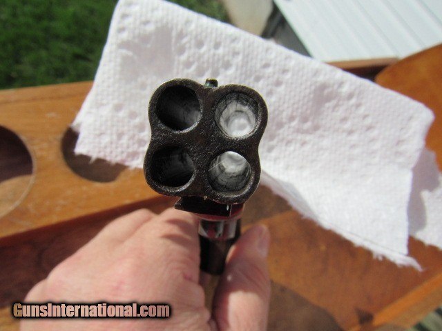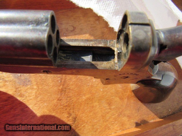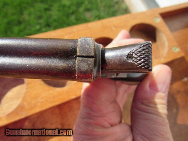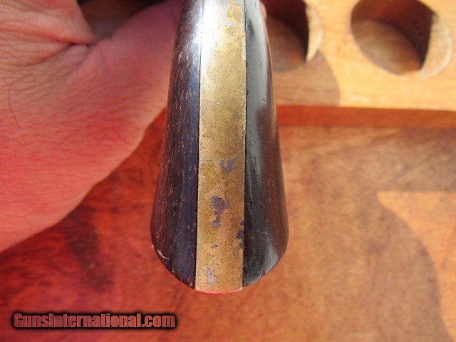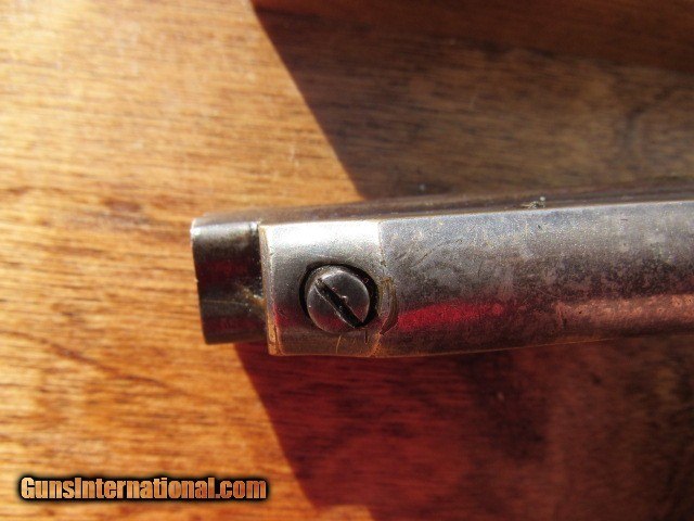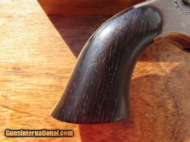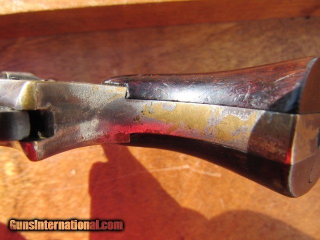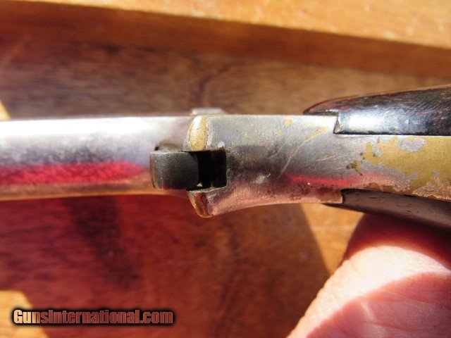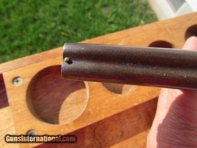 Description: Very good, original C. Sharps patent 4-shot pepperbox, caliber 22 short, with all matching serial number 5933 on frame, underside of barrel, and inside of grips. This is the model 1C made in the early 1860s during the Civil War and was a popular "hideout" gun. Barrel cluster measures 2 1/2" and the measurement from the end of the frame to the muzzle is just over 1/4". This little guy has excellent, original rosewood grips showing only light wear. 80% of the original silver plate remains over the brass frame, and is uncleaned/has tarnished from age. I chose to leave it as is rather than clean it, gives it a good old look. Grip straps are down to 35% silver plate remaining, with the brass a nice mellow mustard patina. Bores are good with decent rifling and typical light black powder fouling. Hammer has positive clicks on both notches. Rotating firing pin works as is should and the hammer spring is strong. Better than average little Sharps pepperbox that would make a great addition to any Civil War era firearm collection. No international sales. Antique so it can ship directly to you assuming your local laws allow it. Sold as a collectible only and not warranted to shoot!! Copy of driver's license required as proof of age. Payment by bank check, money order, personal check, or all major credit cards with 3% surcharge. 3 day non-firing inspection. Buyer pays return shipping. Thanks for looking. 315.251.4799 with questions or concerns. Buying Colt, Winchester, Marlin and other used/antique or C&R firearms. SOLD Antique: Yes Manufacturer: Sharps Model: 1C Serial Number: 5933 Caliber Info: 22 Short Condition: Very good Metal Condition: Very good Wood Condition: Very good Bore Condition: Very good Barrels: 2.5" cluster Action: Revolver Manufacture Date: 1860s Item Location: New York |