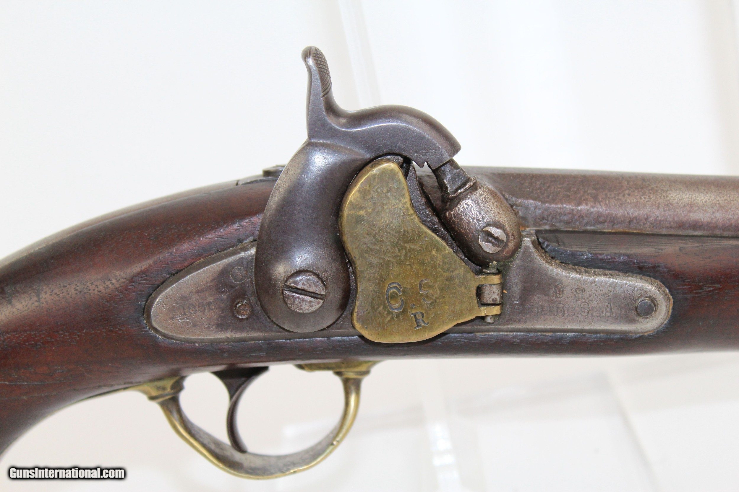 Description: CIVIL WAR Antique U.S. 1855 MAYNARD Pistol-Carbine 1 of ONLY 4,021 Made at SPRINGFIELD for CAVALRY Here we present an antique Springfield Armory Model 1855 Pistol Carbine, made in 1856, five years prior to the outbreak of the American Civil War. Only 4,021 of these were made, making them very rare, especially considering that many would have been lost during the war. The concept was for all U.S. Army troops to have a common caliber, so that logistics would be simplified, and have a (massive) pistol that cavalry could use while mounted, with an attachable stock for use when on foot. The chosen caliber was .58, and it utilized the cutting-edge cone-shaped Minié ball with the hollow base instead of ball. Also relatively new and short-lived was the Maynard tape priming system, to which Springfield had purchased the rights. Instead of directly priming the nipple by hand for each shot, the user would simply install a roll of paper percussion caps, and a single cap would be exposed, sheared and carried by the hammer to detonate on the nipple. Of course, the standard rifle percussion caps could also be used. The ramrod is captive on a swivel, so that it was not easily lost in the field, with a hollow tip for pushing the Minié ball. All of these features were included in this compact package to be issued to Cavalry and some Artillery, and it sounded like a brilliant idea. Then U.S. Secretary of War Jefferson Davis (soon to be President of the Confederate States of America) approved the adoption and production of the entire Model 1855 line of rifles, carbines and pistol carbines. However, reports from the field painted the pistol carbines as rather unwieldy, the tape primer system unreliable, and the carbine stock a detriment to accuracy. By this time, Colt had developed lines of very handy and reliable 6-shot revolvers and a plethora of breech-loading cartridge fed carbines would bring a swift end to production. Nevertheless, these very interesting weapons were very much utilized on both sides during the Civil War and are highly valued in the collector’s market today. The Model 1855 is otherwise distinctive in U.S. Military firearms history for being the last single shot percussion pistol issued, as well as the only pistol other than the Model 1911 made in significant numbers by Springfield Armory. This Model 1855 is dated “1856”. The “SPRINGFIELD” marking on the front of the lock is overstamped with “CSA”. The tape primer door is made of brass and crudely stamped “C.S/R”. The ramrod swivel is absent and the steel ramrod has a trumpet shaped tip. The overall condition is good. The metal surfaces are dark with age. The markings are legible. The walnut stock is smooth and it has been repaired at the wrist, a common faultline on these pistols. The bore is in very good condition with clear rifling. The action is strong. Own the original! This is a legitimate antique and not a reproduction. Barrel is 12 inches. Caliber: .58 Percussion Overall condition as seen in photos. Very Fast. Very Safe. FREE SHIPPING WORLDWIDE. Delivered directly to your door by express mail! Guaranteed AUTHENTIC & Includes CERTIFICATE OF AUTHENTICITY. ancestryguns $2575 #7035 SOLD Antique: Yes |