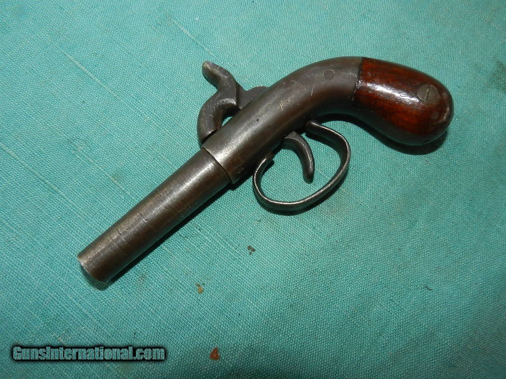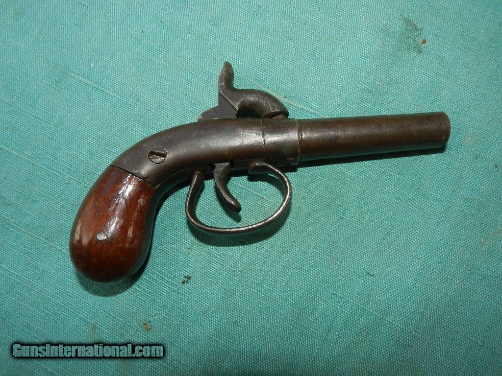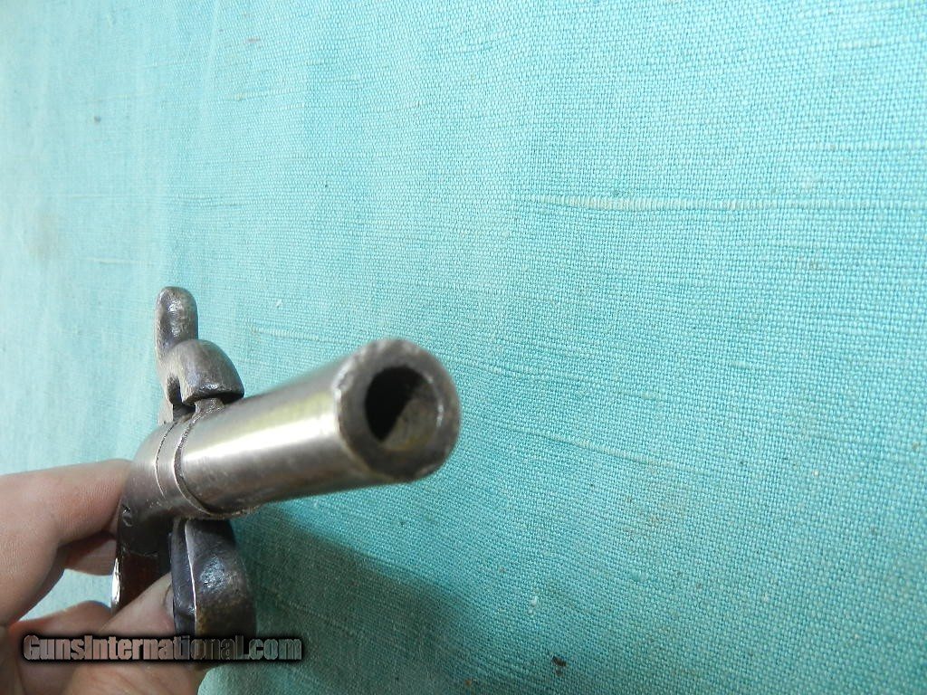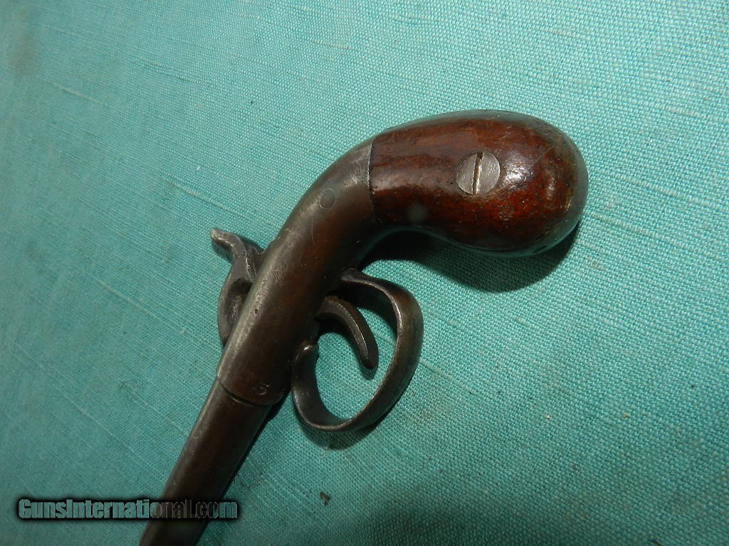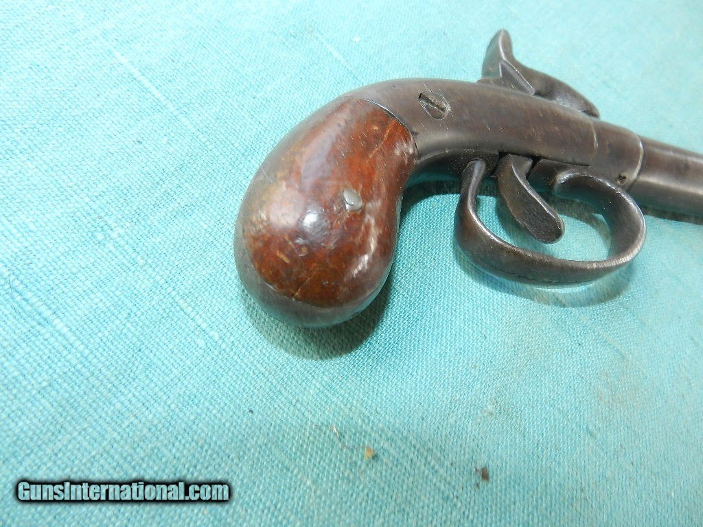 Description: SOLD A 19th century .30 cal percussion boot pistol of about 5 3/4" length and a round barrel od about 2 1/2" long. The walnut bag grips are very good and solid . The nipple is a bit mashed . Exterior metal is grey/blue and this gun has a sn of 563 and no other markings. Lock works well with a single full cock. a handy palm side pistol often carreid by Civil war spiesas a hide away in the boot. When buying a gun always have it examined by a competent gunsmith before shooting. To buy a gun from me you must get a direct email for me, with details, and shipping cost. We don’t have a web site .I prefer money orders or a check. Item ships when funds come in. I try to keep guns affordable, which means I make less money than most dealers. You won’t get altitude sickness, or nose bleed, with my prices! I consistently have the best selection of older guns If you attempt to buy, you must still contact us for details . Best to email to buy. Sometimes a local person can stop buy and purchase before the gun is removed. Sometimes not home to get calls. Some guns are required shipment to a gun dealer near you for a transfer to you when it arrives. Otherwise many older or black powder guns ship to your door. With the widest selection of older guns at great prices, We don’t have a store, and sell on the internet only. I’m easy to get along with. Thank You. SOLD Antique: Yes |