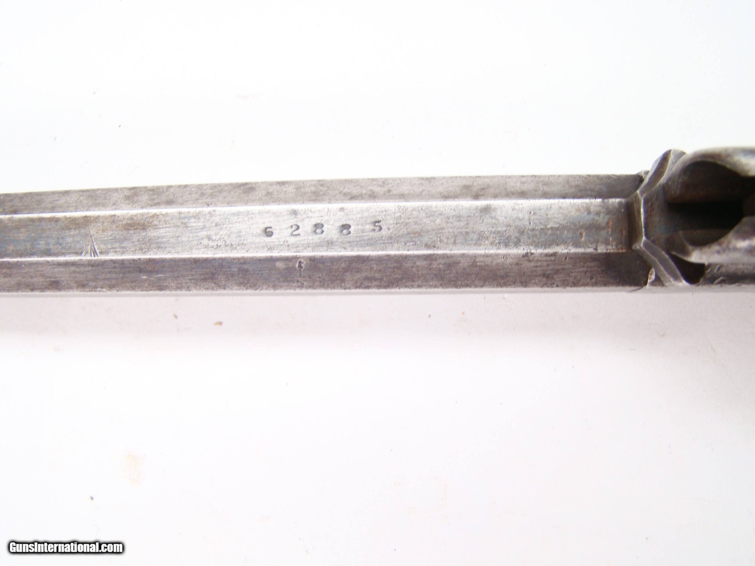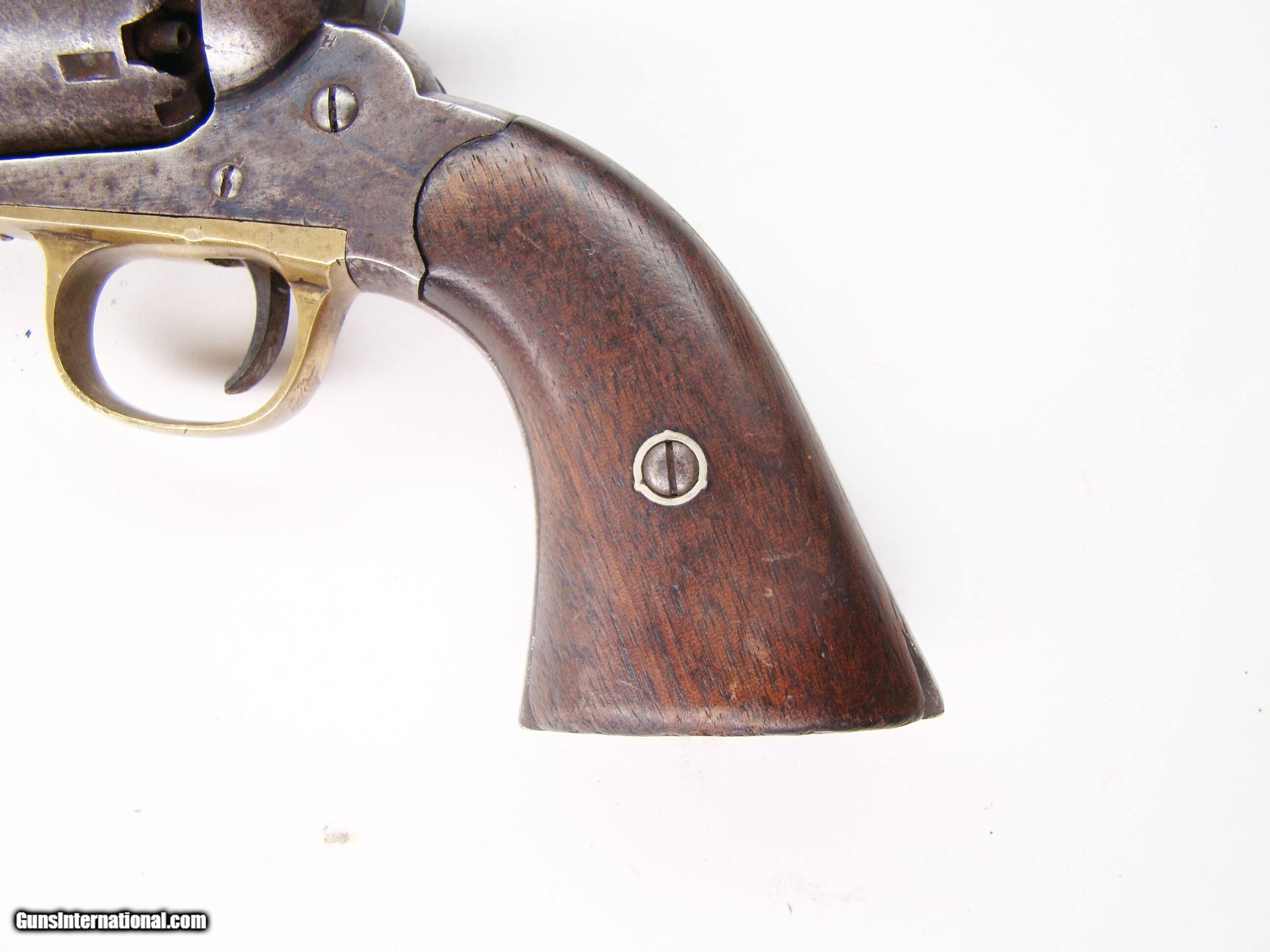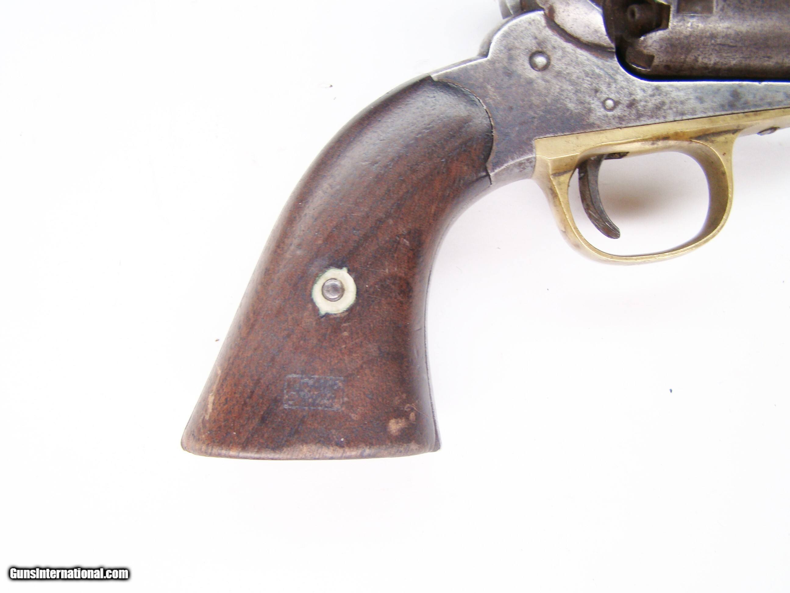 Description: Remington New Model 1858 Percussion Revolver 44 cal Bore Exc, Mech Exc tight crisp action, Has original wood grips with excellent cartouche on the right side. Has an original 8” Oct barrel with original front sight and has a VG mostly visible but weak in the center Remington address and New Model markings .Serial# 62885 Mfg’d 1863 puts it in the middle of the Government order which ended around 119,000. Has inspector initials in several places. Metal overall has an aged grey patina finish with traces of some very fine pitting. Antique: Yes Price: $1,795.00 Contact Seller |