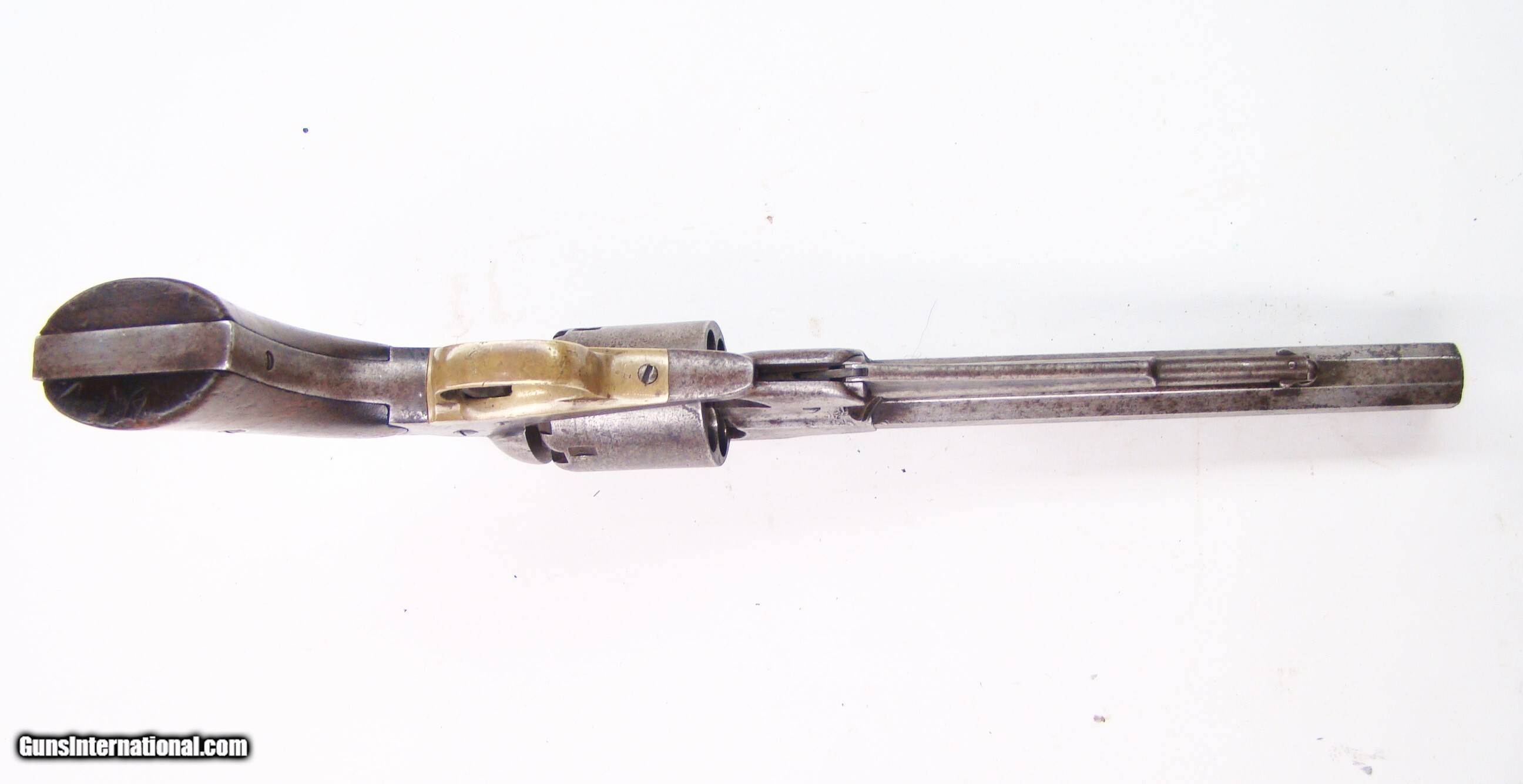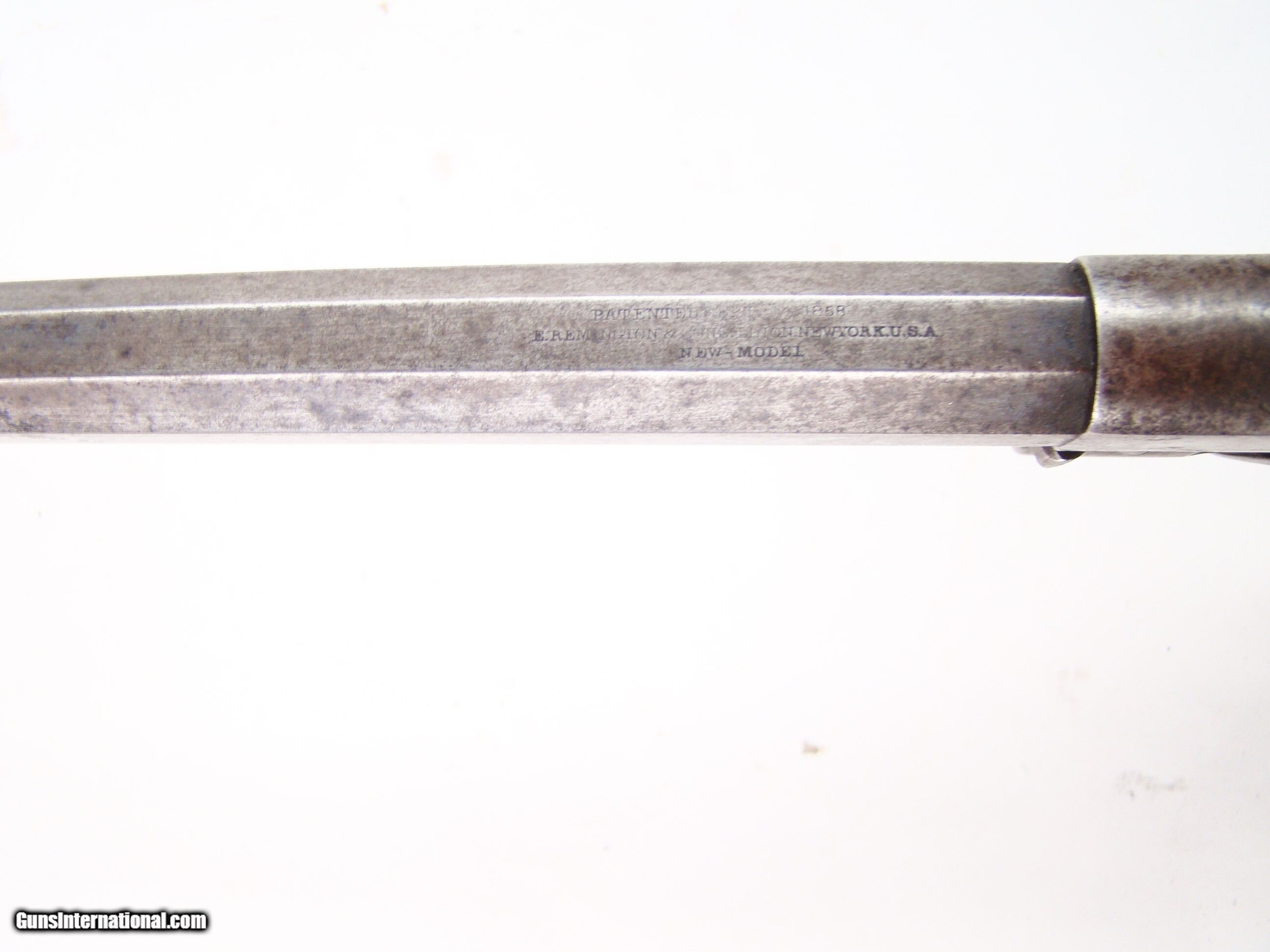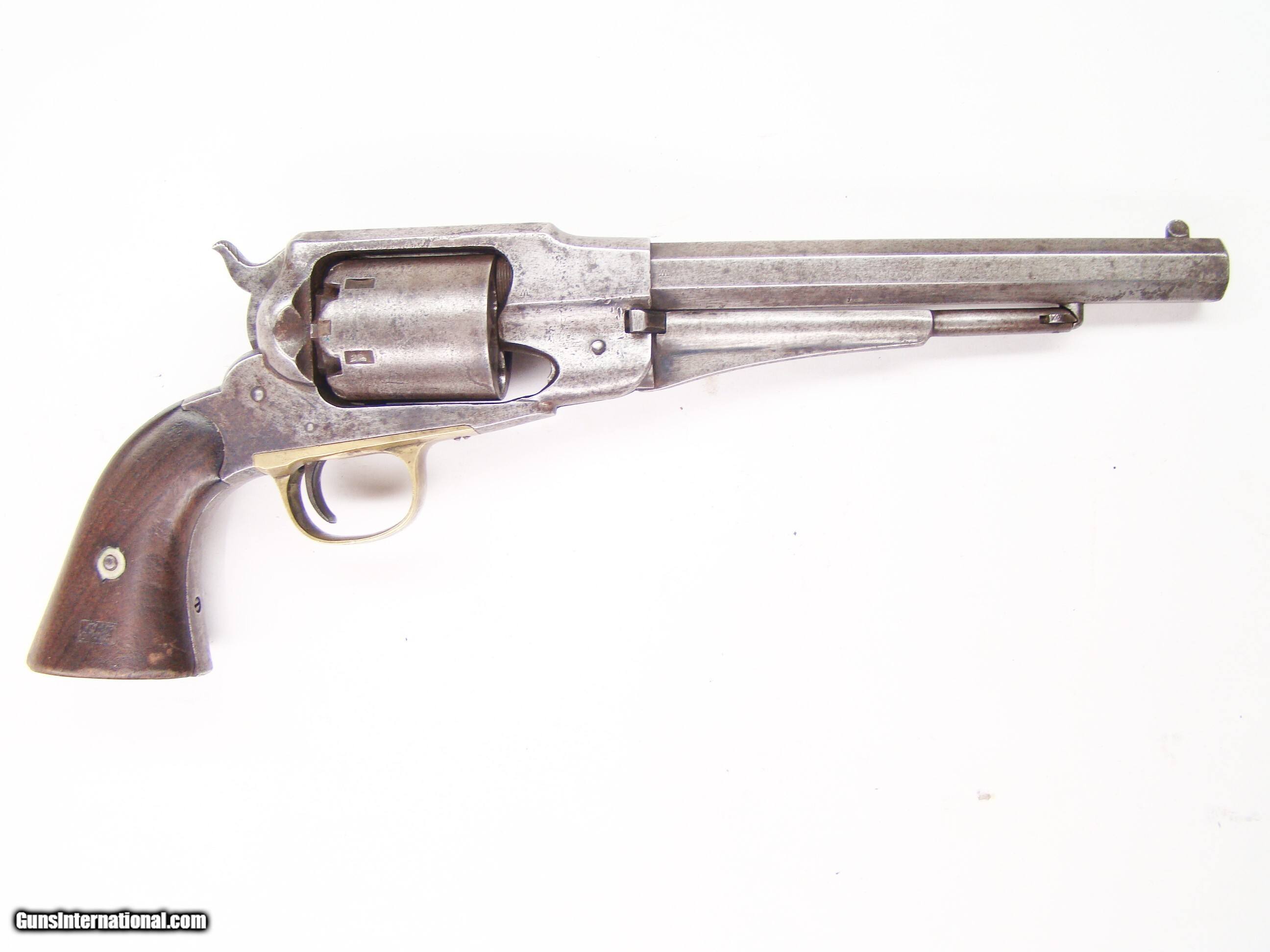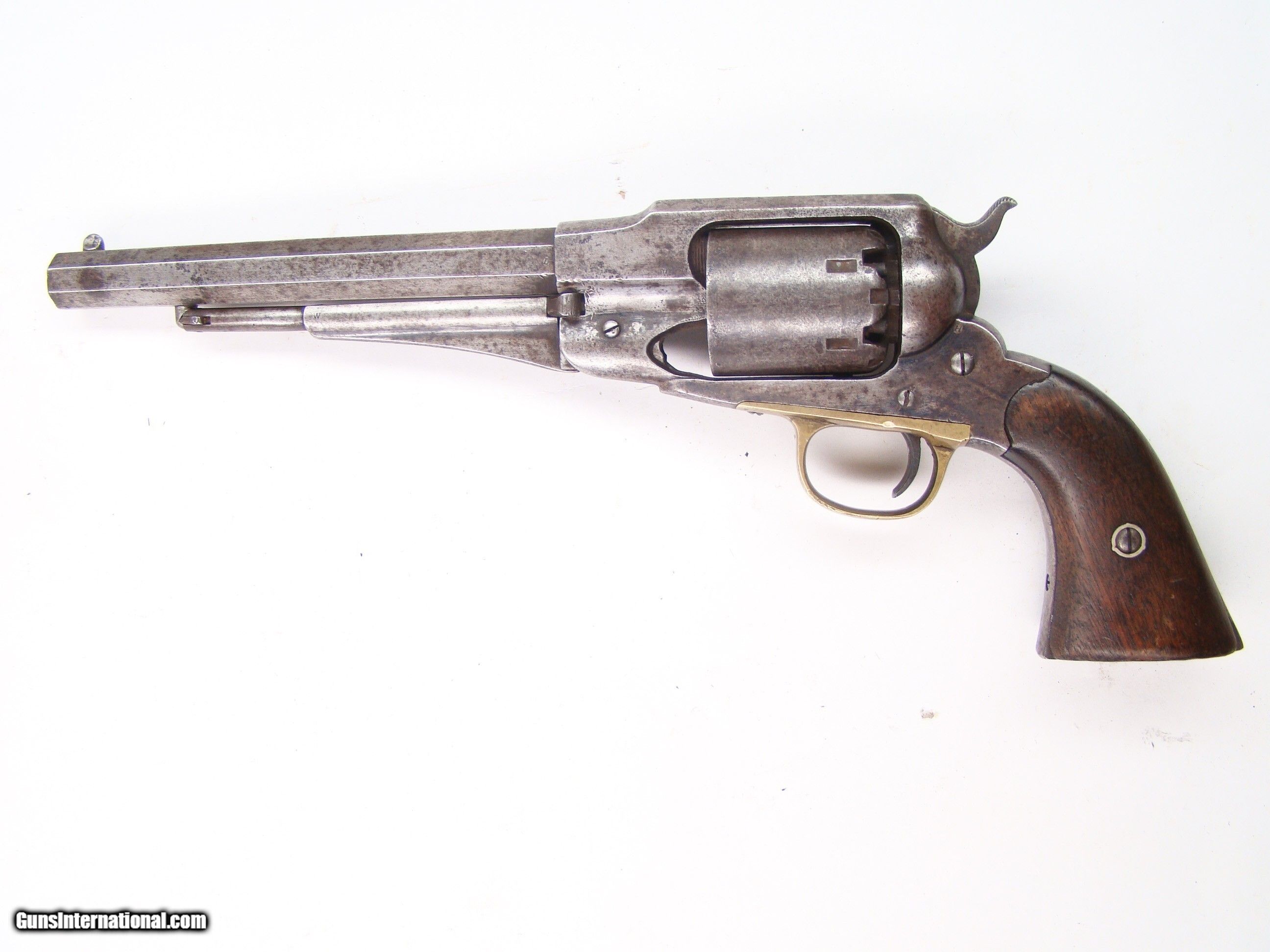 Description: Remington New Model 1858 Percussion Revolver 44 cal Bore Exc, Mech Exc tight crisp action, Has original wood grips with excellent cartouche on the right side. Has an original 8” Oct barrel with original front sight and has a VG mostly visible but weak in the center Remington address and New Model markings .Serial# 62885 Mfg’d 1863 puts it in the middle of the Government order which ended around 119,000. Has inspector initials in several places. Metal overall has an aged grey patina finish with traces of some very fine pitting. Antique: Yes Price: $1,795.00 Contact Seller |