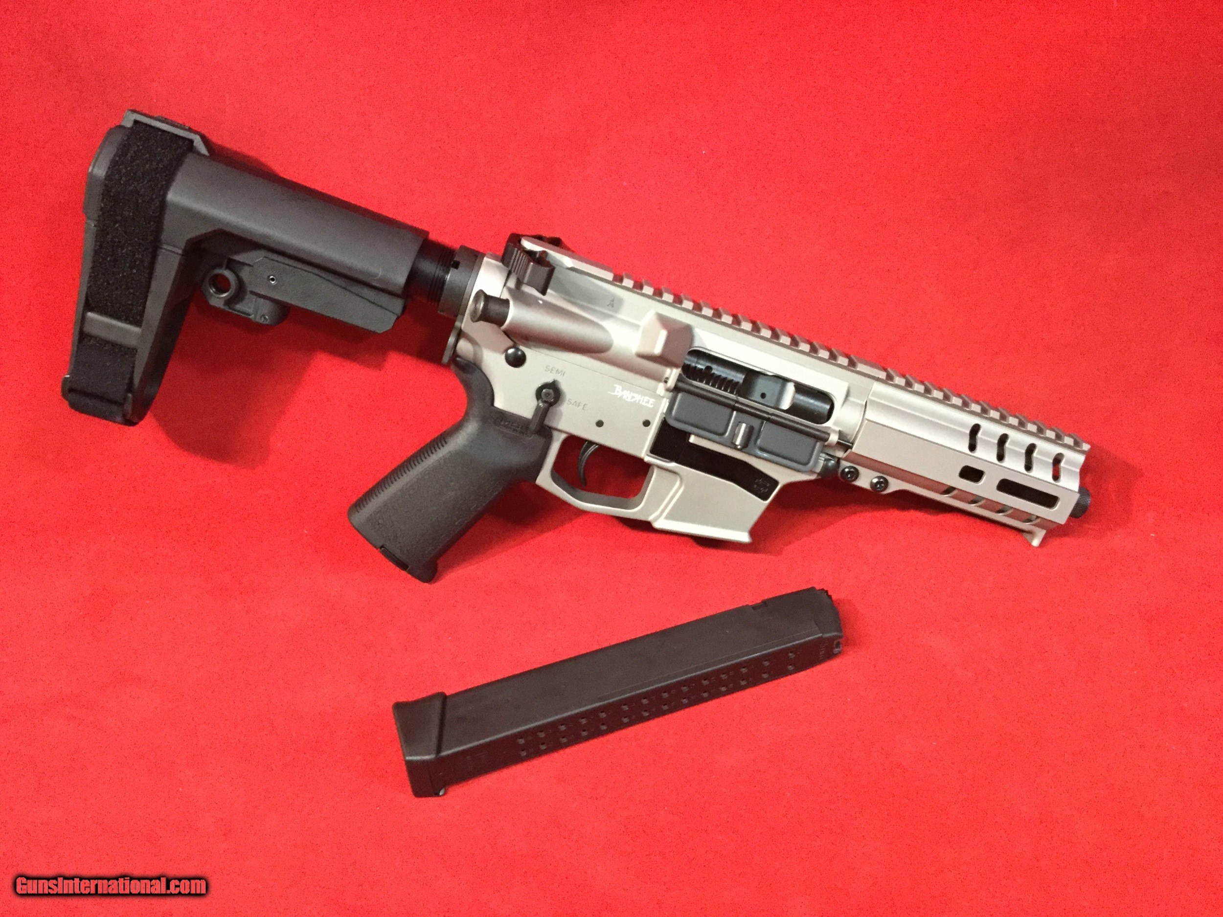 Description: ~~NEW~~ CMMG Banshee 300 9mm Luger 5" Titanium Cerakote 6 Position RipBrace Stock MFR# 99A172FTI. $1499.99 plus $40.00 insured and shipped to your FFL dealer. Add 4% for credit card payments. "The Banshee 300 is the lightest and most compact AR pistol firearm. It features 7075-T6 aluminum receivers, single-stage trigger, CMMG ambidextrous safety selector, and a CMMG ambidextrous charging handle. The barrel has a nitride finish. The Banshee 300 also has a M-Lok free-float handguard and Cerakote finish. This MKGS model features an 5" medium taper barrel, Magpul MOE grip, CMMG 6 position RipBrace, integrated trigger guard, and a 33-round Glock style magazine." --Sports South SOLD |