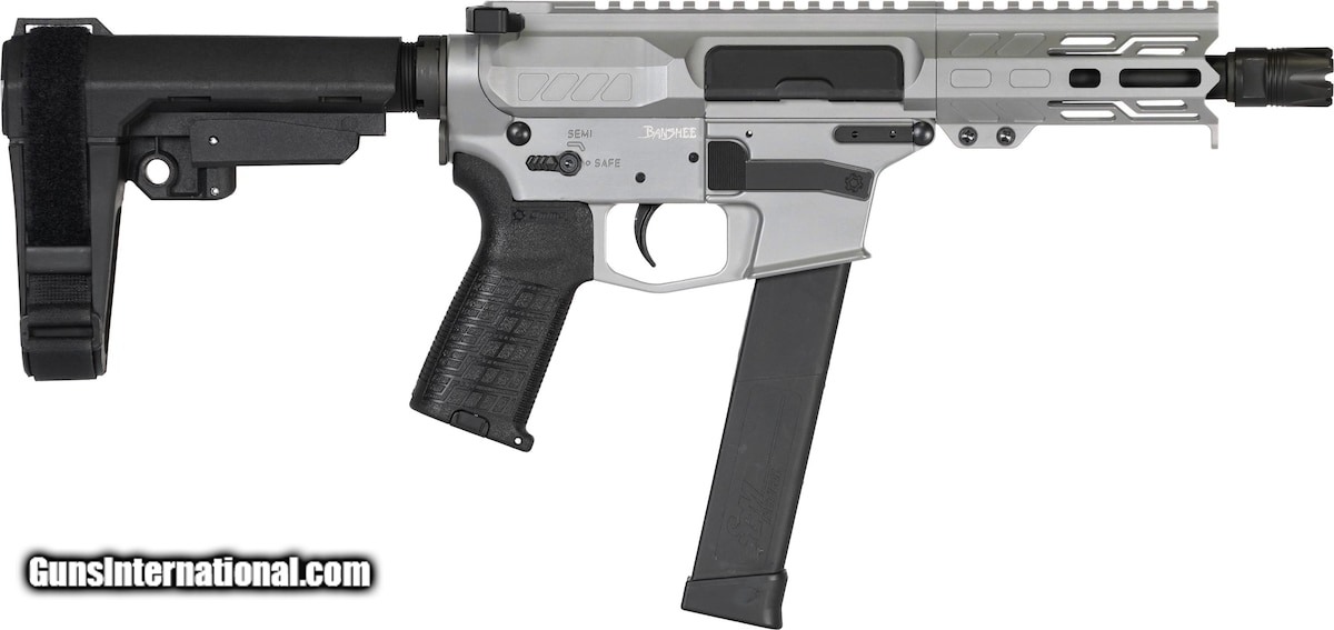 Description: Guns Listing ID: 503609 If you want the best an AR has to offer, then the Banshee MKG is your choice. This AR is fitted with every desired feature including a choice of various Premier Cerakote colors, laser engraved model name on the lower receiver, updated ambidextrous controls and sling points along with a Zeroed Linear grip and Compensator. This pistol also includes a CMMG RIPBRACE. These are just a few of the possible upgrades on this series. Chambered in 9mm & 45 ACP, these pistols are ready for the range. The MkG platform accepts Glock 45ACP-style magazines and features a unique magazine release. Banshee MKG Gen 2 Pistols come with CMMG‚‚s own brand of compensator & pistol grip called \"Zeroed Linear\". The RML4 M-Lok Handguard is also made by CMMG SOLD Manufacturer: CMMG Model: BANSHEE MKGS Caliber Info: .45 ACP Condition: new Barrels: 5" barrel Finish: TITANIUM-CERAKOTE |