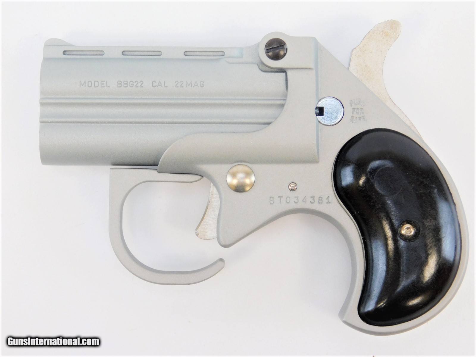Description: BRAND NEW IN THE BOX AND READY TO SHIP! BUY IT NOW!! Manufacturer: Bearman / formerly Cobra Enterprises Model: Big Bore Derringer SKU: BBG22SB Action: Break Open Caliber: .22 Magnum Barrel: 2.5" Capacity: 2 Rounds Frame: Alloy Finish: Satin Grips: Black Synthetic Sights: Fixed Overall Length: 4.65" Weight: 14 oz Big Bore Derringers have more than 100 years of popularity and they continue to top the charts in sales today! From the the Cowboy Action Shooter to the Harley Davidson rider, there’s a Derringer to fit your personality. Cobra Derringers are beautifully handcrafted with a wide range of calibers and barrel lengths. KNOW YOUR LOCAL AND STATE LAWS!! ORDERS WILL ONLY BE ACCEPTED FROM US RESIDENTS OF THE LOWER 48 STATES, ALASKA AND HAWAII. OUR FFL CLASS DOES NOT ALLOW FOR THE EXPORT OF FIREARMS, THEREFORE WE CANNOT SHIP OUT OF THE US. IF YOU ARE INTERESTED IN PURCHASING THIS ITEM, PLEASE COMPLETE YOUR ORDER BY REFERRING TO THE "SELLER'S INFORMATION" ABOVE. SOLD Handgun Caliber: .22 WMR (.22 Magnum) |