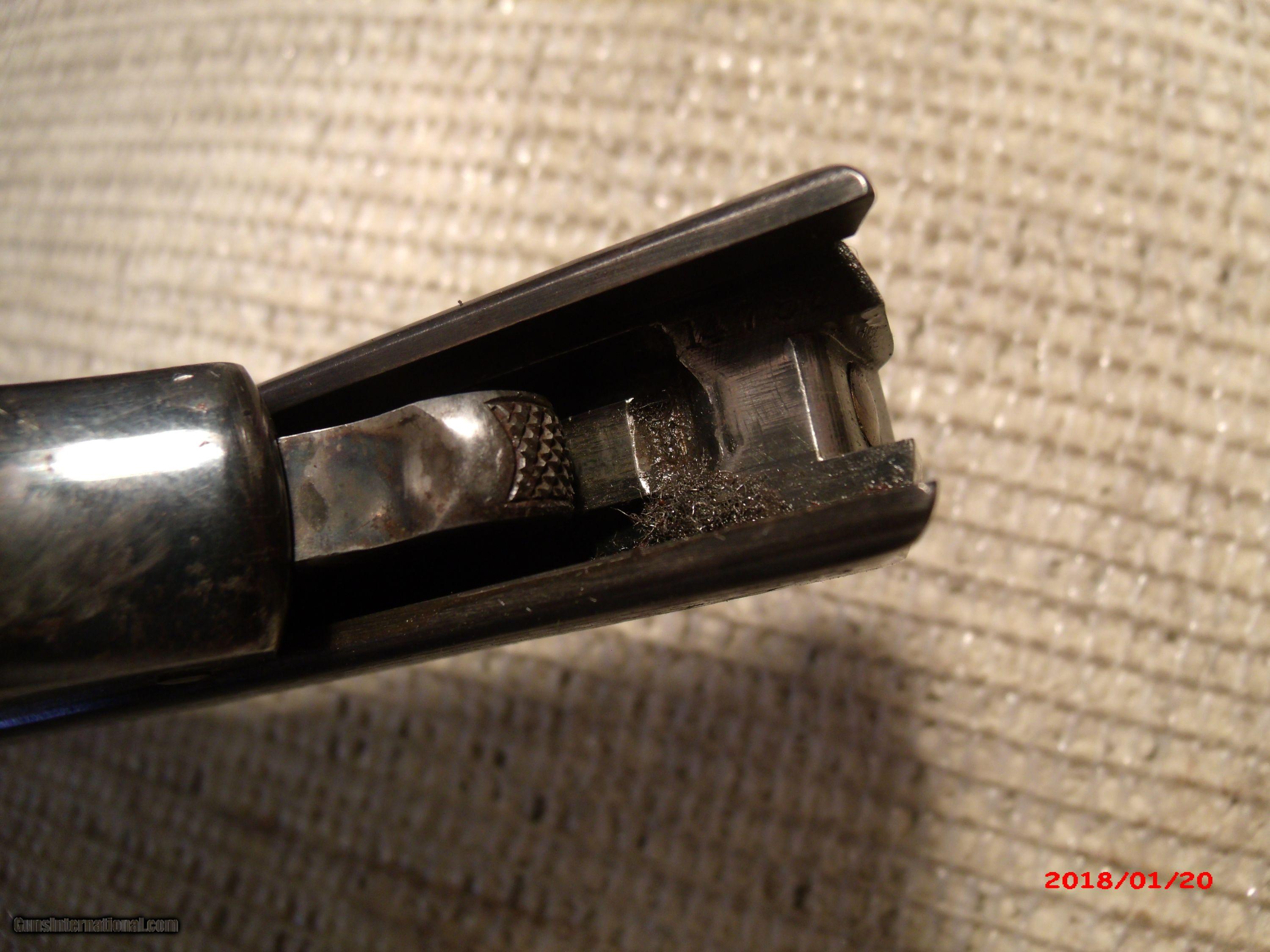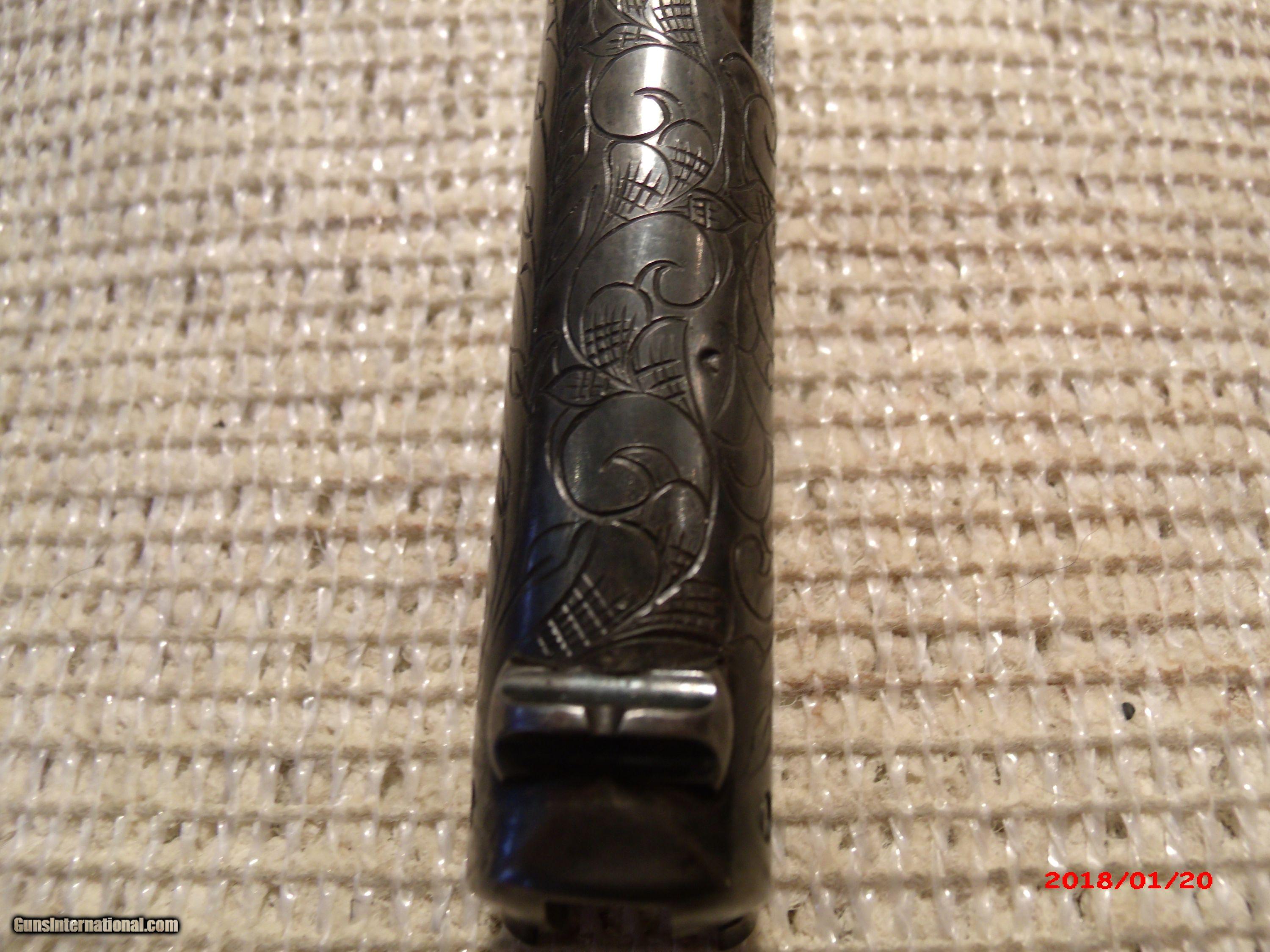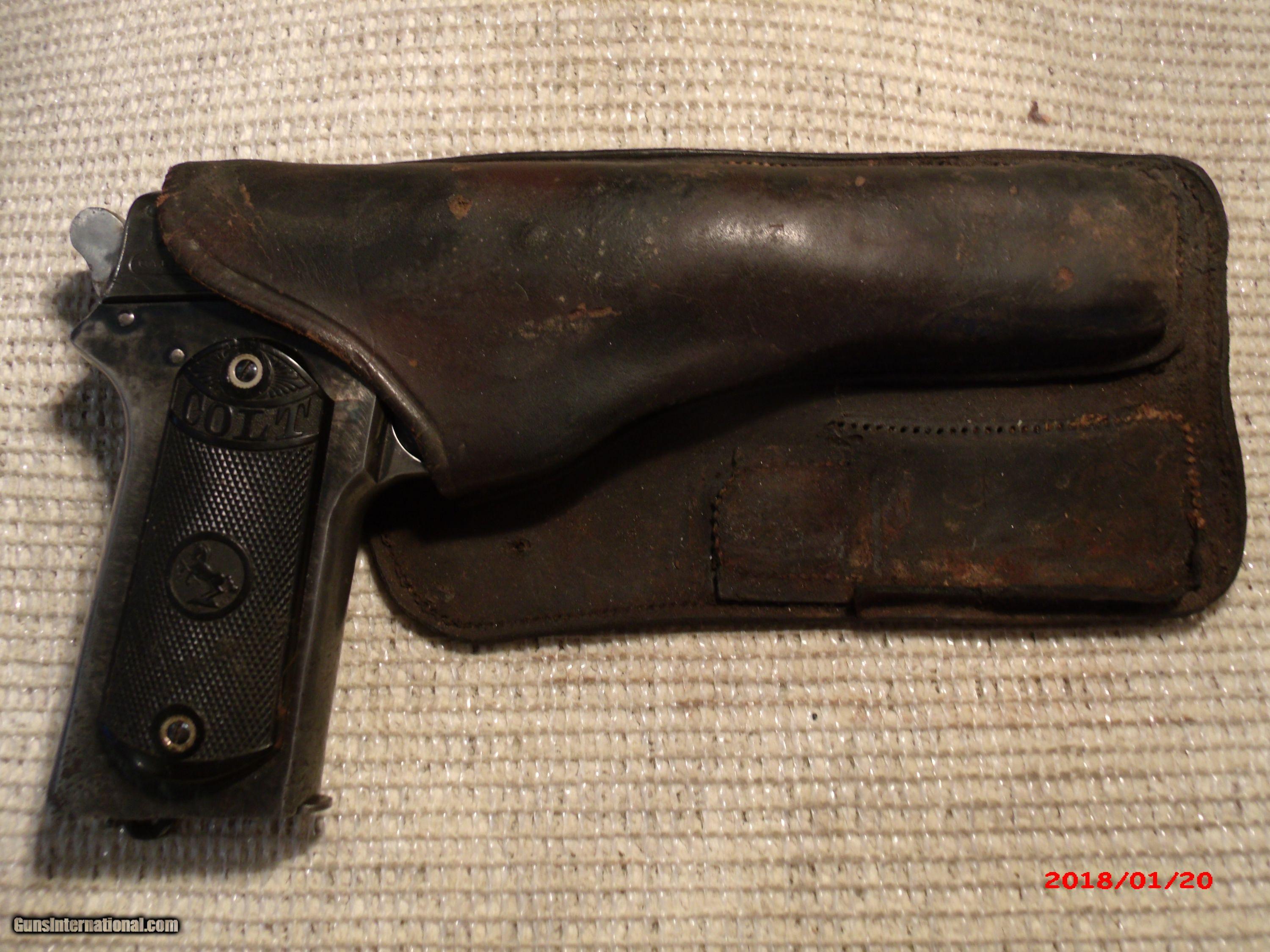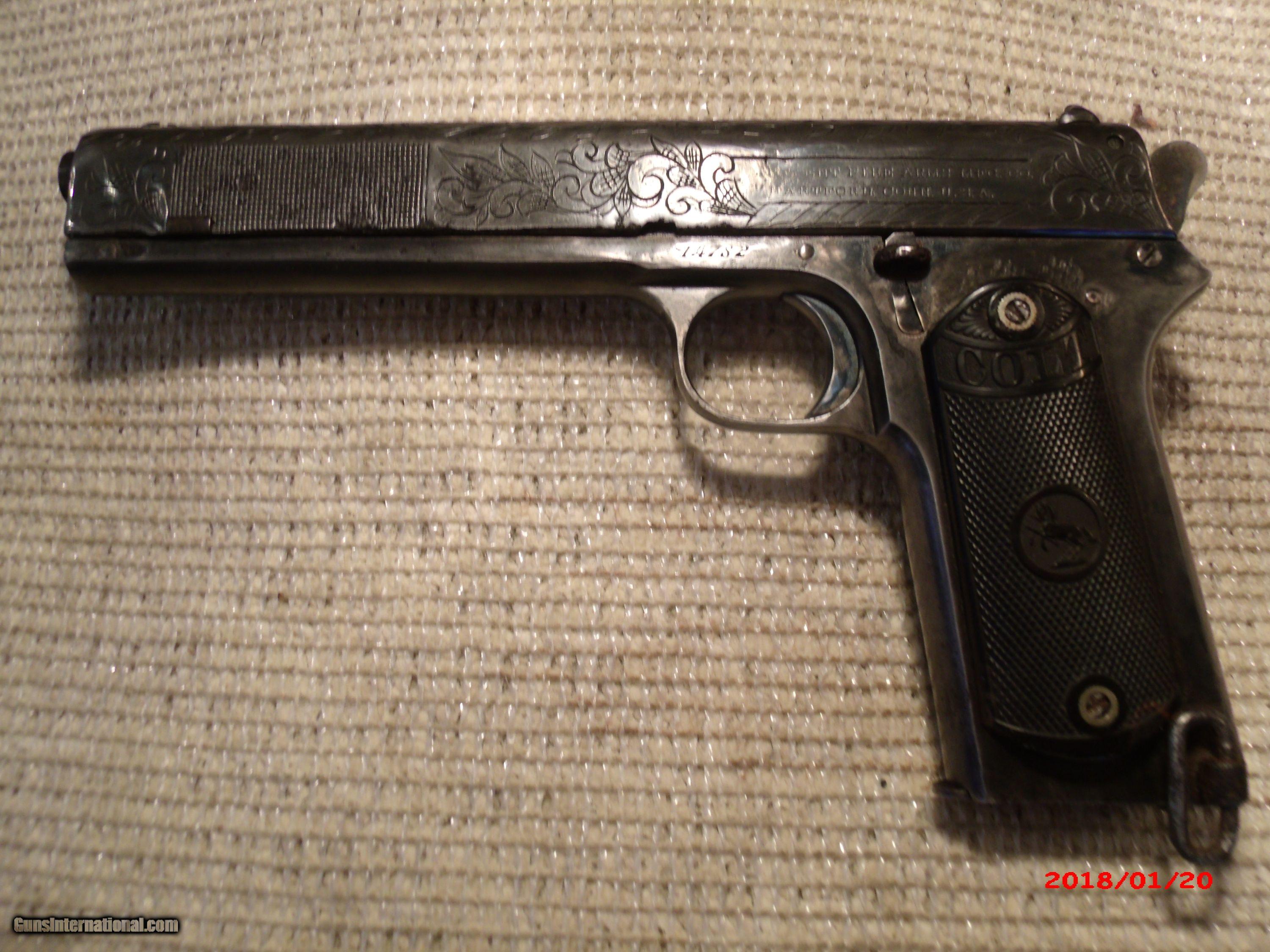 Description: Colt 1902 Sporting Model 38 ACP. Was rescued from an attic that was leaking. Surface was rusted. Interior parts, bore, trigger group etc, are as new. Lettering was saved and light engraving done on slide to camouflage surface pitts. Frame should also be engraved,but, hasn't yet. Holster included.[as found] SOLD Curio/Relic: Yes |