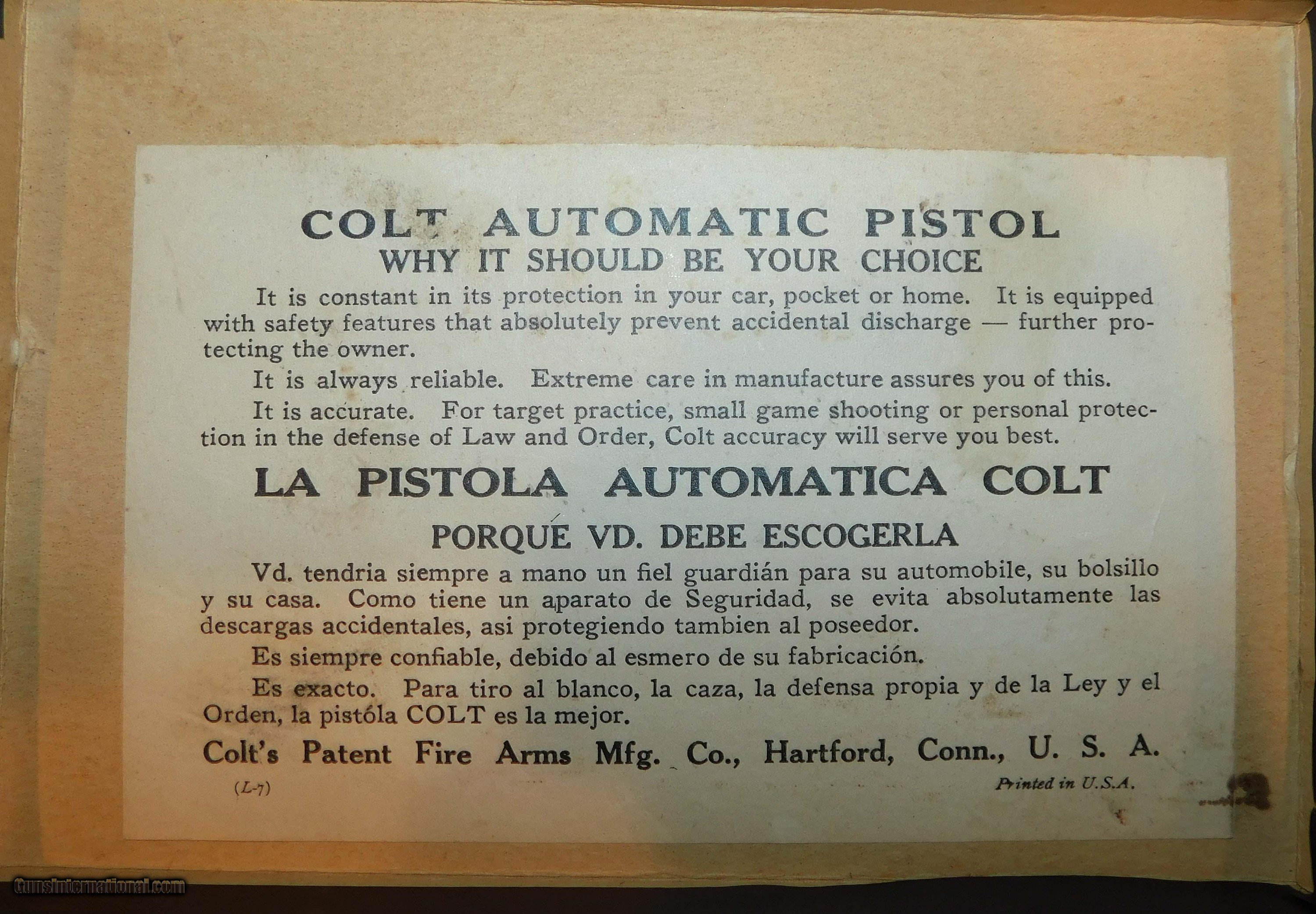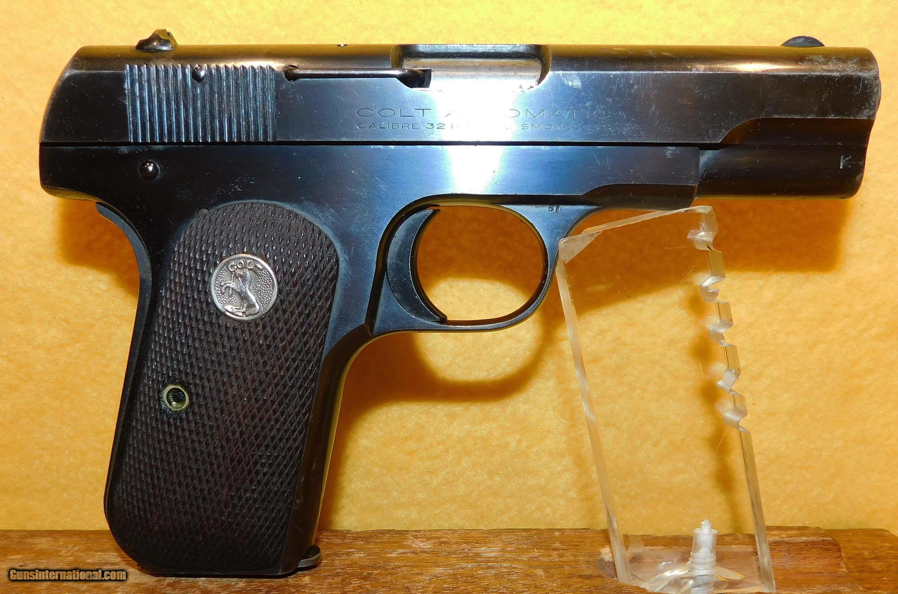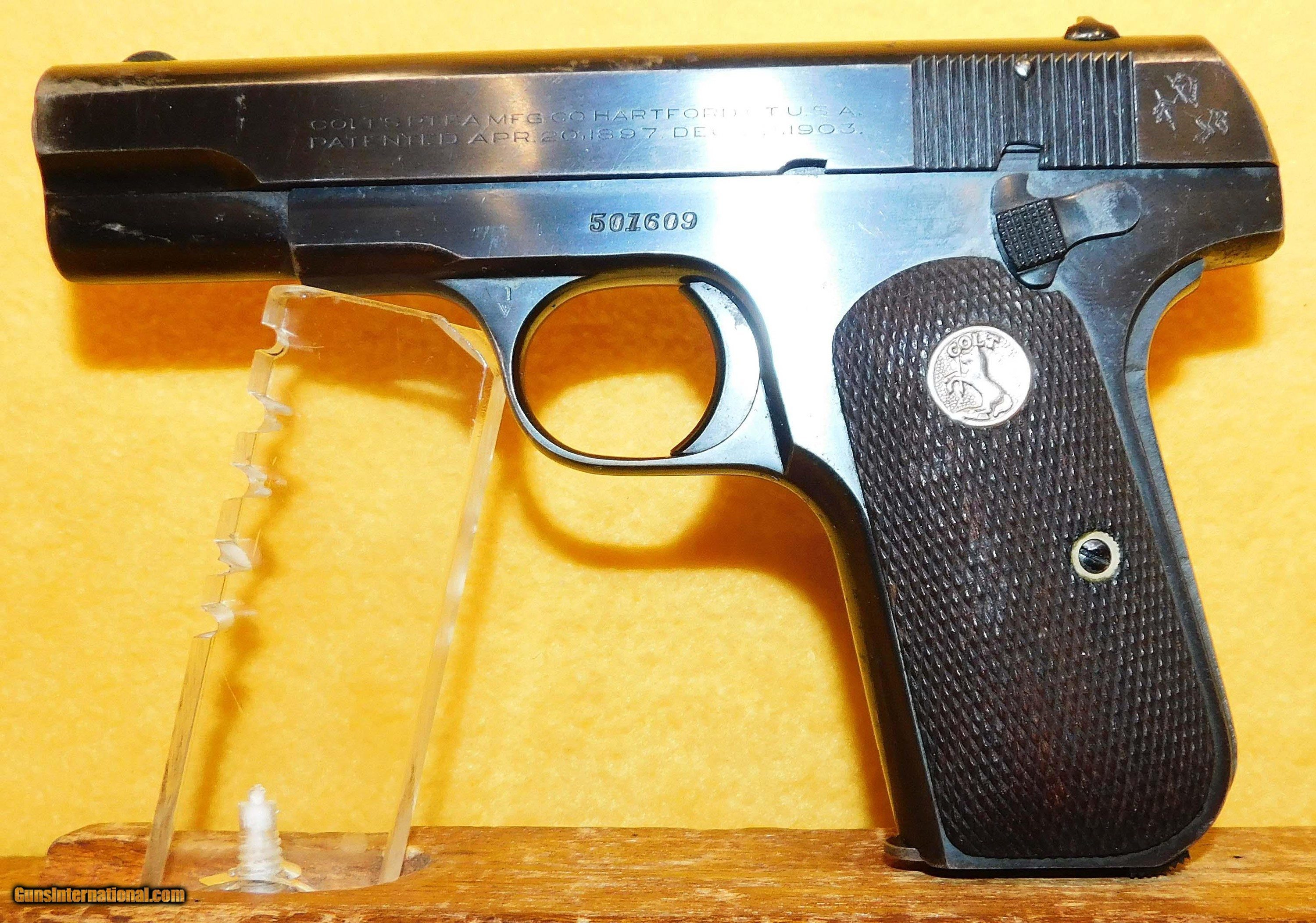 Description: COLT 1903 IN .32 ACP CAL., WITH 3 .75" BARREL. COLOR BLUE. CONDITION 93%. SERIAL NUMBER 501609. COLT MODEL 1903 (CIRCA 1930) IN .32 ACP CALIBER, MIRROR BORE CHECKERED WALNUT GRIPS EXCELLENT, COMES WITH TWO TWO TONE FACTORY MAGAZINES, BROWN BOX WITH PAPERS, 93% OVERALL CONDITION, OUR STOCK # D5538 SOLD |