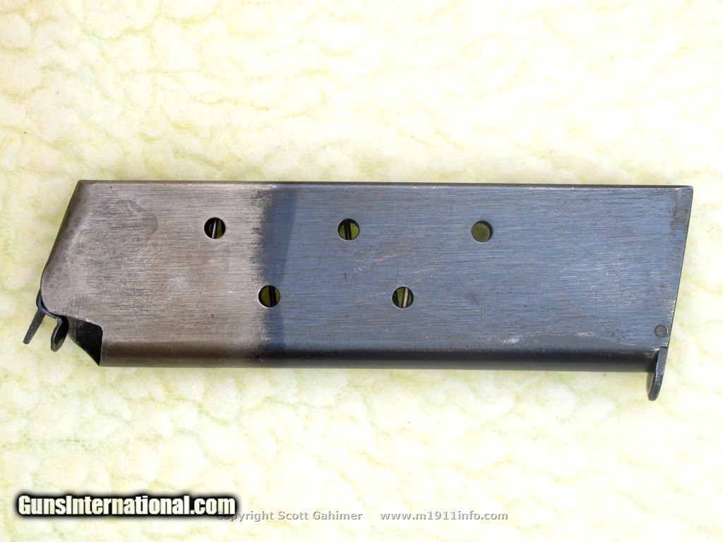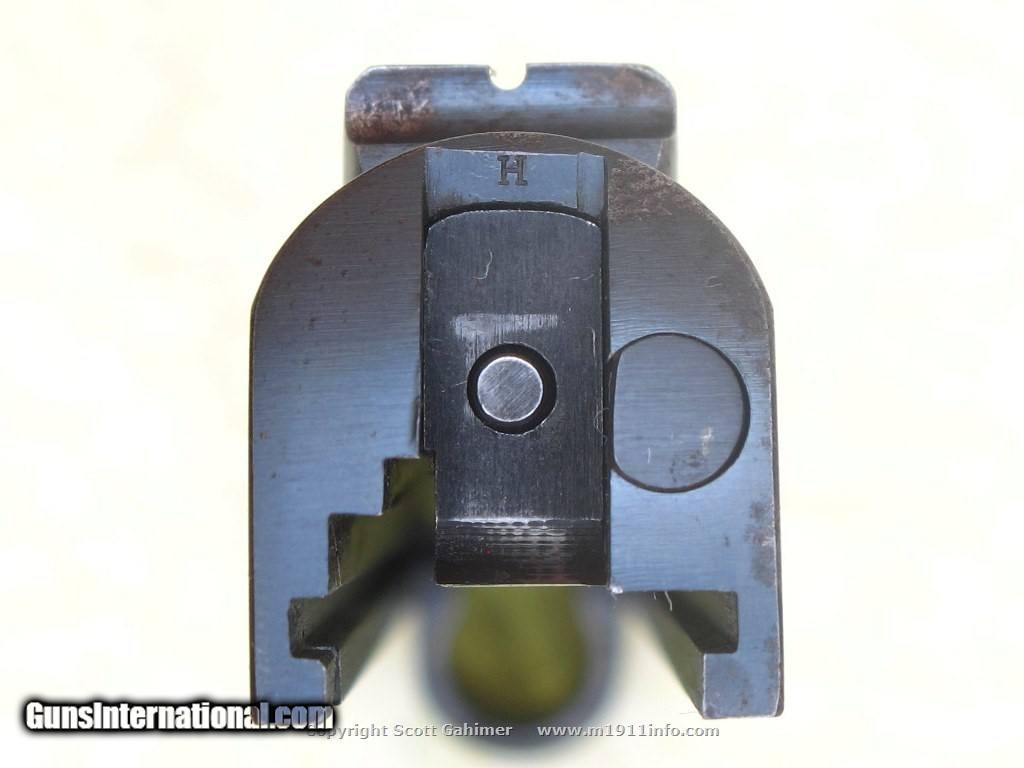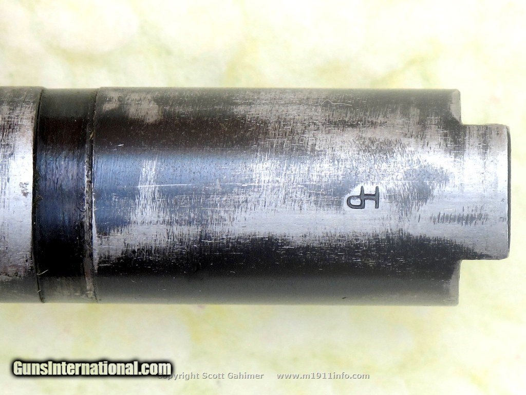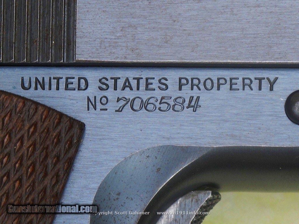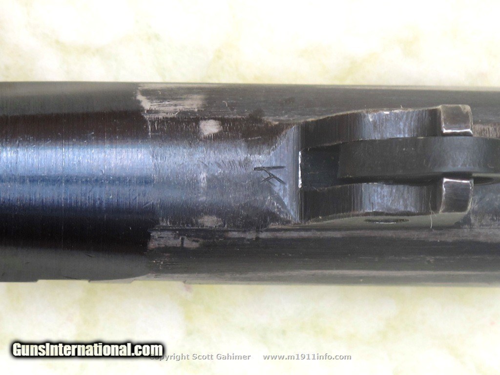 Description: 1924 Colt M1911A1 Transition S/N 706584. 1924 (1st year) Colt M1911A1 pistol. Original Colt brushed blue finish and all correct parts. The barrel properly displays the common leg HP marking on the top of the chamber and the K on the bottom of the barrel, forward of the lugs. This pistol shipped 25 July 1924 to Springfield Armory in a shipment of only 2850 pistols. There were only 10,000 total 1st year Colt M1911A1 pistols. This is the 6584th pistol numbered in that 1924 contract. There were only about 35,000 total Colt M1911A1 pistols with a blued finish produced in 1924, 1937-1941. Brushed blue Colt M1911A1 pistols are, therefore, exceptionally rare and difficult to acquire in any condition. This pistol's original finish rates about 88-90% overall. There is some slight thinning to the finish overall. The pistol shows some typically slight browning to the blue finish on the slide where it contacted the holster. There are also some small areas where finish is flaked off due to aging and corrosion. The pistol shows normal wear, use and handling. The WTG final inspection is the circled variation used on pistols after about serial number 702000. Stocks are original Colt M1911A1 with 28-rows of checkering between the screw holes. Finish and appearance overall is excellent on this pistol. The magazine is a proper WW1 contract magazine manufactured by Barnes Kobert. These pistols were not shipped with magazines from the factory. M1911 two-tone magazines were used. All internal and external small parts appear to be original to the pistol. You will notice the matching serif-style H marks on the receiver and slide, which is correct only for 1924 Transition pistols. You will also notice the disconnector notch in the slide is correct for the 1924 pistol. This is how you are able to determine that the slide is correct, an not a slide from an earlier M1911 pistol. All correct 1st year Colt M1911A1 Transition pistols are extremely rare and difficult to acquire. This example is a nice addition to any collection. It displays the circled WTG final inspection, which is clearly struck through the original Colt brushed blue finish. Please contact me with any questions or to purchase this pistol. SOLD Curio/Relic: Yes Manufacturer: Colt Model: M1911A1 Transition Serial Number: 706584 Caliber Info: .45 acp Condition: VG Finish: original blue Manufacture Date: 1924 Item Location: 46176 |