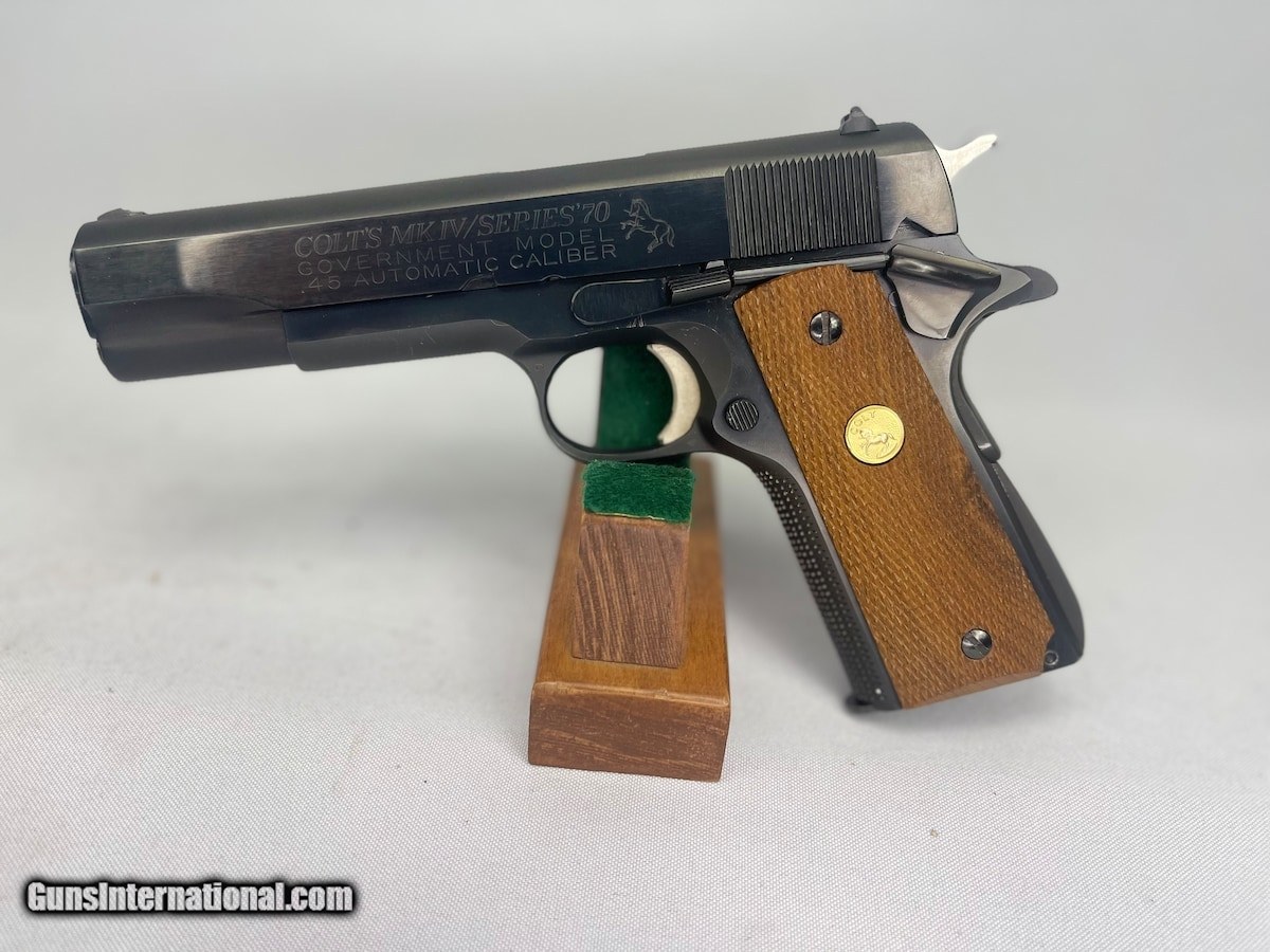 Description: Guns Listing ID: 901388 EXCELLENT CONDITION 1977 PRODUCTION MKIV WITH ORIGINAL BOX SOLD Manufacturer: COLT Model: 1911 GOVERNMENT MODEL MKIV SERIES 70 Caliber Info: .45 ACP Condition: Used - Non-Certified Barrels: 5 BARREL Finish: BLUED |