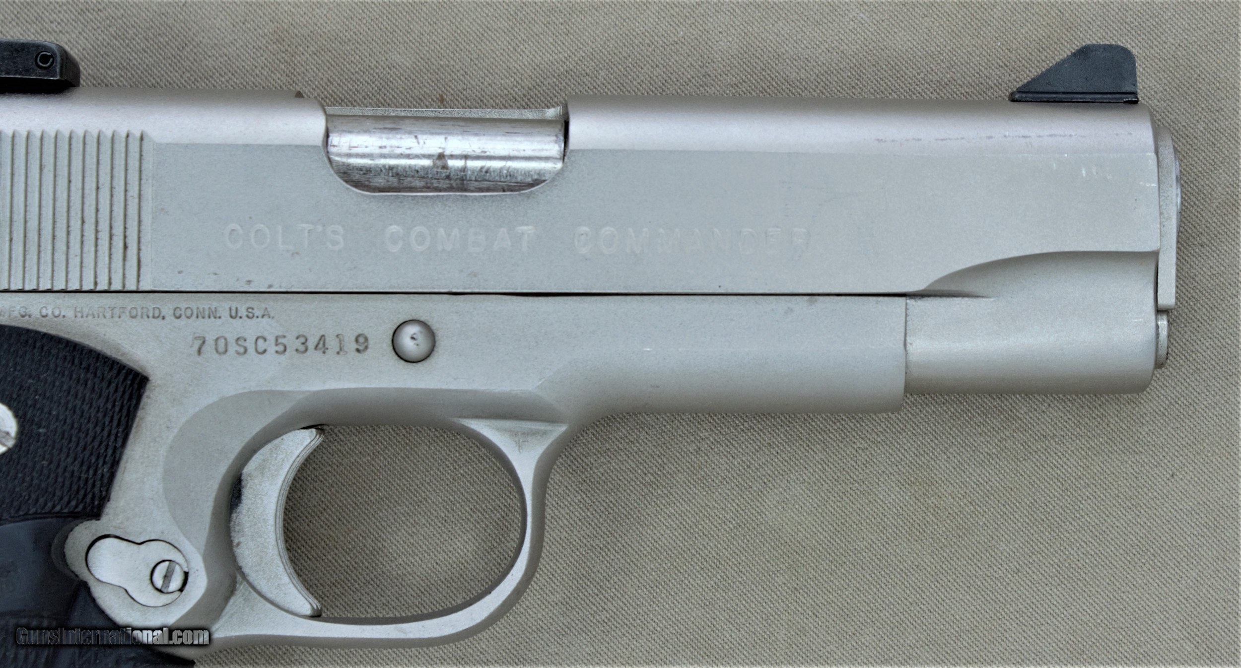 Description: Colt Combat Commander chambered in .45ACp and finished in satin nickle. This Colt was manufactured in 1977 and is a 70 series Commander. The last owner changed the factory sights with adjustable rear sights and a high profile front sight. The factory grips were replaced with a nice set of Pachmayr grips too. The Satin finish was known to show wear easily. This example doesn't show as much wear as most of these vintage pistols do. The bore is bright with lots of rifling. This would make a perfect home or personal defense gun. PRICE: SOLD We are Antique & Modern Firearms in Lexington, KY, dealer of fine firearms since 1974. PH. 859-276-1419 We Buy, Sell and Trade Firearms & Knives. Have a Individual Firearm, Firearms Collection, or Firearms Estate to sell, let us know, we can buy or consignment sell it for you. No credit card fees on purchase!! SOLD Handgun Caliber: .45 ACP (.45 Auto) Manufacturer: Colt Model: COMMANDER Serial Number: 70SC53419 Condition: Very Good Metal Condition: Good Bore Condition: Very Good / Excellent Action: Semi-auto |