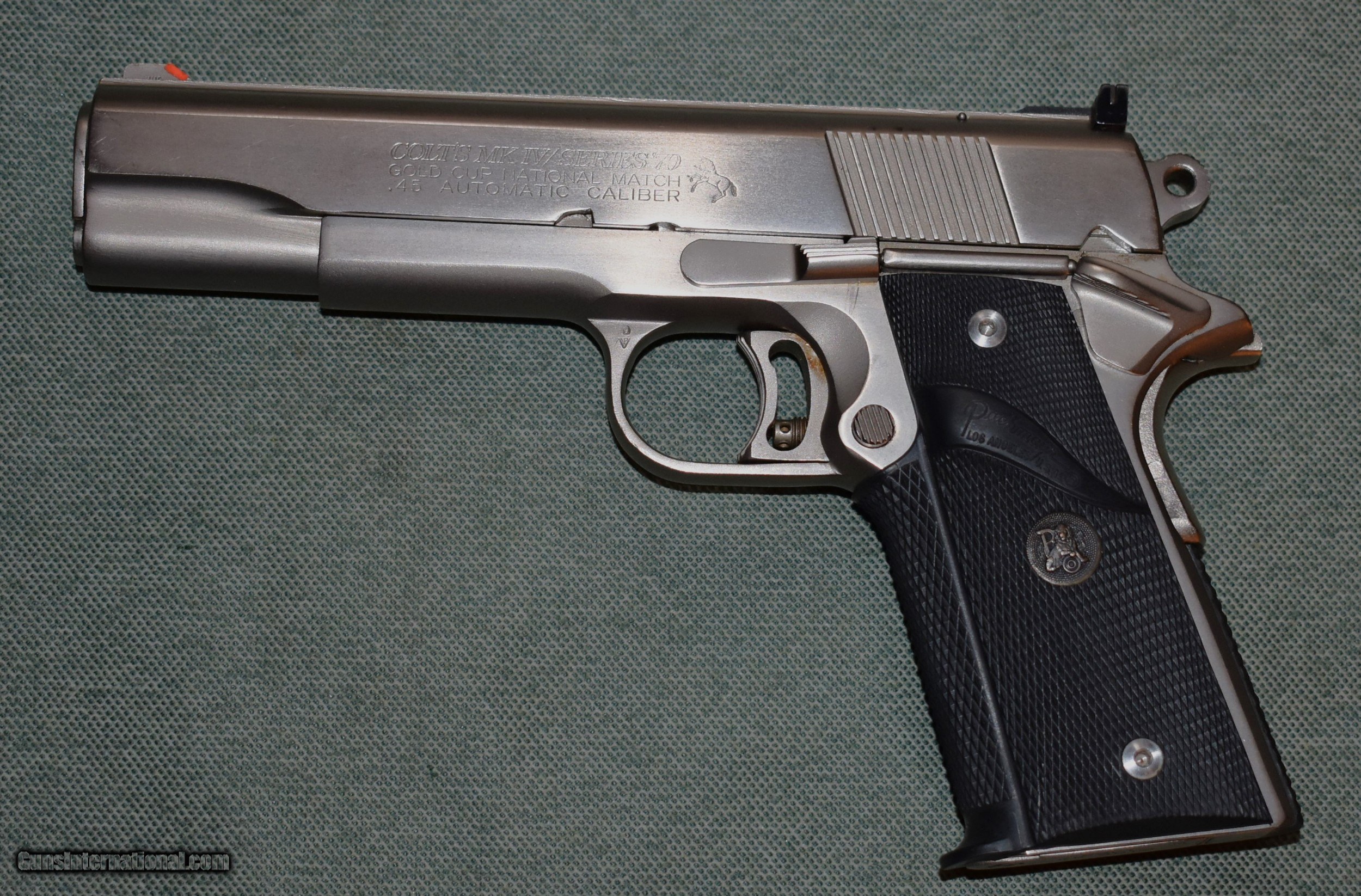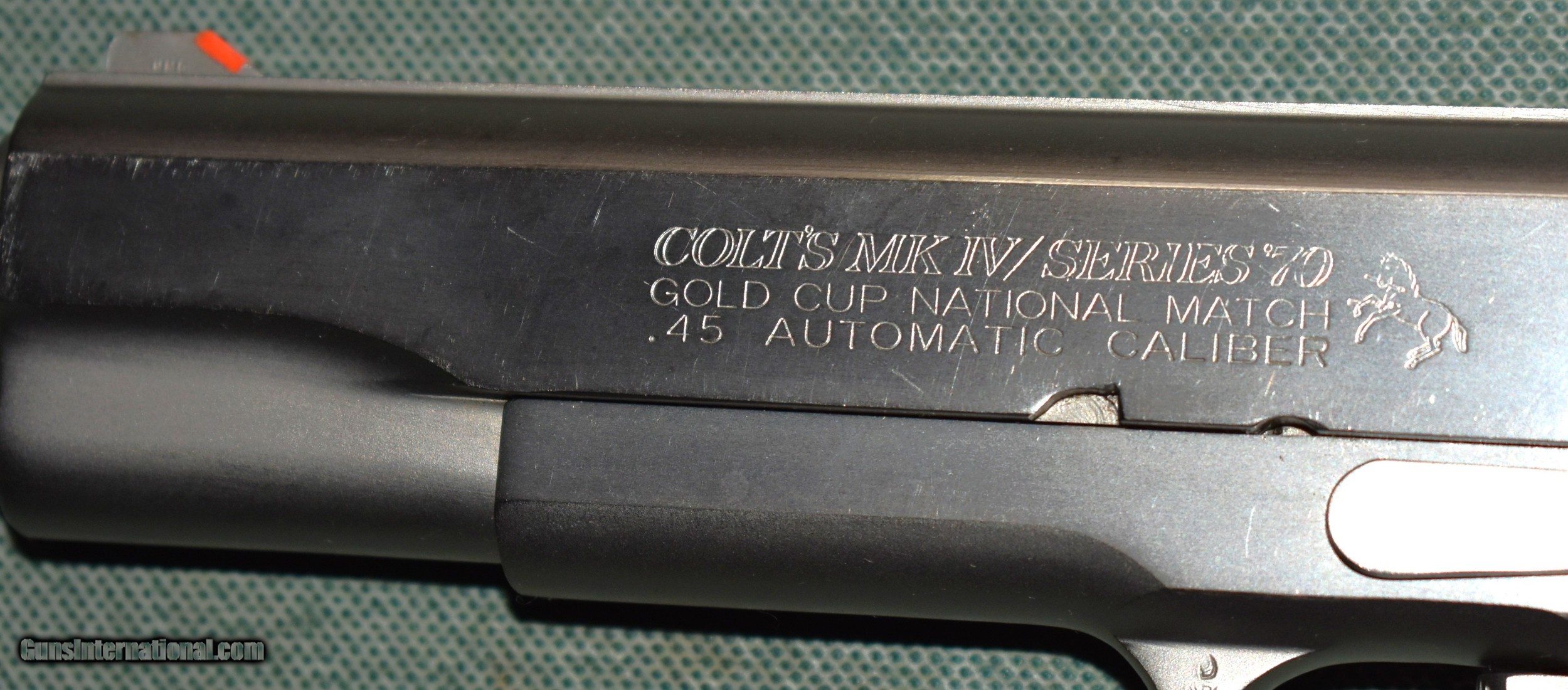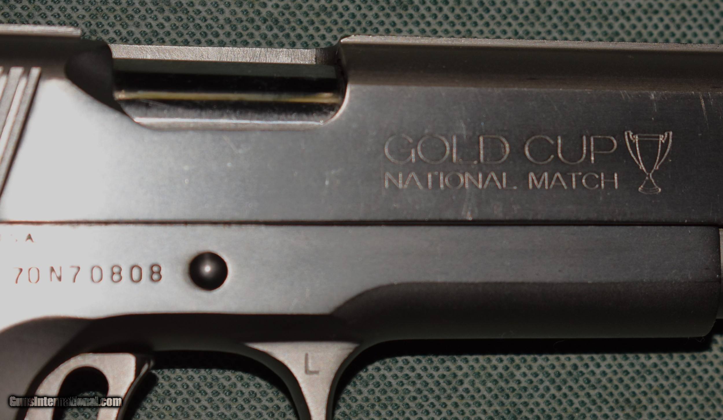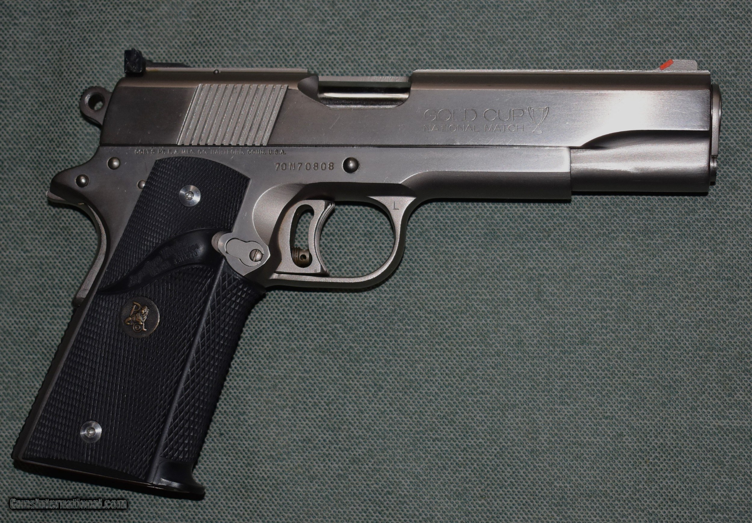 Description: Colt MK IV series 70 Gold Cup National Match 1911 in 45ACP. Built in 1978,this pistol has the high polish nickel finish. The pistol is in excellent condition retaining 99% of the original finish. It has Pachmayr rubber grips. The bore is mint. It has the white outline rear sight and red ramp front sight. The polished nickel finish is a hard to find configuration. SOLD Handgun Caliber: .45 ACP (.45 Auto) Manufacturer: Colt Model: Gold Cup National Match Serial Number: 70N70808 Barrel Length: 5 Condition: mint Metal Condition: mint Bore Condition: mint Action: Semi Auto Manufacture Date: 1978 |