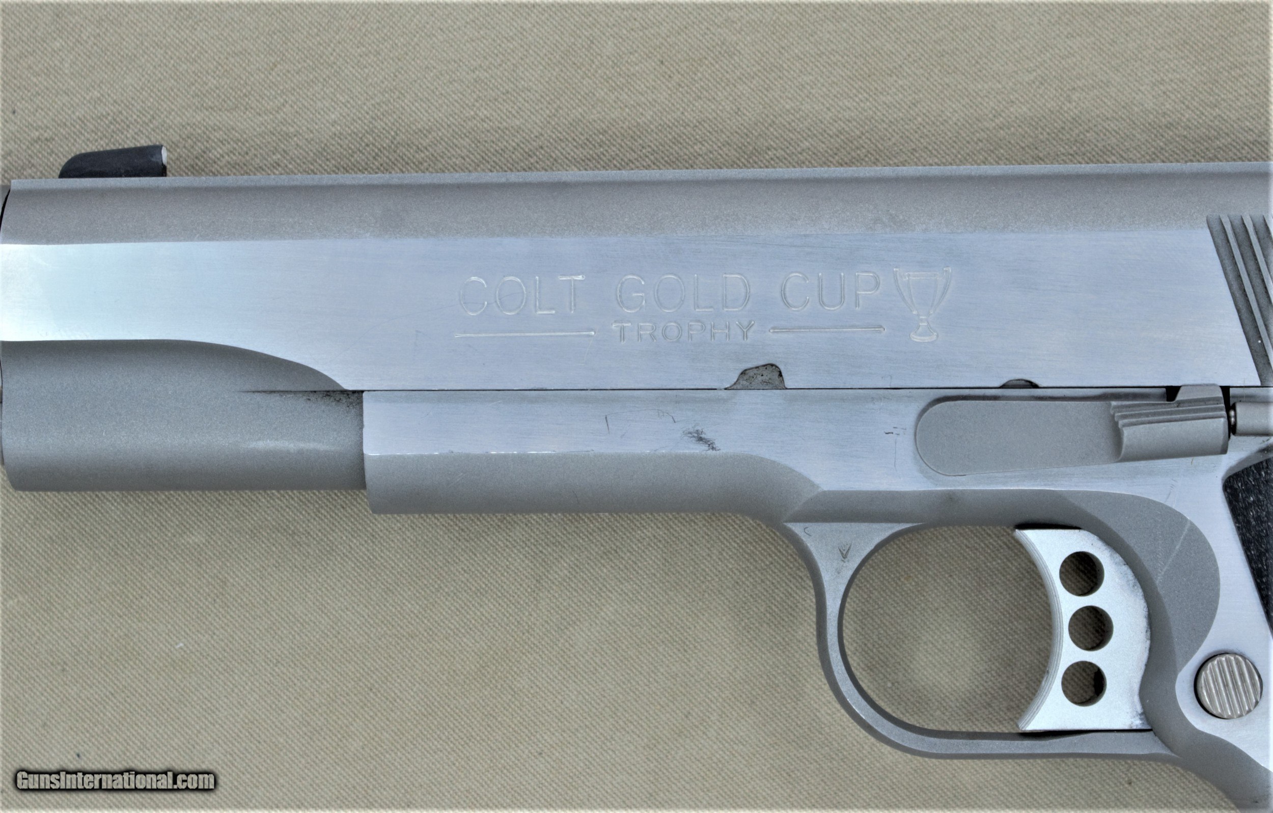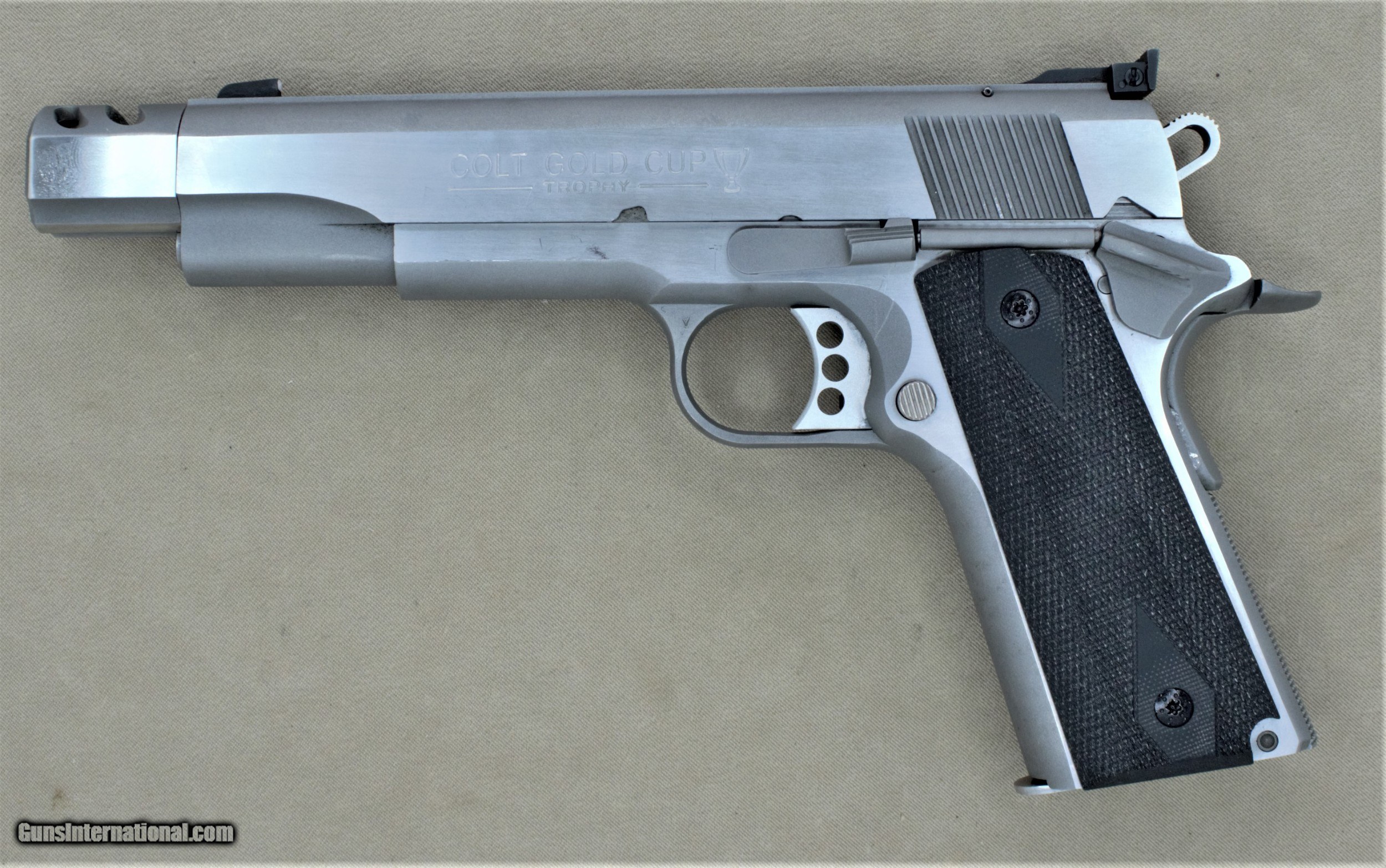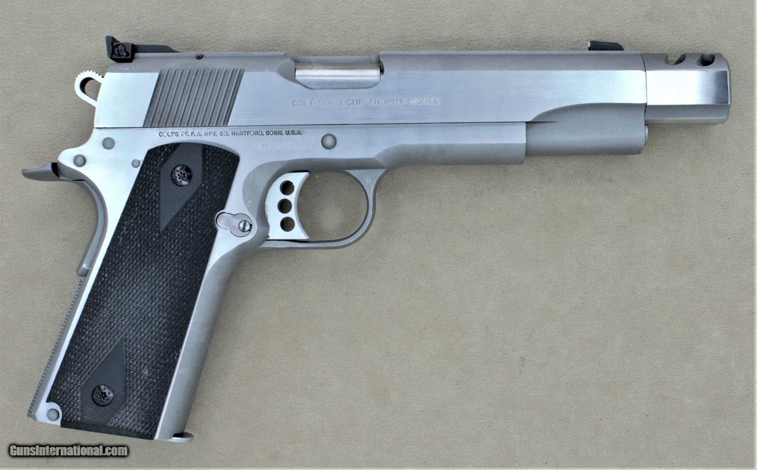Description: Colt Gold Cup Trophy with 2 sets of grips, two recoil springs, two magazines, all paperwork, bushing wrench and blue factory case. Also included is a custom compensator which is installed on the pistol and a Fire Dragon triple ported bushing replacement. This GCT was manufactured in 1998 and is a series 80. The stainless steel finish on the slide is in really good shape. The finish on the frame has the scratch from being assembled incorrectly. The frame also shows other scattered scratches and imperfections. The action is smooth and the trigger pull is what you'd expect from a Colt Gold Cup trophy. While having been fired the bore is bright with great rifling. The grip set on the pistol are custom. But, included is the grip set that was on the pistol when it left the factory. Both magazines are the factory Colt marked magazines that shipped with the GCT. This pistol would make a great range gun. PRICE: $1550.00 We are Antique & Modern Firearms in Lexington, KY, dealer of fine firearms since 1974. PH. 859-276-1419 We Buy, Sell and Trade Firearms & Knives. Have a Individual Firearm, Firearms Collection, or Firearms Estate to sell, let us know, we can buy or consignment sell it for you. NOTE: No additional fee for a Credit Card payment. SOLD Handgun Caliber: .45 ACP (.45 Auto) Manufacturer: COLT Model: GOLD CUP TROPHY Serial Number: GCT04185 Barrel Length: 5 INCH Condition: Very Good Metal Condition: Very Good Bore Condition: Very Good / Excellent Action: single Manufacture Date: 1998 |