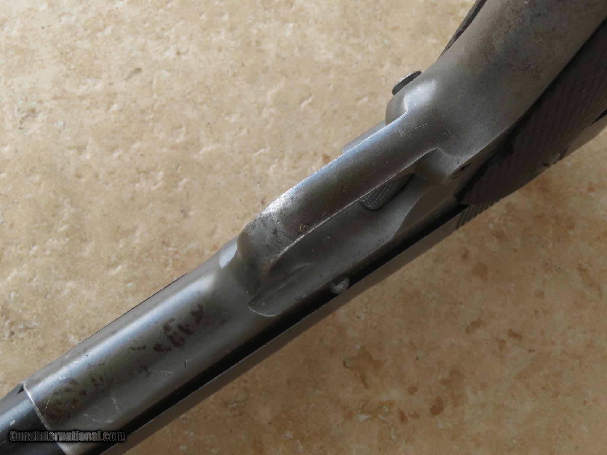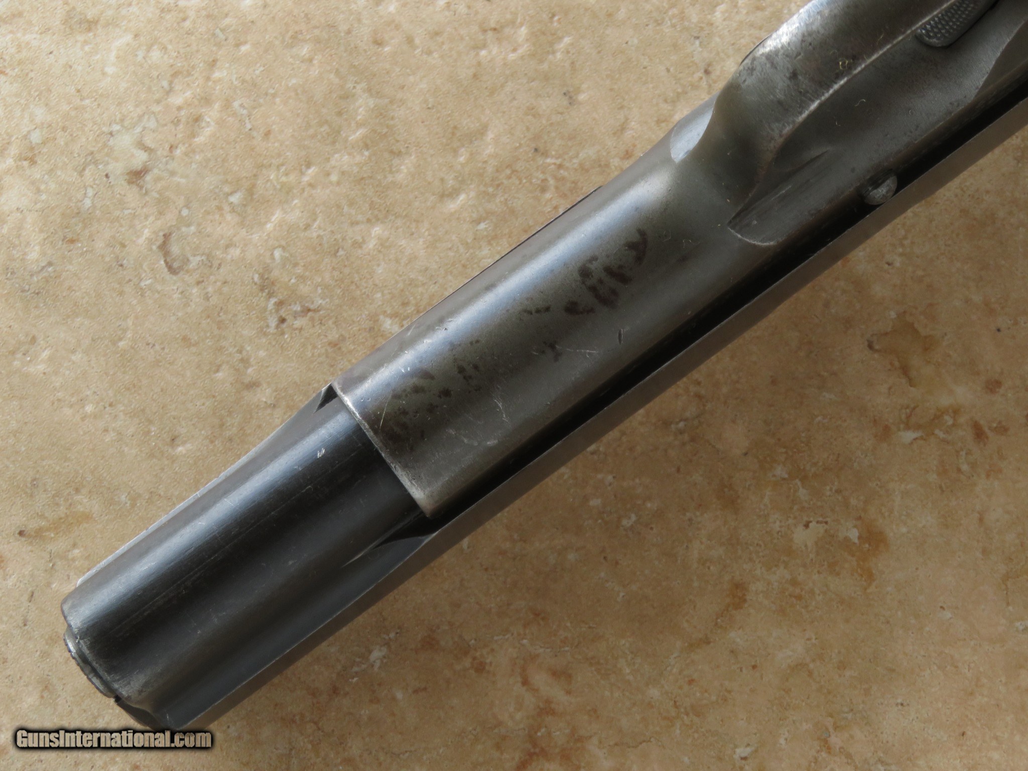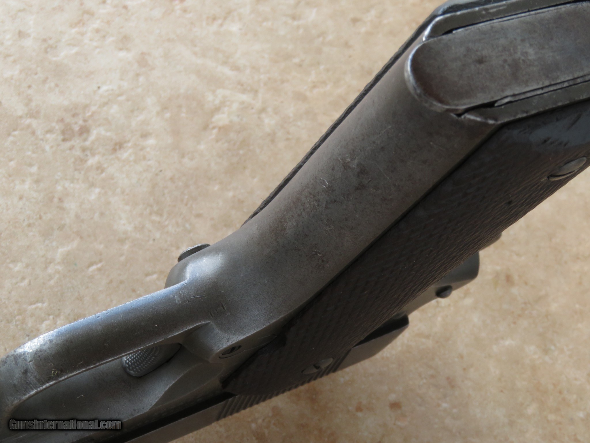 Description: ----SOLD----A nice example of a WW2 1943 vintage Colt 1911A1 service pistol. This pistol has been through an arsenal re-work and most like saw action in WW2 and Korea. It retains approximately 70% of its military parkerized finish, with some thinning on the straps and high edges of the frame and slide. The Colt frame is numbered 937549, and the Colt slide is numbered 1131155, both 1943 manufactured. The grips are pre-war Colt full checkered, showing wear and handling marks. Retains all GI parts amd correct unmarked magazine. The unmarked GI Barrel has a bright bore with sharp rifling and the action functions perfectly. PRICE: $1,595.00 We are Antique & Modern Firearms in Lexington, KY, dealer of fine firearms since 1974. PH. 859-276-1419 We Buy, Sell and Trade Firearms & Knives. Have a Individual Firearm, Firearms Collection, or Firearms Estate to sell, let us know, we can buy or consignment sell it for you. (sales at am-firearms) SOLD Curio/Relic: Yes Handgun Caliber: .45 ACP (.45 Auto) Manufacturer: Colt Model: M1911A1 Serial Number: 937549 Barrel Length: 5 |