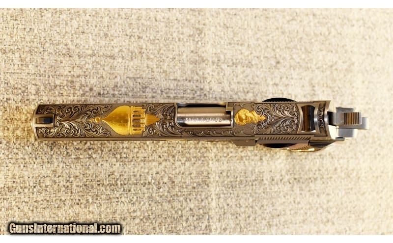 Description: This is a factory direct Colt Government model in .38 Super engraved by the Altamont Company in the Master pattern with rampant colt .45 ACP SOLD Metal Condition: As new in box Wood Condition: As new in box Bore Condition: Clean with bright lands Barrels: 5 Triggers: SA Butt Pad: Altamont Super Rosewood grips Weight: 2 Lbs. 6 Oz. Sights: "Blade front, U-notch rear Item Location: Glendale, AZ |
