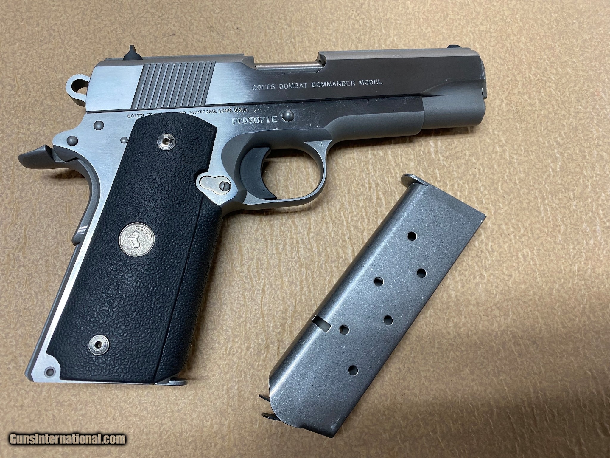 Description: Guns Listing ID: 972787 NICE GUN IN VERY GOOD CONDITION. SOME MARKS FROM GENERAL USE. COMES WITH 2-8RD MAGAZINES. SIGHTS FILLED WITH FRESH HI-VIZ PAINT. DOES NOT HAVE FACTORY BOX. SOLD Manufacturer: COLT Model: 1911 COMBAT COMMANDER Caliber Info: .45 ACP Condition: Used - Non-Certified Barrels: 4.5 BARREL Finish: STAINLESS  |