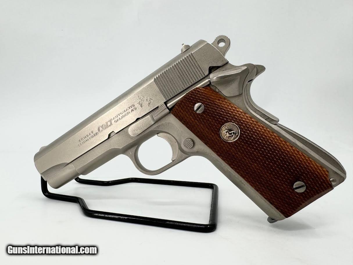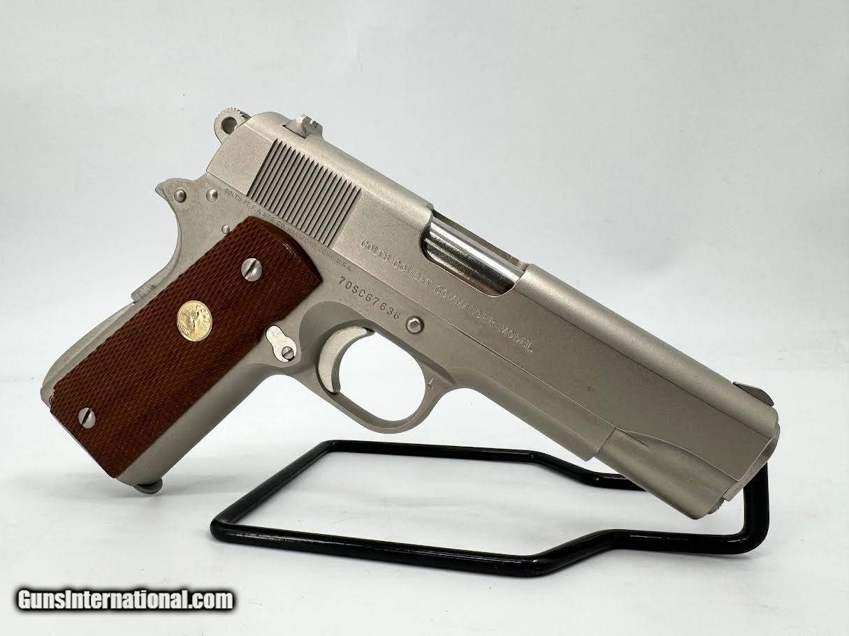 Description: Guns Listing ID: 392670 COLT COMBAT COMMANDER 45 ACP Pistol. Good condition, Normal Handling Marks, Scattered Spotting and/or Pitting. 4.25\" Barrel. Shiny Bore, Tight Action Semi Auto Features a Satin Nickel Finish, Front Blade Sight, Notch Rear Sight, With a Round Hammer Spur. Factory Wood Checkered Grips with Colt Medallions. Colt Pony Clearly Visible on Left Side. Includes 1- Factory magazine. A renowned firearm manufacturer‚‚s compact and powerful 45 ACP pistol, designed for combat applications It is a favored choice among discerning shooters.. SN: 70SC6763 SOLD Manufacturer: COLT Model: 1911 COMBAT COMMANDER Caliber Info: .45 ACP Condition: Used - Non-Certified Barrels: 4 BARREL Action: SEMI AUTOMATIC Finish: STAINLESS Weight: not specified  |