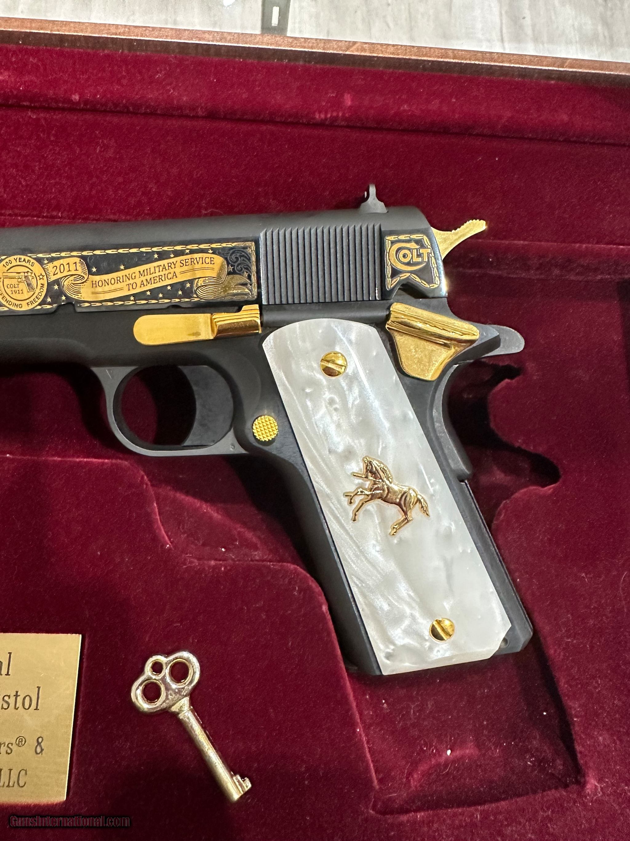 Description: Guns Listing ID: 1118468 Colt 1911 centennial tribute with engraving and gold inlay. With white pearl grips and gold colt pony. With wooden locking display case SOLD Manufacturer: COLT Model: Centennial Anniversary 1911 Tribute Pistol Caliber Info: .45 ACP Condition: Used - Non-Certified Barrels: 5 BARREL Finish: BLUED W/ ENGRAVING |