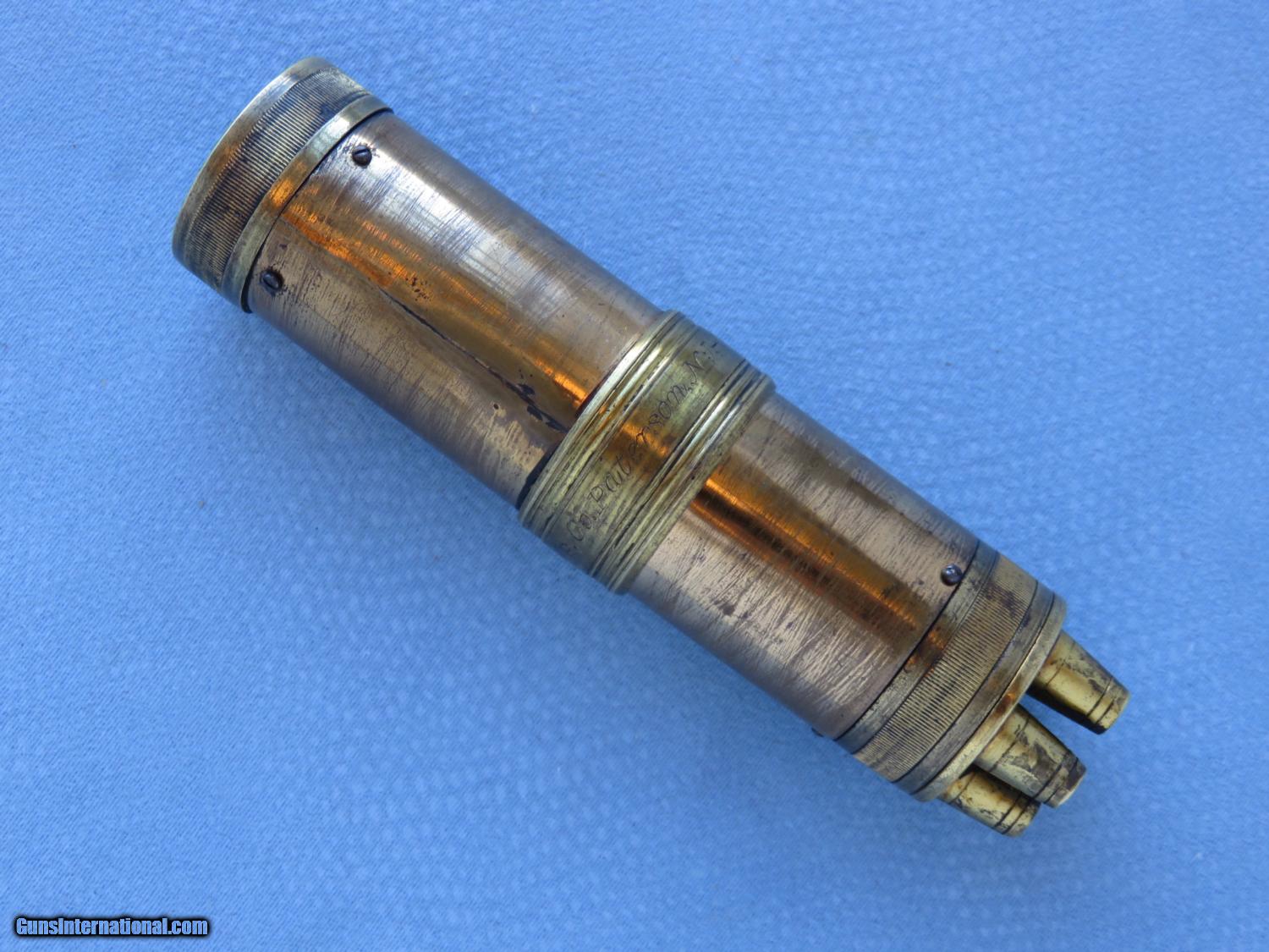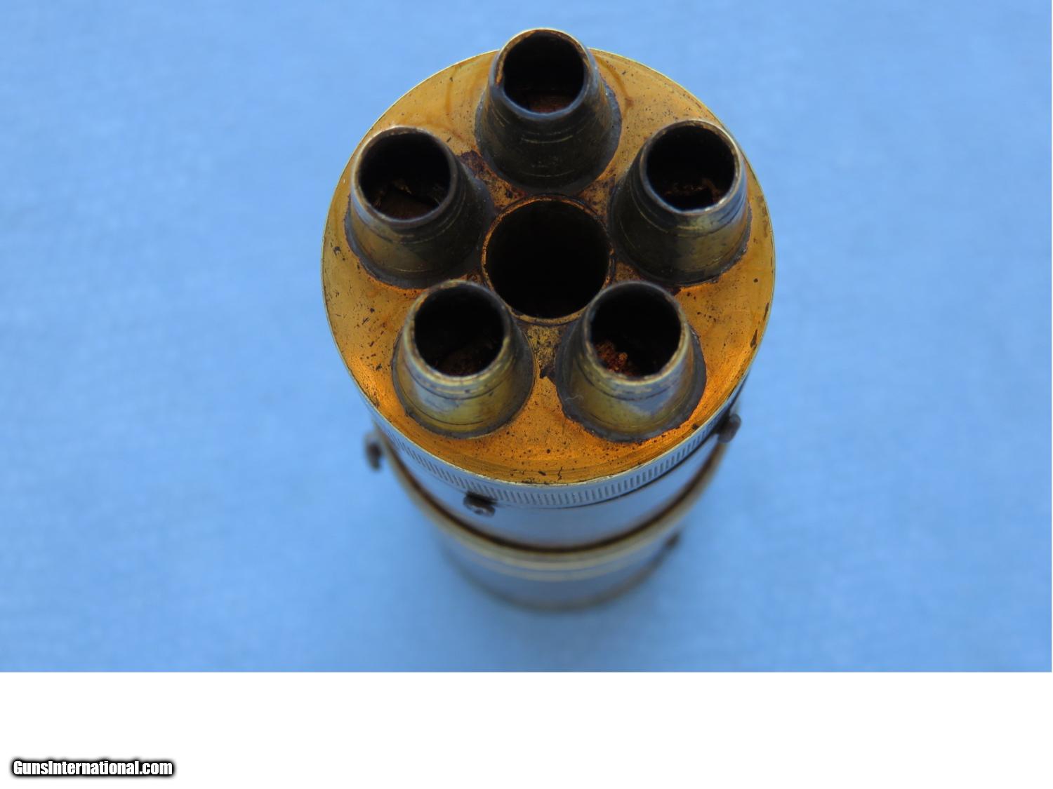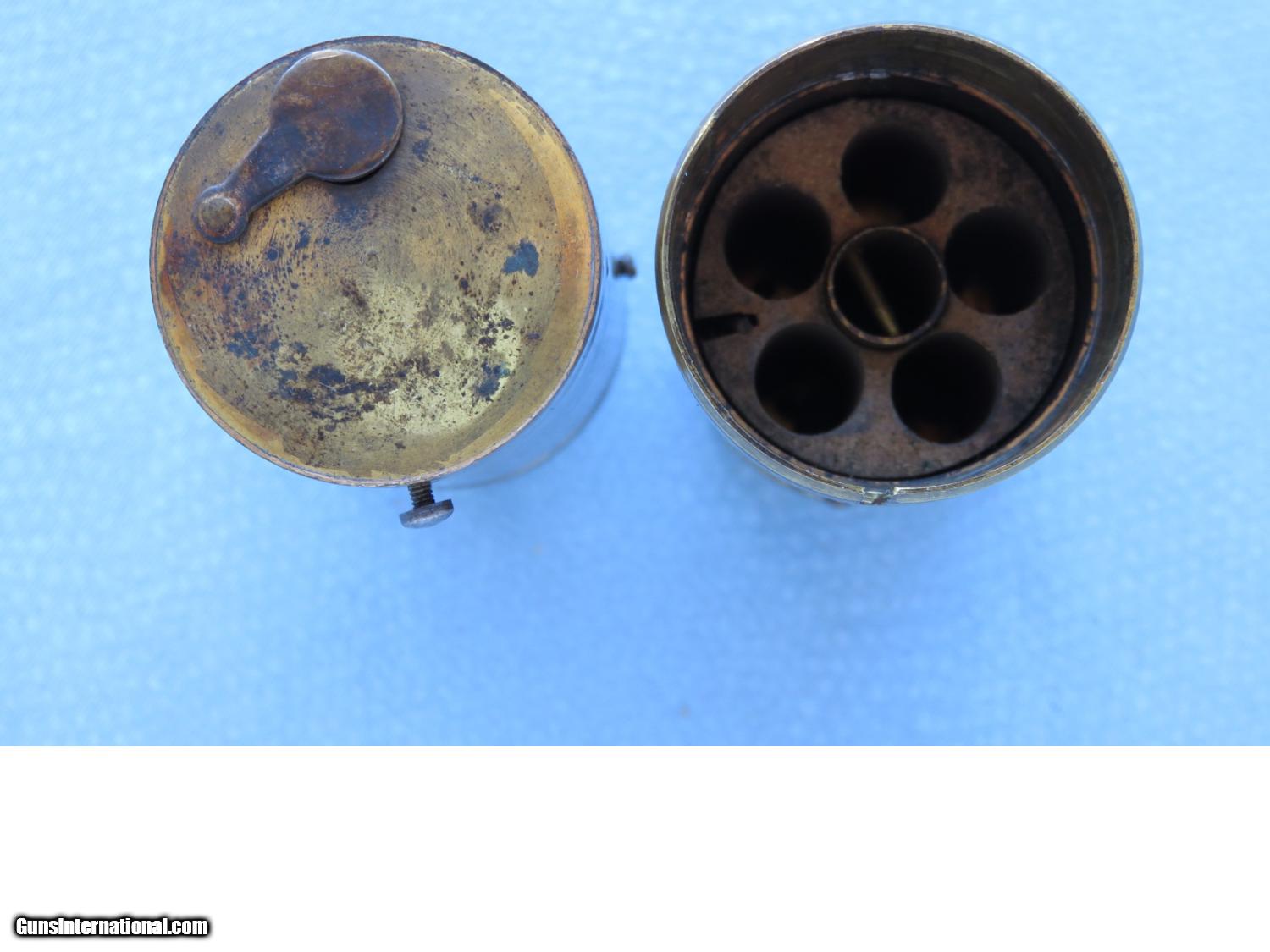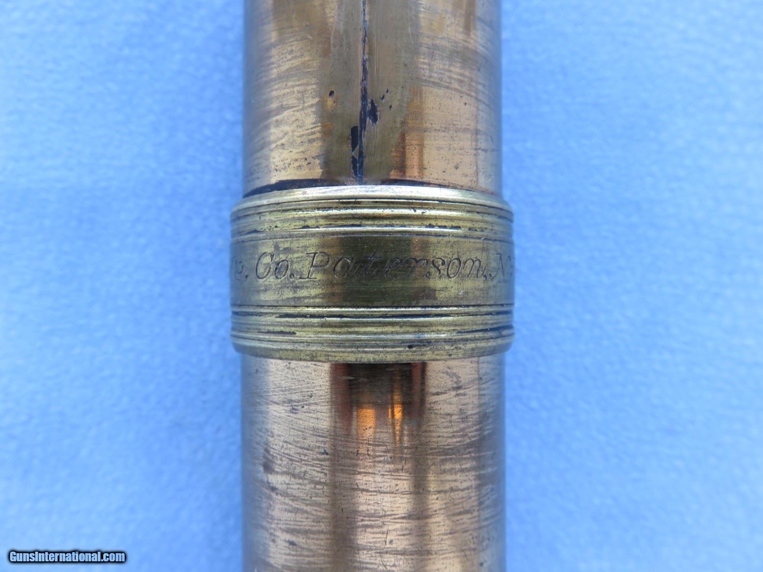 Description: This is the Charger for the Paterson Belt Model #3 with flared grips. The Charger has two knurled rings, and the ball inserts are of seetgum wood. The inscription on the center ring reads "Patent Arms M'G Co. Paterson, N.J.-Colts Pt.". The band has two scribe lines above and below the inscription. The finish is high grade gold gilt, of which about 80% remains. The overall condition is excllent, with one seam repair. These are extremely rare. PRICE: $ 19,950 We are Antique & Modern Firearms in Lexington, KY, dealer of fine firearms since 1974. PH. 859-276-1419 We Buy, Sell and Trade. (sales at am-firearms) SOLD Curio/Relic: Yes Antique: Yes |