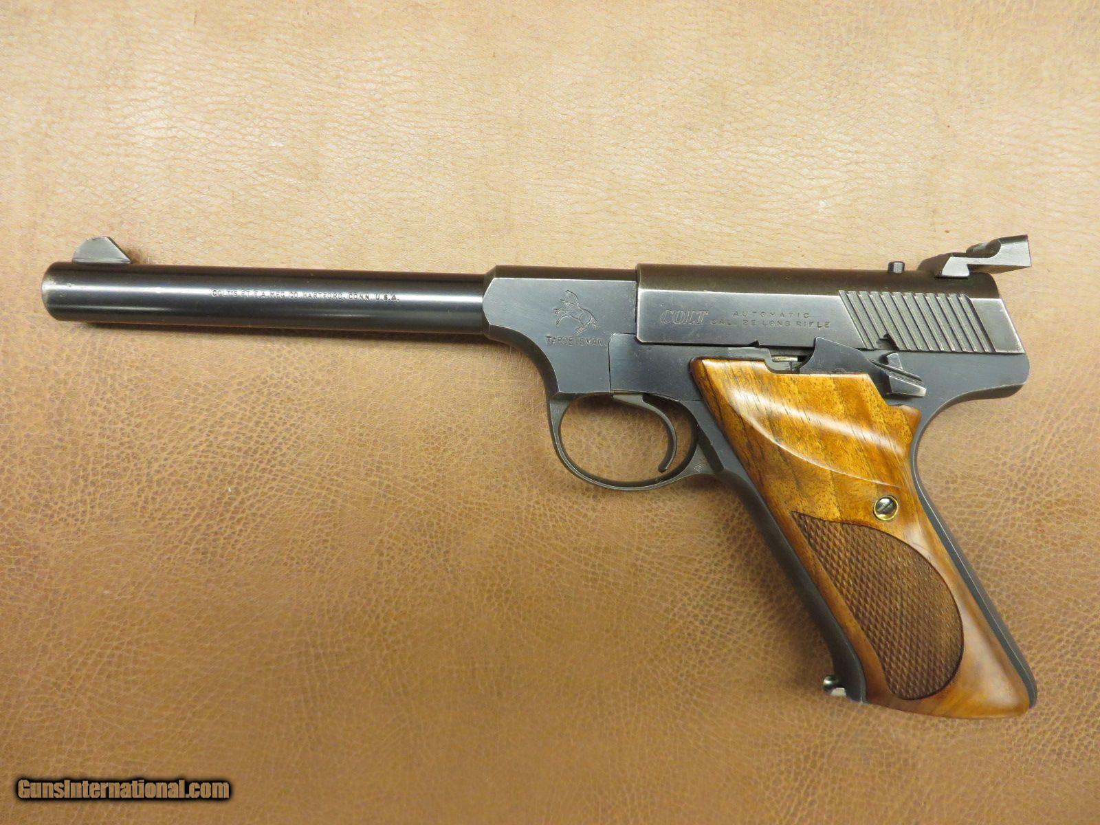 Description: .22 Long Rifle with 6 inch barrel. Serial number 079xxx S. Has a replacement drift adjustable rear sight but is too high for the factory front sight so the gun shoots high. Checkered walnut thumbrest grips. Stainless steel ten round magazine. Near 95% blue. SOLD |