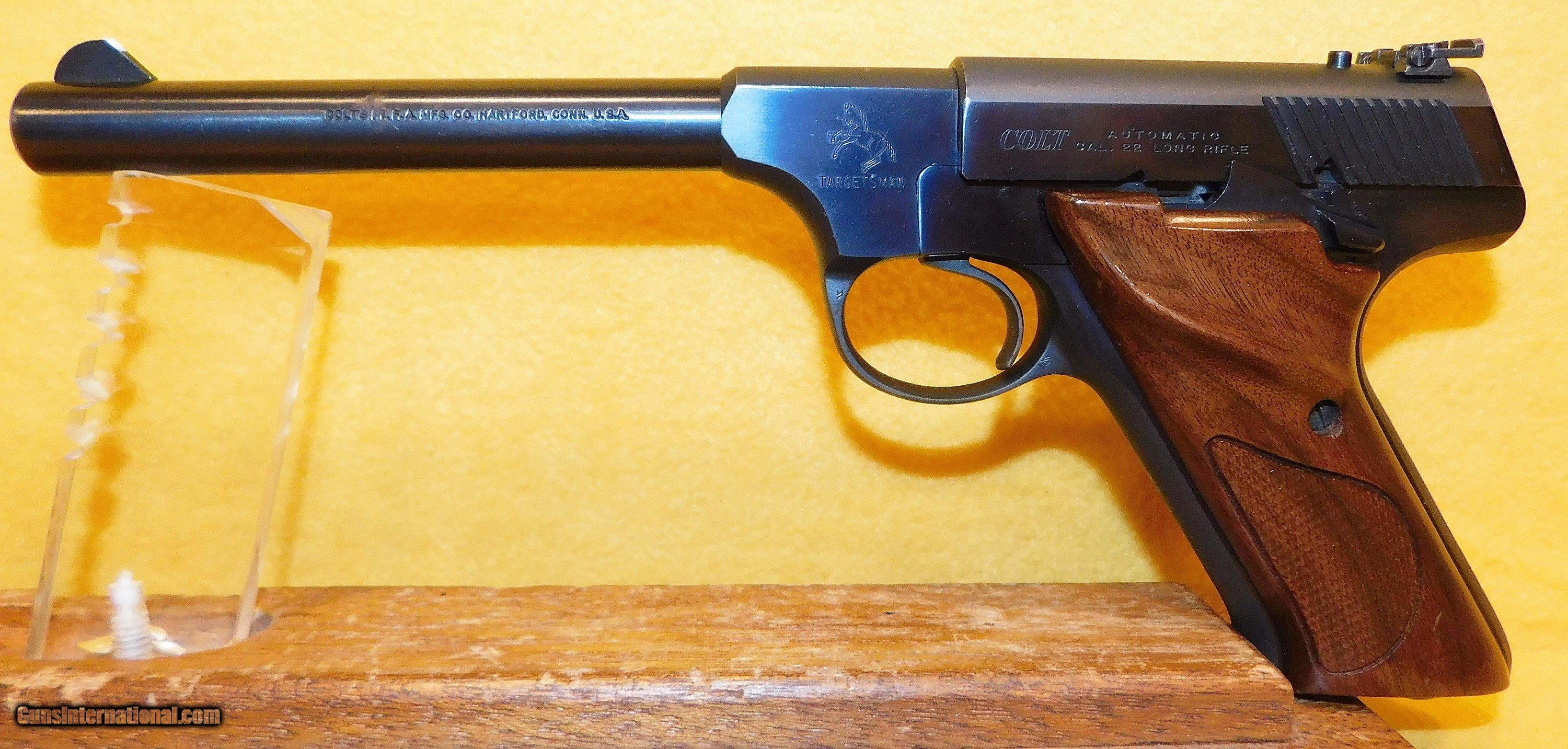 Description: COLT TARGETSMAN IN .22 L.R. CAL., WITH 6" BARREL. COLOR BLUE. CONDITION 95%. SERIAL NUMBER 078405S. COLT MODEL TARGETSMAN ( CIRCA 1950) IN .22 L.R. CALIBER, BRIGHT SHINY BORE, GRIPS EXCELLENT, ADJUSTABLE REAR SIGHT, COMES WITH ONE FACTORY MAGAZINE, 95% OVERALL CONDITION, OUR STOCK # D2818 SOLD |