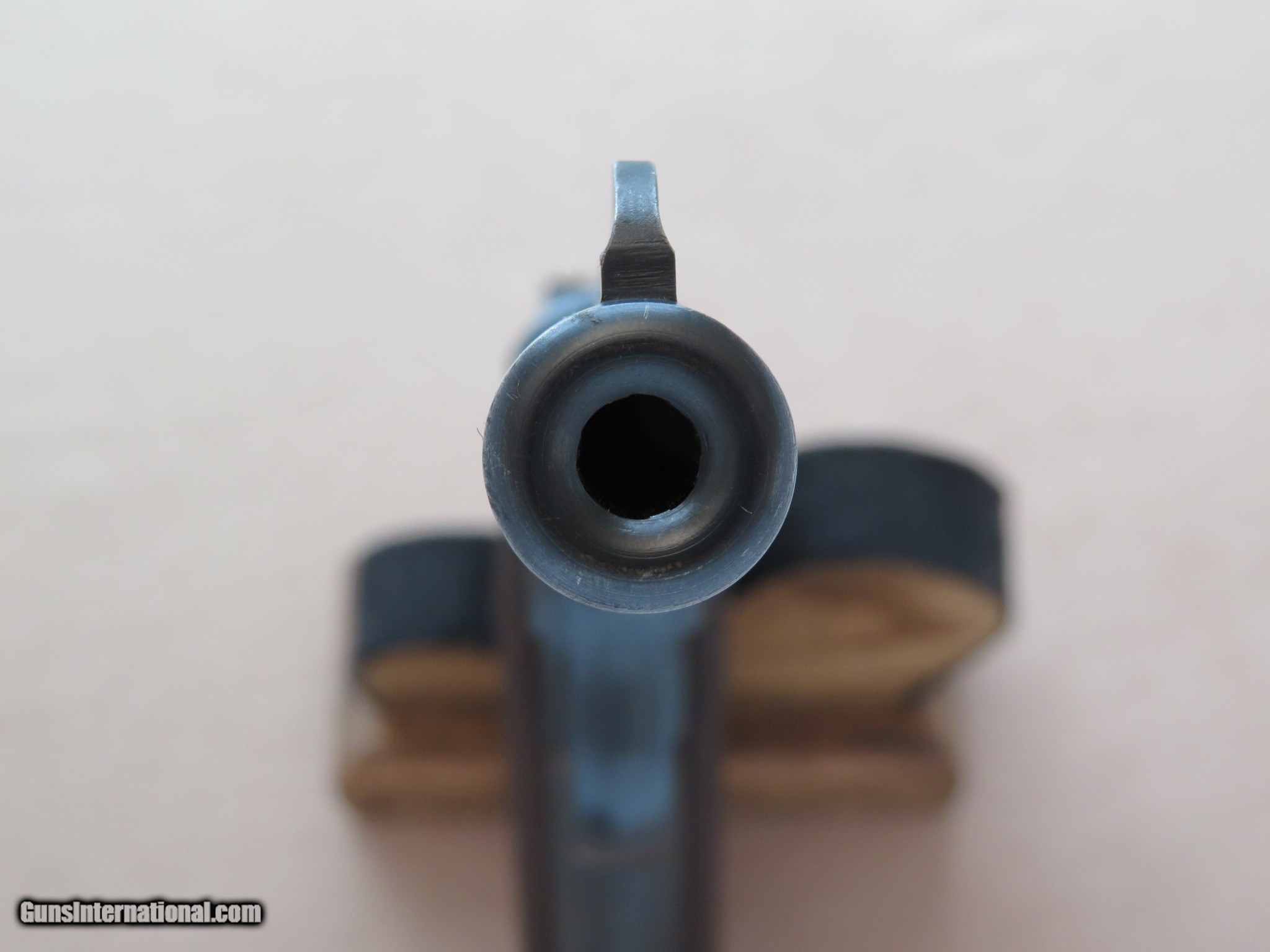 Description: The Colt Woodsman is considered by many to one of the finest rimfire automatic pistols ever built. The Woodsman 1st Series was built between 1927 and 1947 and spanned 3 series and many variations. This particular pistol is a 1st Series Sport Model which was introduced in 1933. The 1st Series Sport Models feature a blue finish, 4.5" inch barrel, checkered Walnut grips, a 10-shot magazine, and a bottom-mounted magazine release. This pistol is serial number 110210 and was manufactured in 1937. It is in superb all-original condition. The factory blue finish rates 96% +/- with only a touch of blue wear on either side of the muzzle and some scattered very minor handling/storage marks if you look very closely. The bore is in minty like-new condition. It is bright and pristine, with sharp lands and grooves still visible in the rifling. The original checkered Walnut grips are in excellent condition. The checkering is still crisp and they are completely free from any cracks, chips, or repairs. The original 2-tone factory magazine is still in this Woodsman Sport Model. It is in great shape overall but does browning of the blue finish on the magazine body and floorplate. The follower still has plenty of spring pressure and when function-checked with dummy rounds it works perfectly. All of the controls on this Woodsman are in perfect working order. The slide is tight on the frame but still works smoothly by hand. The trigger is excellent, breaking with a very light pull with no felt grit or slop. This 1st Series Woodsman Sport Model is certainly a collector-grade piece and would be an excellent addition to any collection. It is not too often that we get these pre-war Colt Woodsman pistols in the shop in any condition, much less as beautiful and clean as this example is. SOLD Curio/Relic: Yes Manufacturer: Colt Model: Woodsman (1st Series) Serial Number: 110210 Caliber Info: .22 Long Rifle Bore: Minty Condition: Excellent Manufacture Date: 1937 |