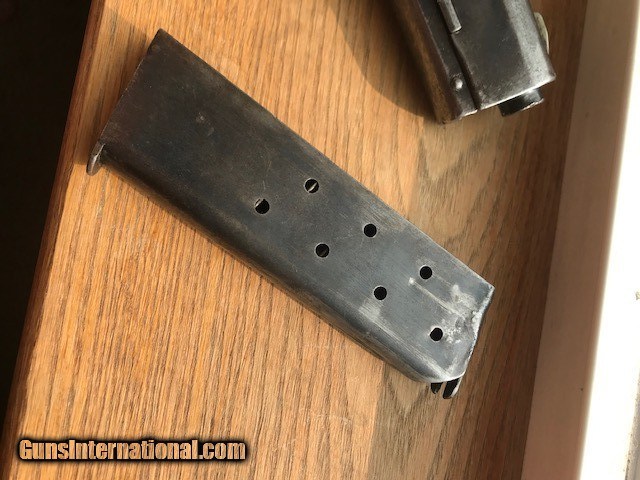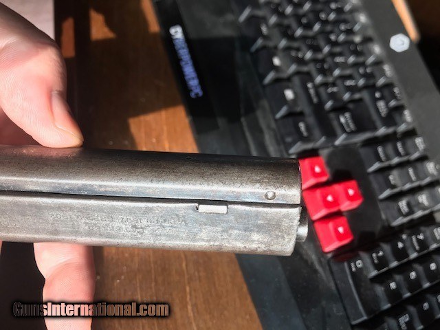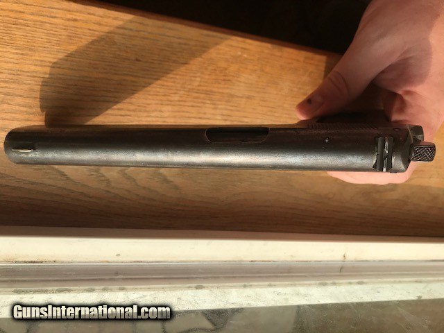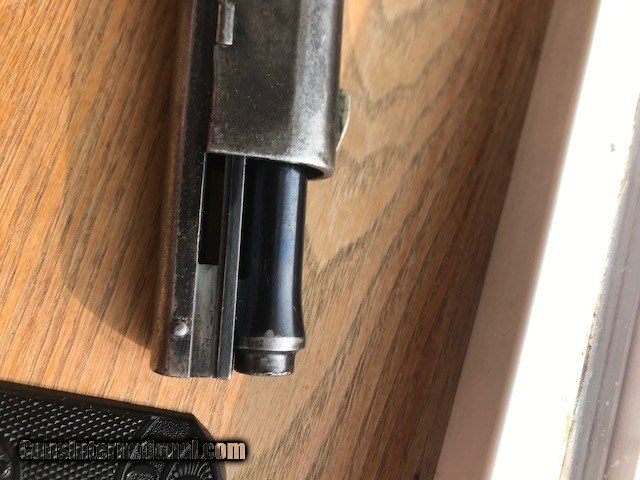 Description: Mechanics are perfect. Virtually no pitting - VERY light 1 inch freckle near front left of the frame just under the slide, but on the frame. Totally worn making it a perfect candidate for restoring. Barrel retains nearly 100% nitre blue as does the trigger. Bore is quite nice. One original grip with one screw, reproduction grips included - no additional screws. I found a company in TN who does good restoration work, but never sent it off... (oldsouthrestoration) Great quote compared to Turnbull. I didn't want to pay for Turnbull because this isn't a family gun. Turnbull did send me a quote (hefty) so I could dig around for it so the buyer has an idea of what needs to be done (non mechanical). The TN company lists their pricing, so for about 1300.00 you could get a great deal. Just one of those things I just never got to - instead - I bought a new upland gun that set me back, so I'm selling off a few of my guns. SOLD Curio/Relic: Yes Handgun Caliber: .38 Long Colt Manufacturer: Colt Model: 1902 Serial Number: 15441 Barrel Length: 6 Bore: .38 long colt Condition: mechanically good Metal Condition: worn Wood Condition: n/a Bore Condition: good Action: semi automatic Manufacture Date: 1902 Item Location: columbus, in |