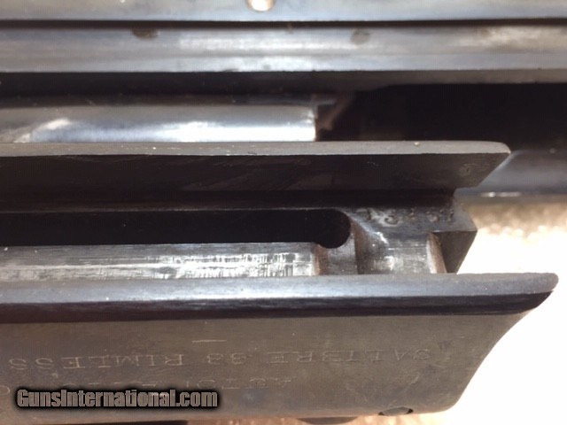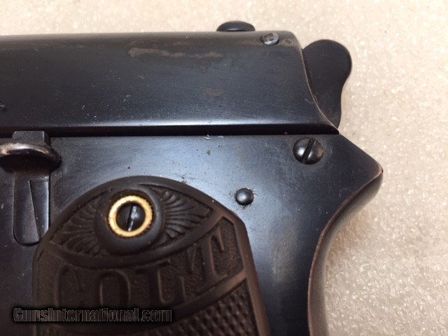 Description: Early Colt 1902 Military with the forward serrations which would make a fine addition to your collection. Manufactured in 1904 (many around this serial number including sn# 13258 were shipped to John Browning, Ogden, Utah on 11/7/1904 - could consider a Colt archive letter and some research.) Colt only made about 18,000 of these 1902 military pistols from July 1902 until Dec 1928. They were serial numbered from 15,001 - 15,200 for the U.S. military contract then for the commercial market, backwards from 15,000 to 11,000; then 15,201 to 15,999; then 30,200 to 43,266. Weird numbering. Only the first 3200 had the forward checkering - so this is early and rare. Bluing is nice, although I expect a reblue many years ago. Original grips with some wear on the left lower grip, no chips or cracks. Bore is present but frosted. Slide is matched by seria number to the frame #13257. Inspector markings: "T" forward slide retaining groove, "4" on the frames barrel recess and "4" on bottom of the slide near the firing pin housing. Right side markings are good: "AUTOMATIC COLT CALIBRE 38 RIMLESS SMOKELESS" and forward "MODEL 1902". Left side slide markings not present. I've shot this when I first put it into my collection about 20 years ago. They are fun to shoot - and this one shot well. Ships UPS insured to your FFL for $40. This pistol is C&R eligible if legal to ship to your jurisdition - know your local laws. I allow a 3 day non-shooting inspection period - but I beleive you'll like this Colt 1902 military 38acp. See my other early Colt autos listed here. Contact me with questions - I want this transaction to make us both happy. Ted SOLD Curio/Relic: Yes Manufacturer: Colt Model: 1902 Military 38acp long slide Serial Number: 13257 Caliber Info: 38 acp Bore: worn/frosted Condition: refinished Metal Condition: Great Stock: original rubber Finish: blue Manufacture Date: 1904 |