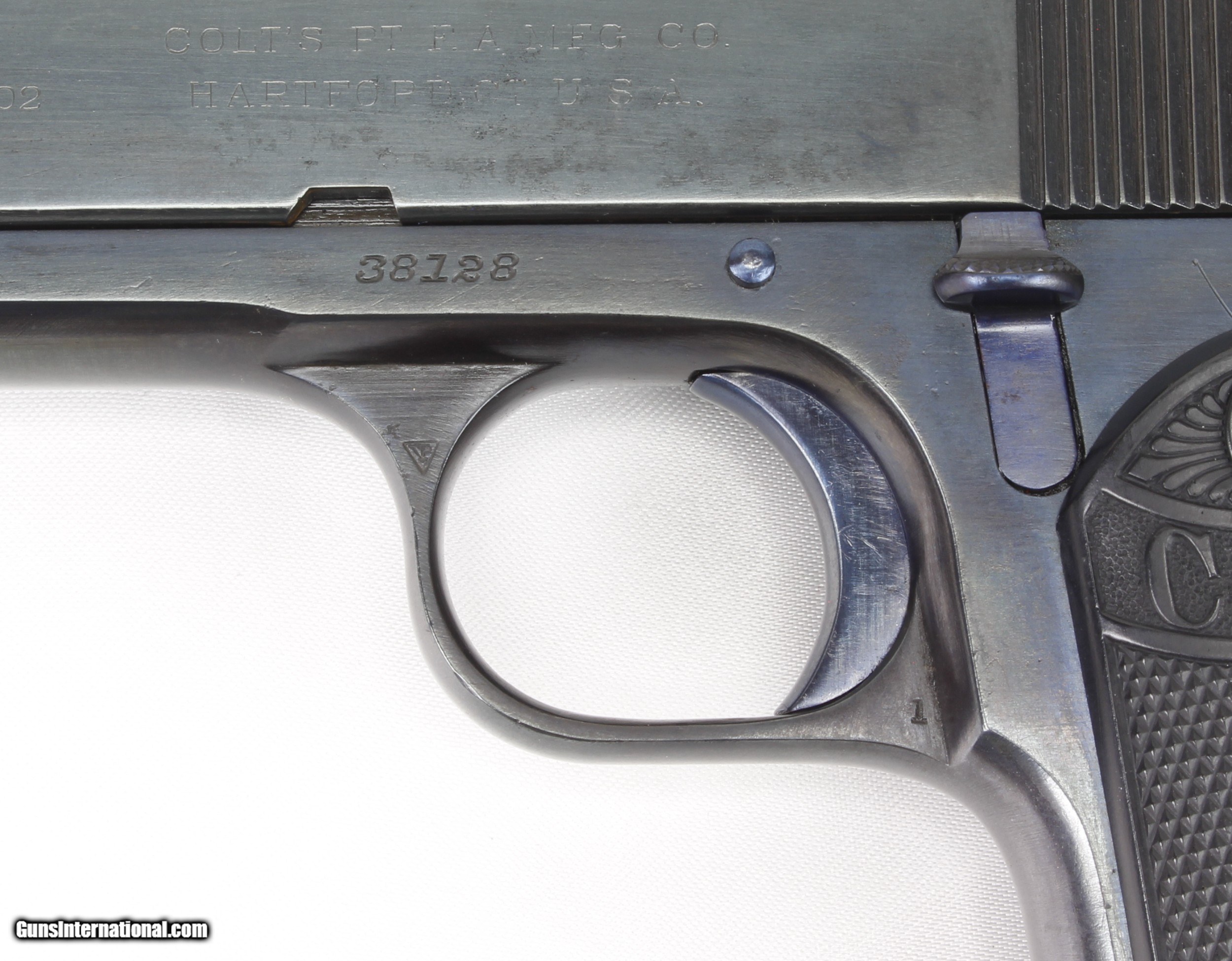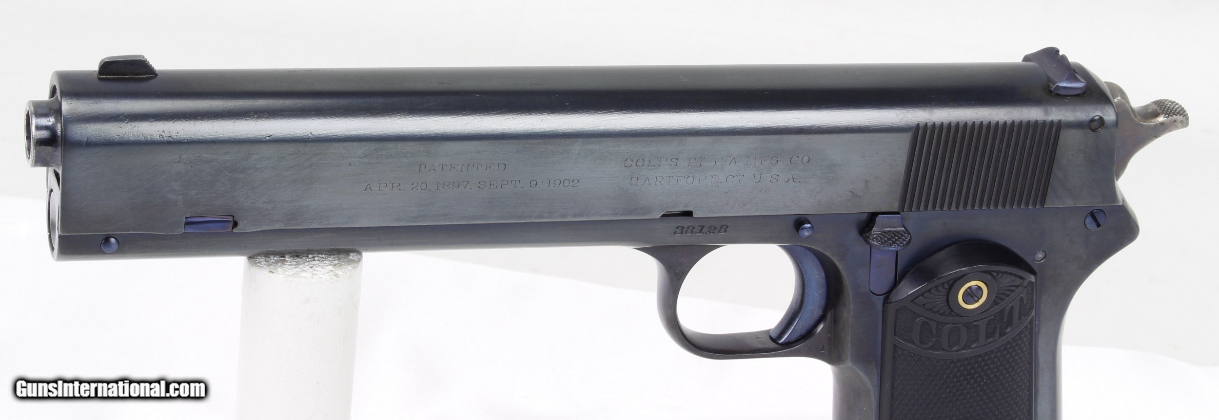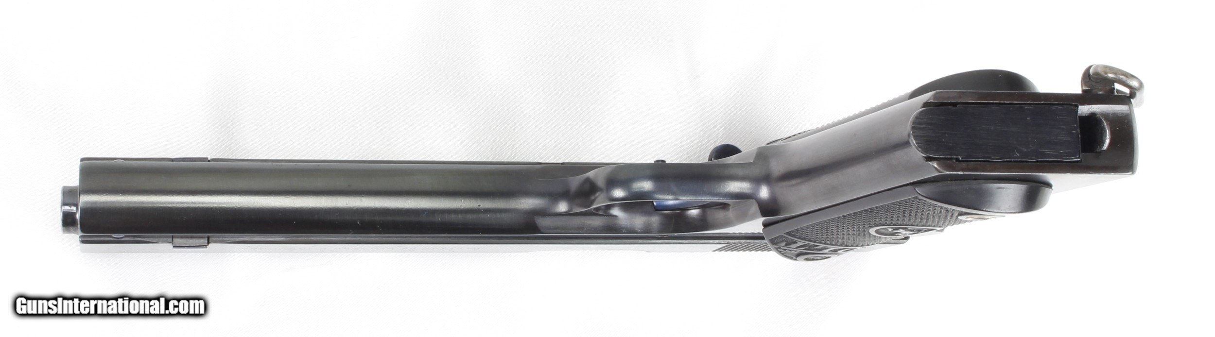 Description: Colt 1902 Military Pistol in .38ACP. SN #38128. Mfg. in 1915. 6" barrel with a very good bore for the age of the gun. The blued metal has been re-finished. Checkered black hard rubber Colt grips are in excellent condition. Spur hammer. Original blade and notch sights. Lanyard swivel. Aftermarket magazine. Ships to Lower 48, W/ Insurance $45.00. SOLD Curio/Relic: Yes Manufacturer: Colt Model: 1902 Serial Number: 38128 Barrel Length: 6 Caliber Info: .38ACP Condition: VG Metal Condition: Re-finished Bore Condition: VG for Age Finish: Blue |