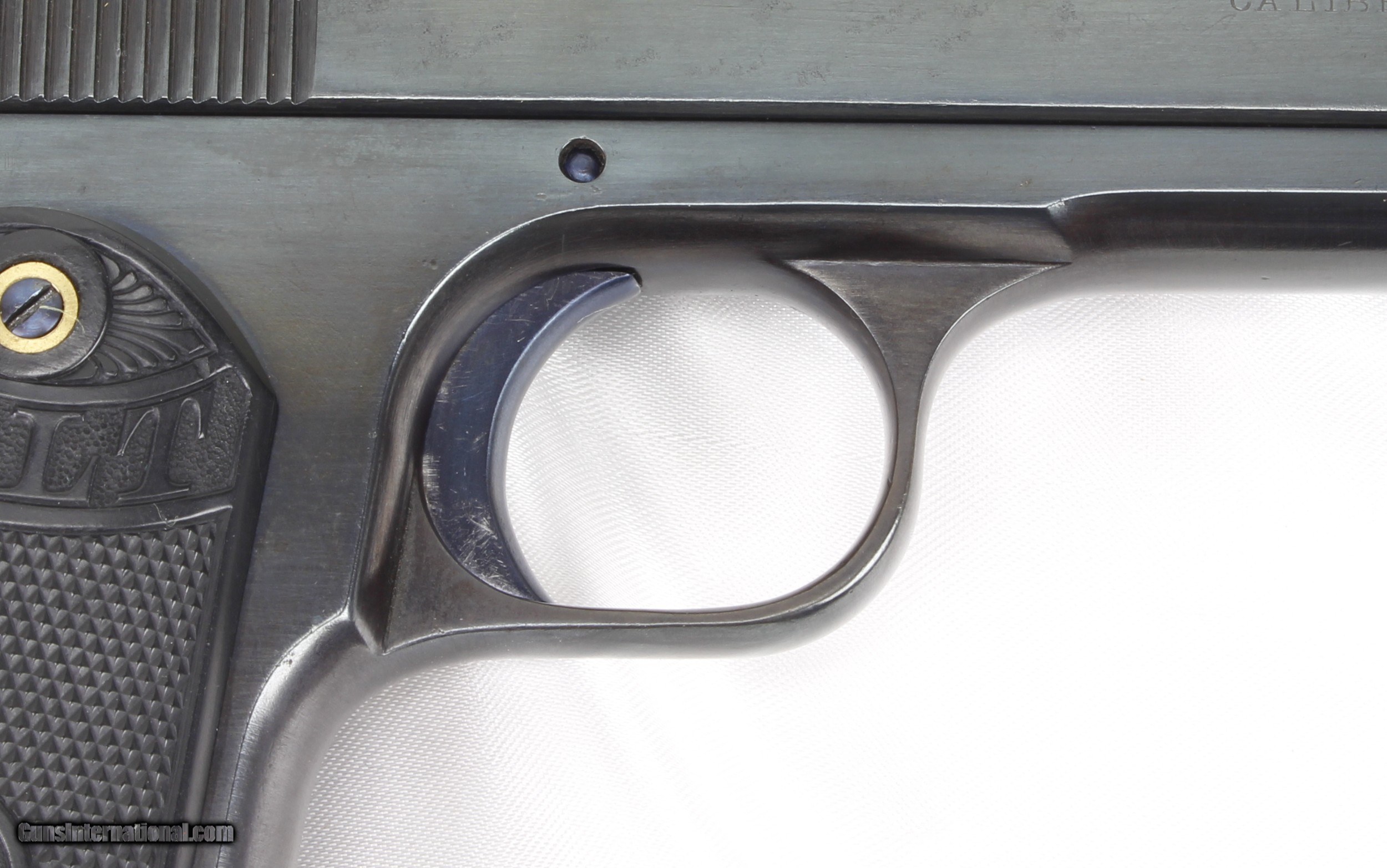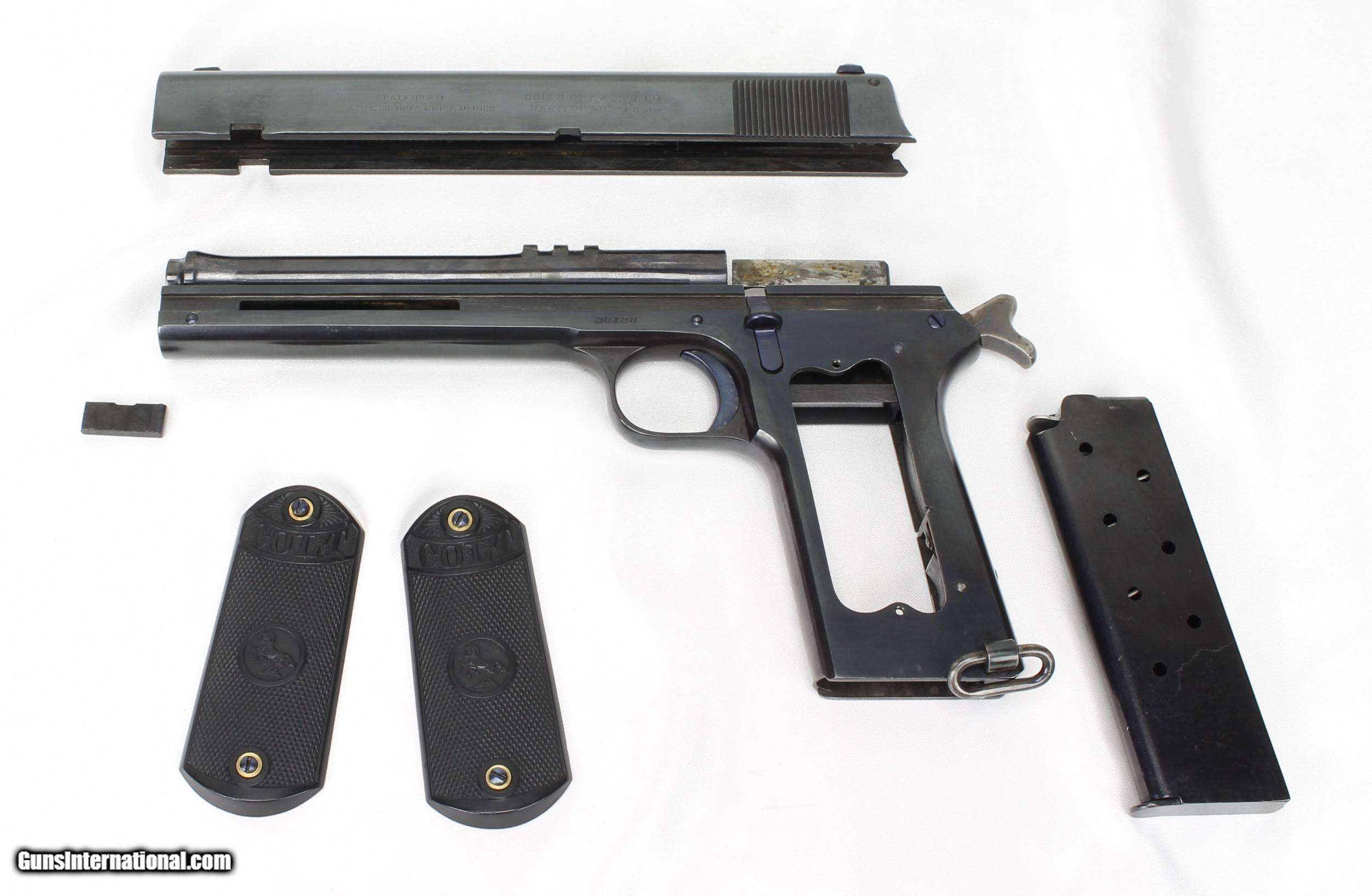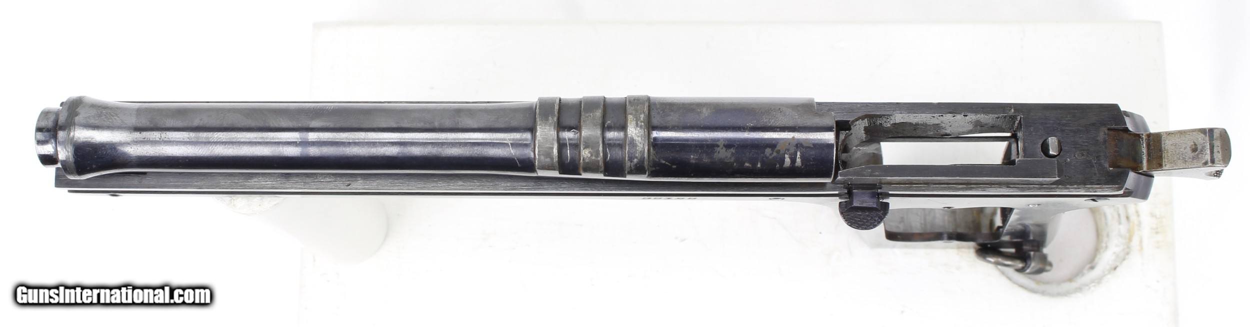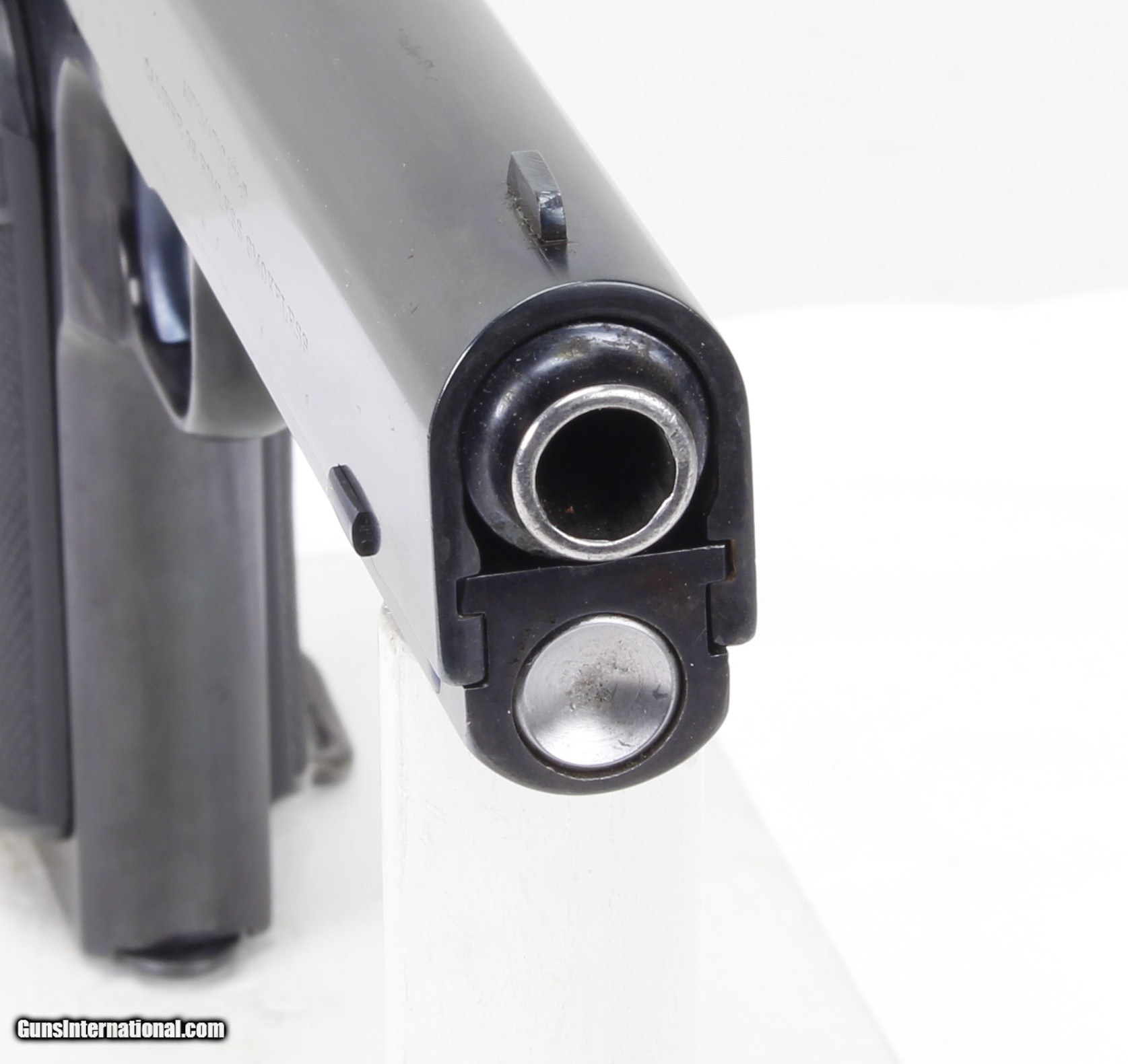 Description: Colt 1902 Military Pistol in .38ACP. SN #38128. Mfg. in 1915. 6" barrel with a very good bore for the age of the gun. The blued metal has been re-finished. Checkered black hard rubber Colt grips are in excellent condition. Spur hammer. Original blade and notch sights. Lanyard swivel. Aftermarket magazine. Ships to Lower 48, W/ Insurance $45.00. SOLD Curio/Relic: Yes Manufacturer: Colt Model: 1902 Serial Number: 38128 Barrel Length: 6 Caliber Info: .38ACP Condition: VG Metal Condition: Re-finished Bore Condition: VG for Age Finish: Blue |