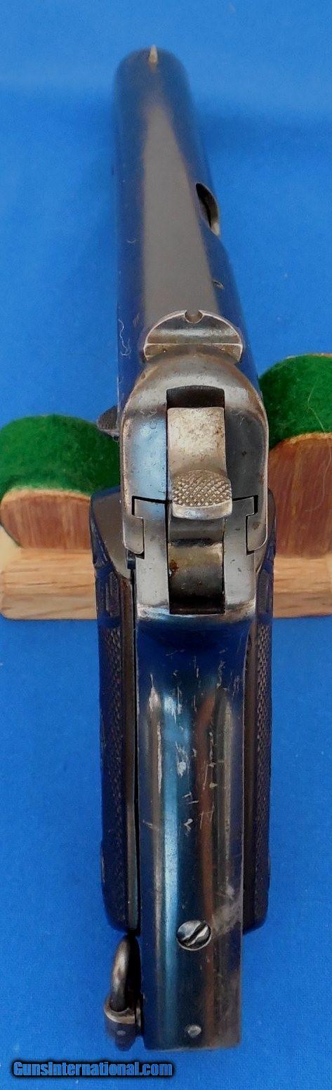 Description: SOLD Pending Funds / COLT 1902 Military Semi Auto Pistol, serial # 38989. manufactured 1916, cal. 38 rimless, with a 6" barrel and peppery pitted bore with good rifling. The pistol retains 85%+ original high polish blue with a bit of thinning on the front grip strap, a bit of fine peppery pitting at the front of the slide, a few light scratches nothing alarming and only mentioned for a honest description. The Colt checkered hard rubber grips show light handling and a small chip on right lower panel. Included is the original Colt marked “CAL. 38 / Colt” 8 round magazine. The overall condition as photographed and described is very good. Inv. : # 1-1364 SOLD Curio/Relic: Yes |